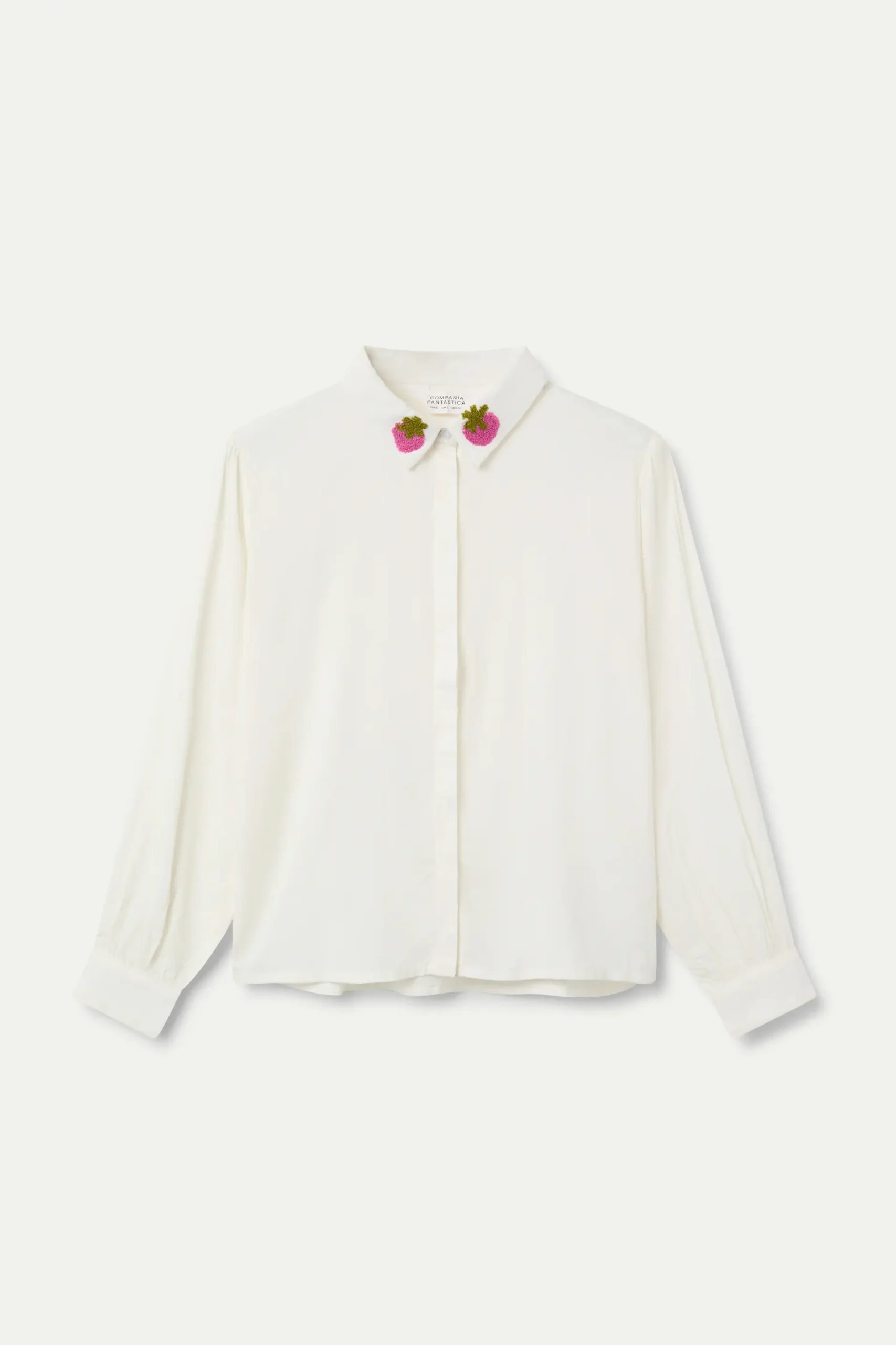 Camisa de color blanco con bordado de fresas. Cuello con solapa y manga larga terminada en puño con botón. Cierre frontal oculto con botones. La modelo mide 174 cm y lleva la talla S.