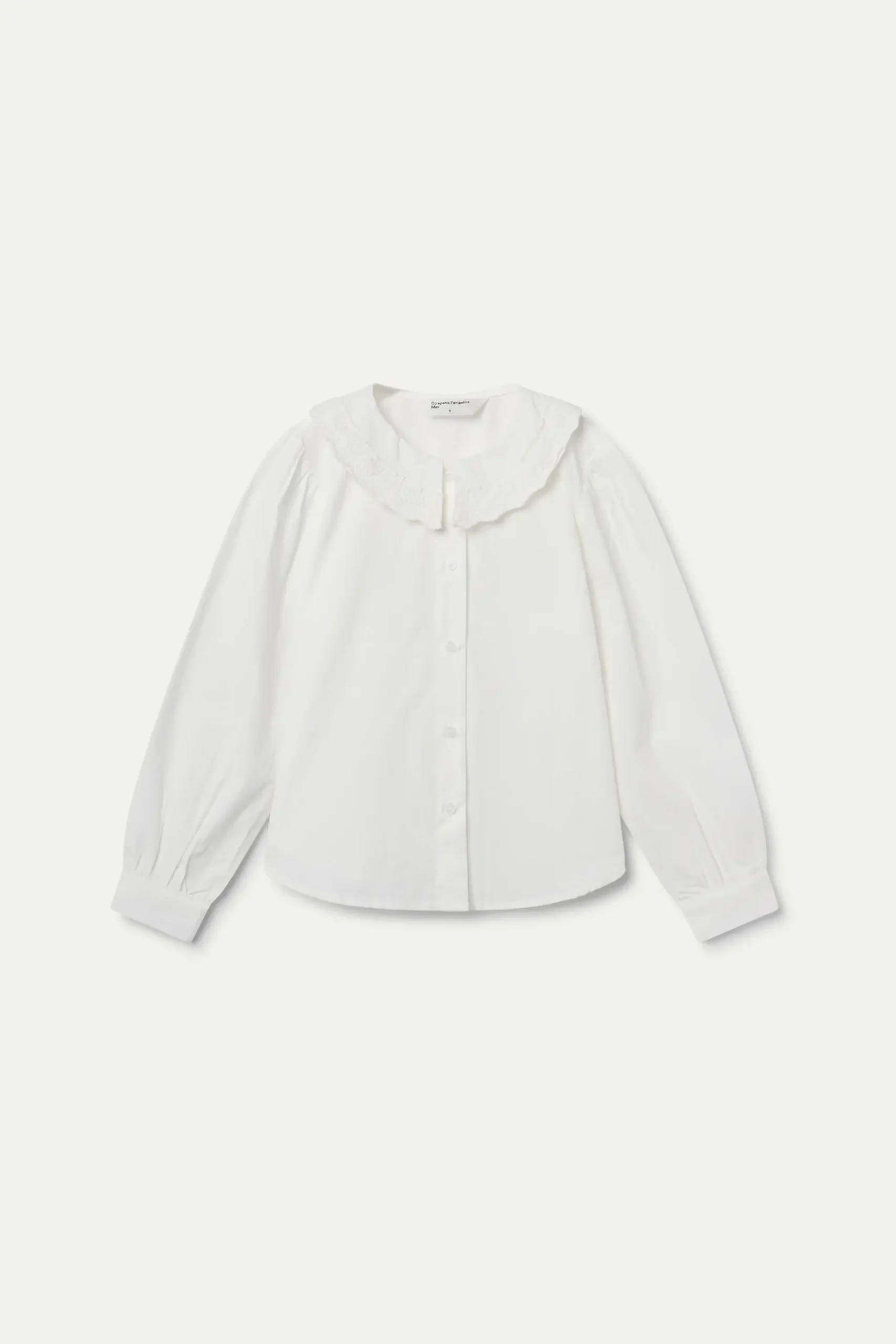 Camisa de color blanco. Cuello redondo separado en dos piezas al frente con bordado de encaje. Manga larga ligeramente abullonada terminada en puño con botón. Cierre frontal con botones de color blanco.