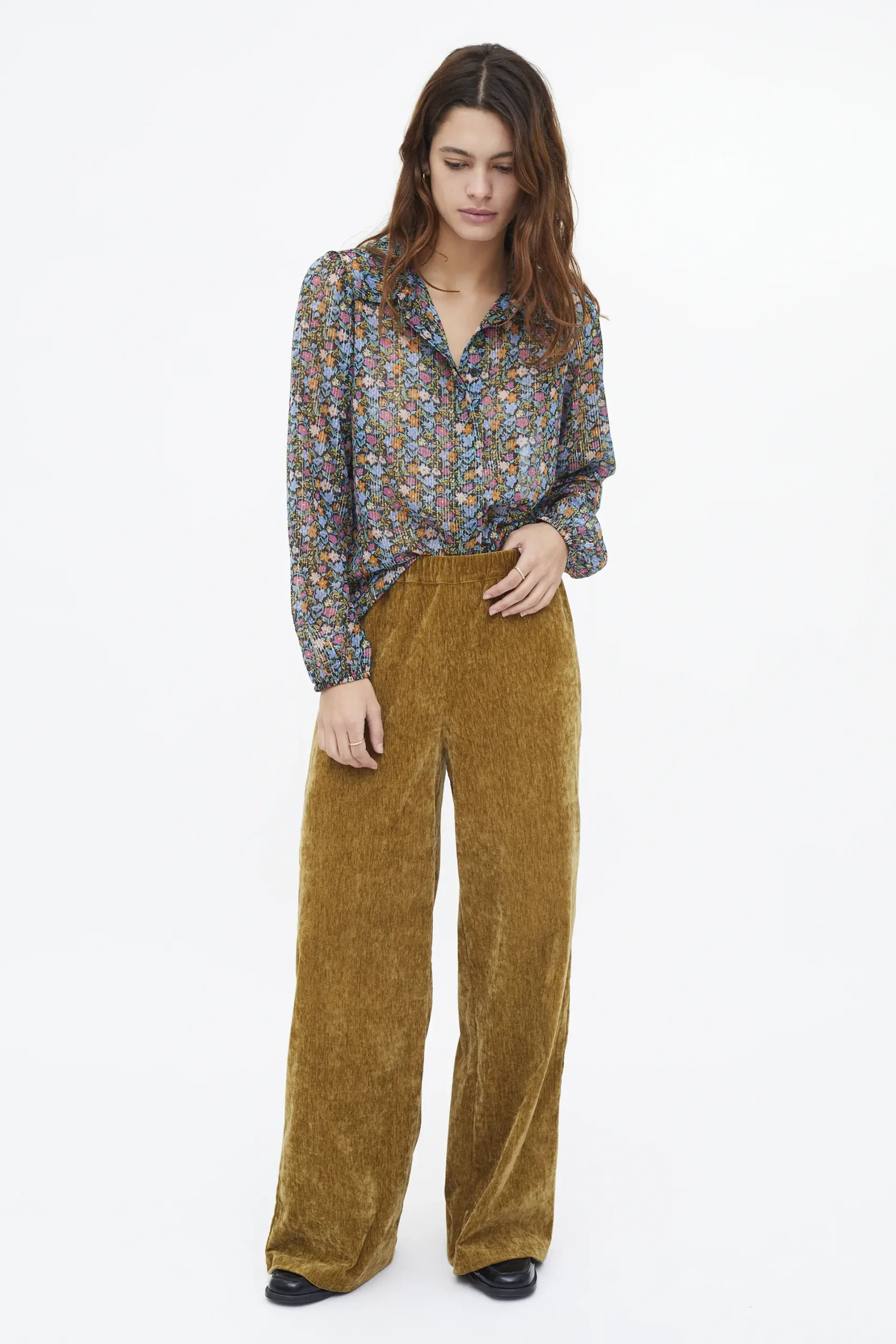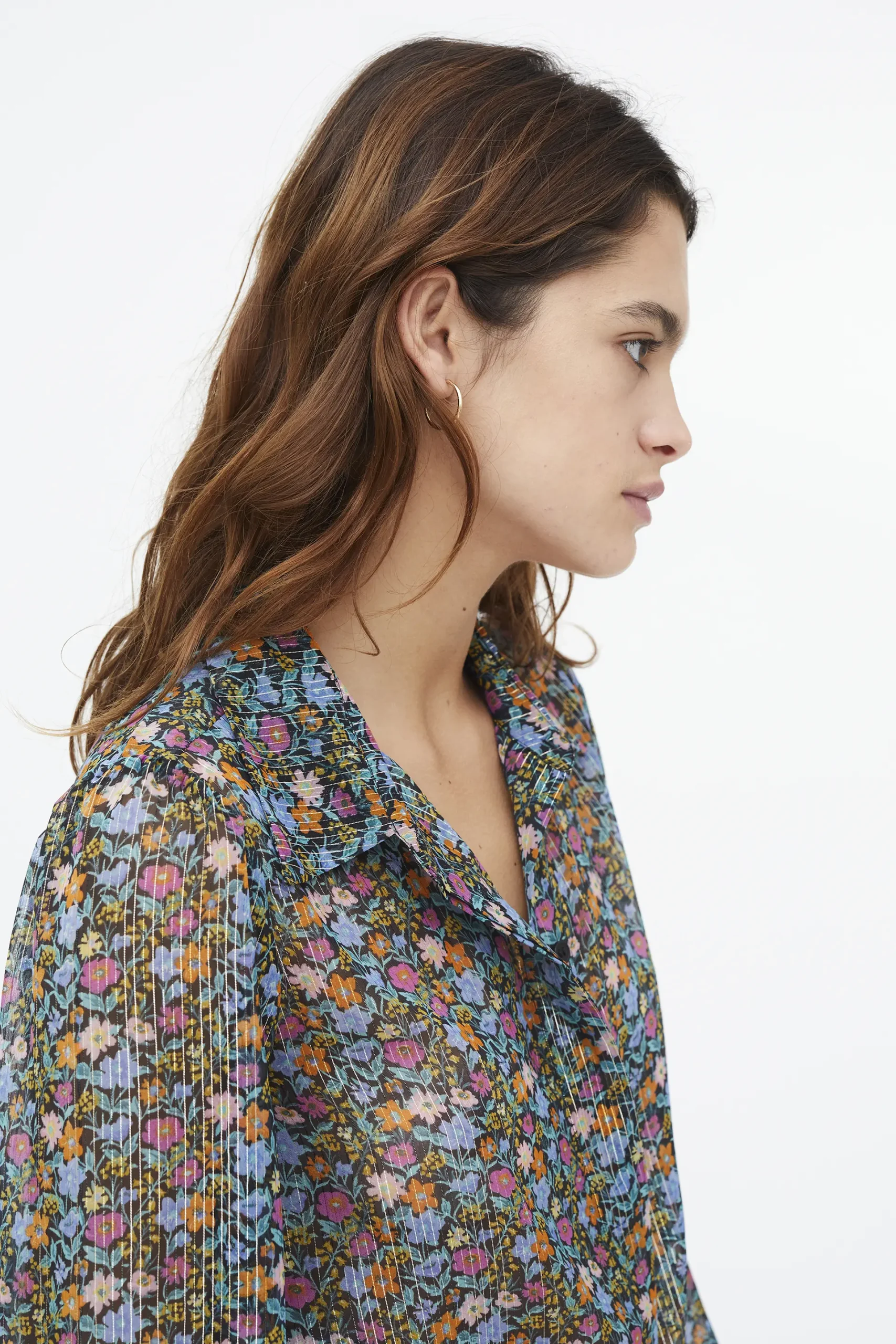 Camisa de tejido lurex crepé con estampado Flowers Lurex. Cuello con solapa y manga larga terminada en puño elástico. Cierre frontal con botones ocultos. La modelo mide 174 cm y lleva la talla S.