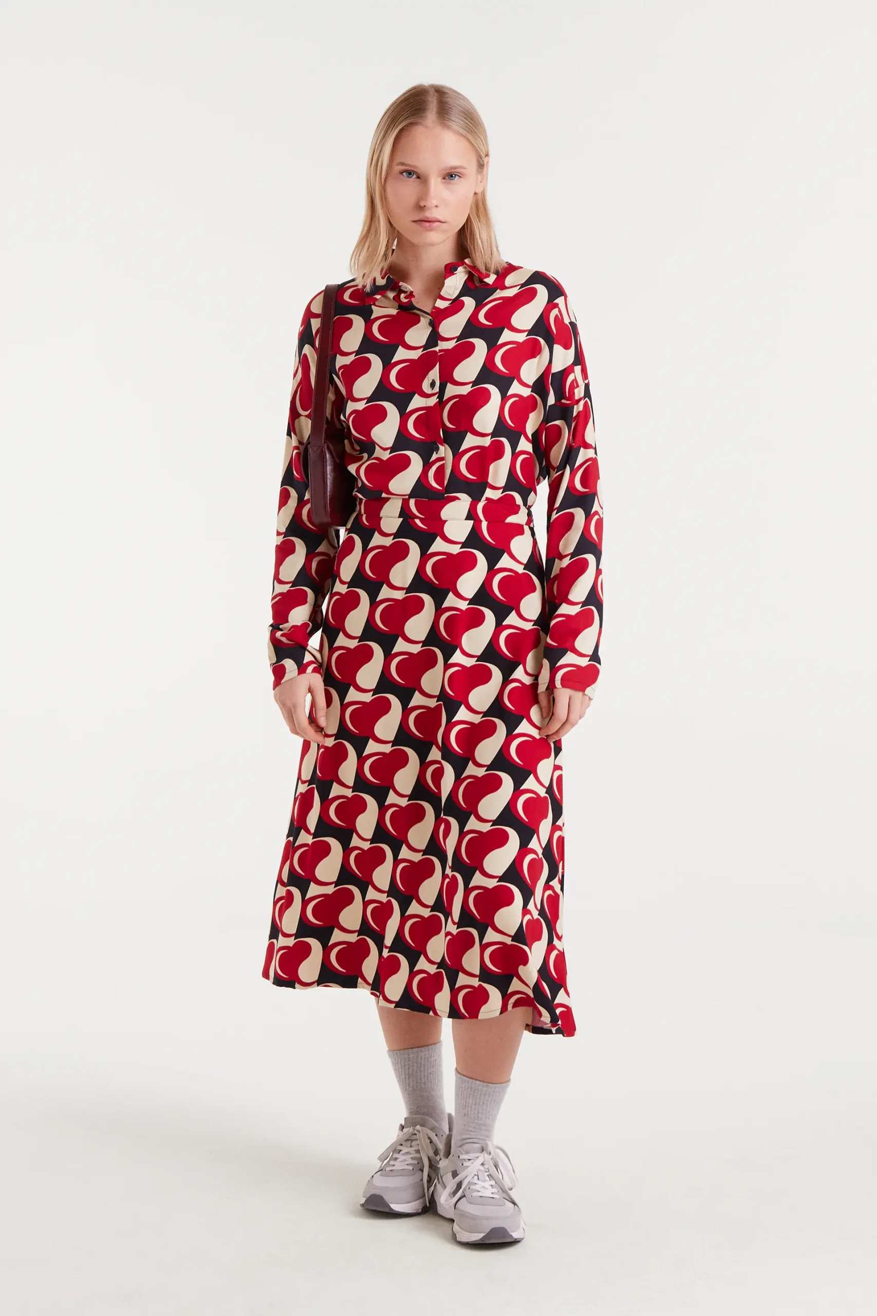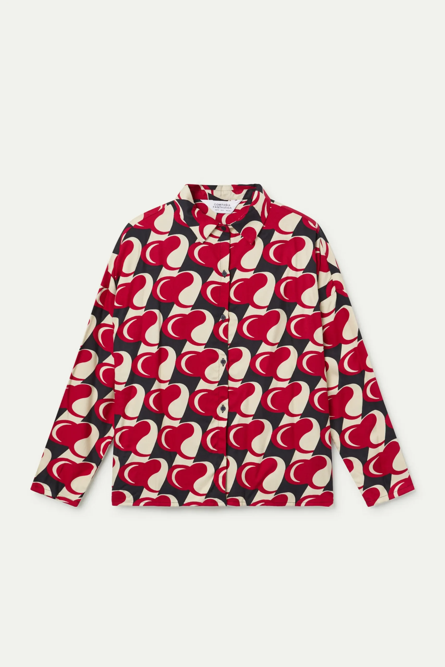Camisa con tejido viscosa twill con estampado Heart Attack. Cuello con solapa y manga larga.Cierre frontal con botones. Hombro ligeramente caído. La modelo mide 174 cm y lleva la talla S.
