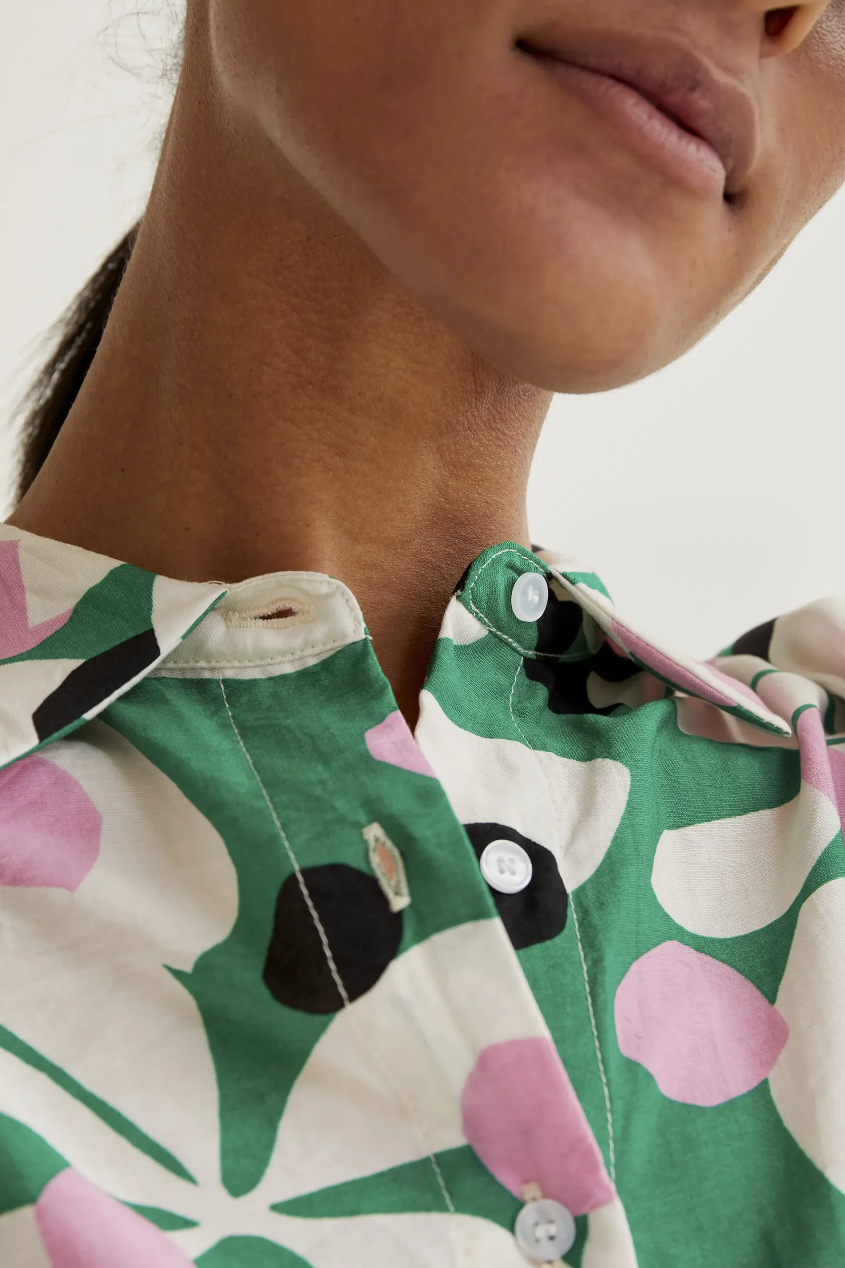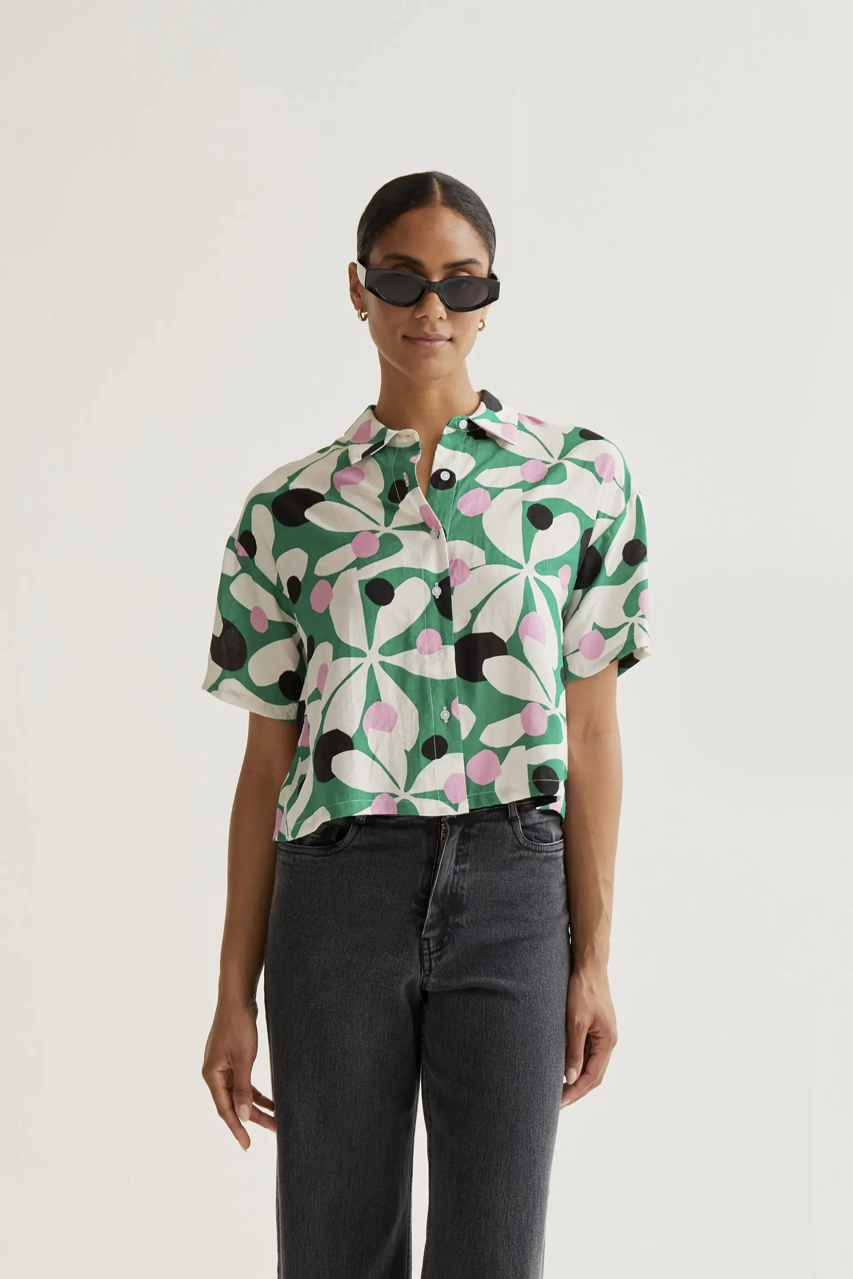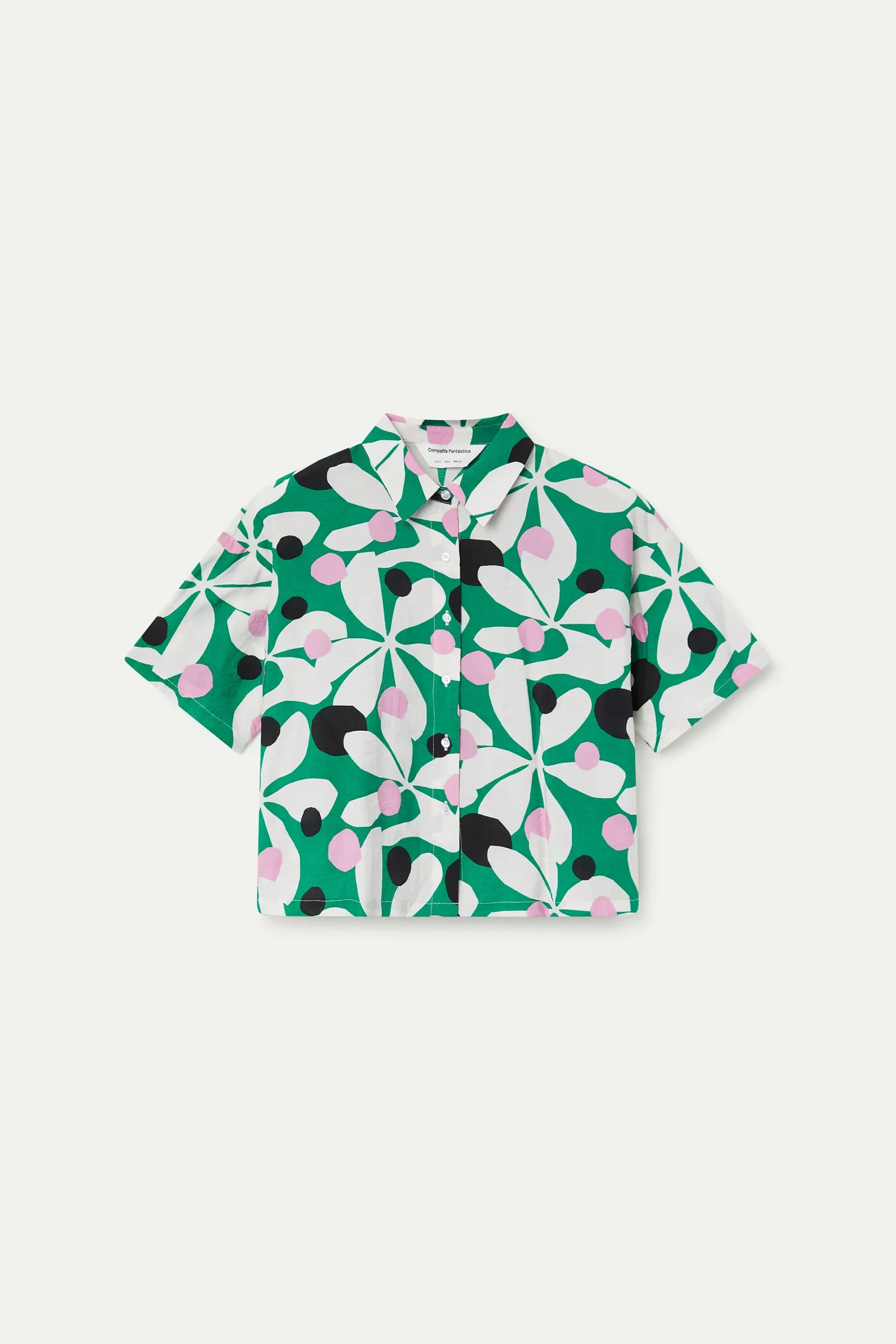 Camisa de tejido crepé ligero con estampado hosta. Cuello con solapa y manga corta. Hombro ligeramente caído. Cierre frontal con botones blancos. La modelo mide 173 cm y lleva la talla S.