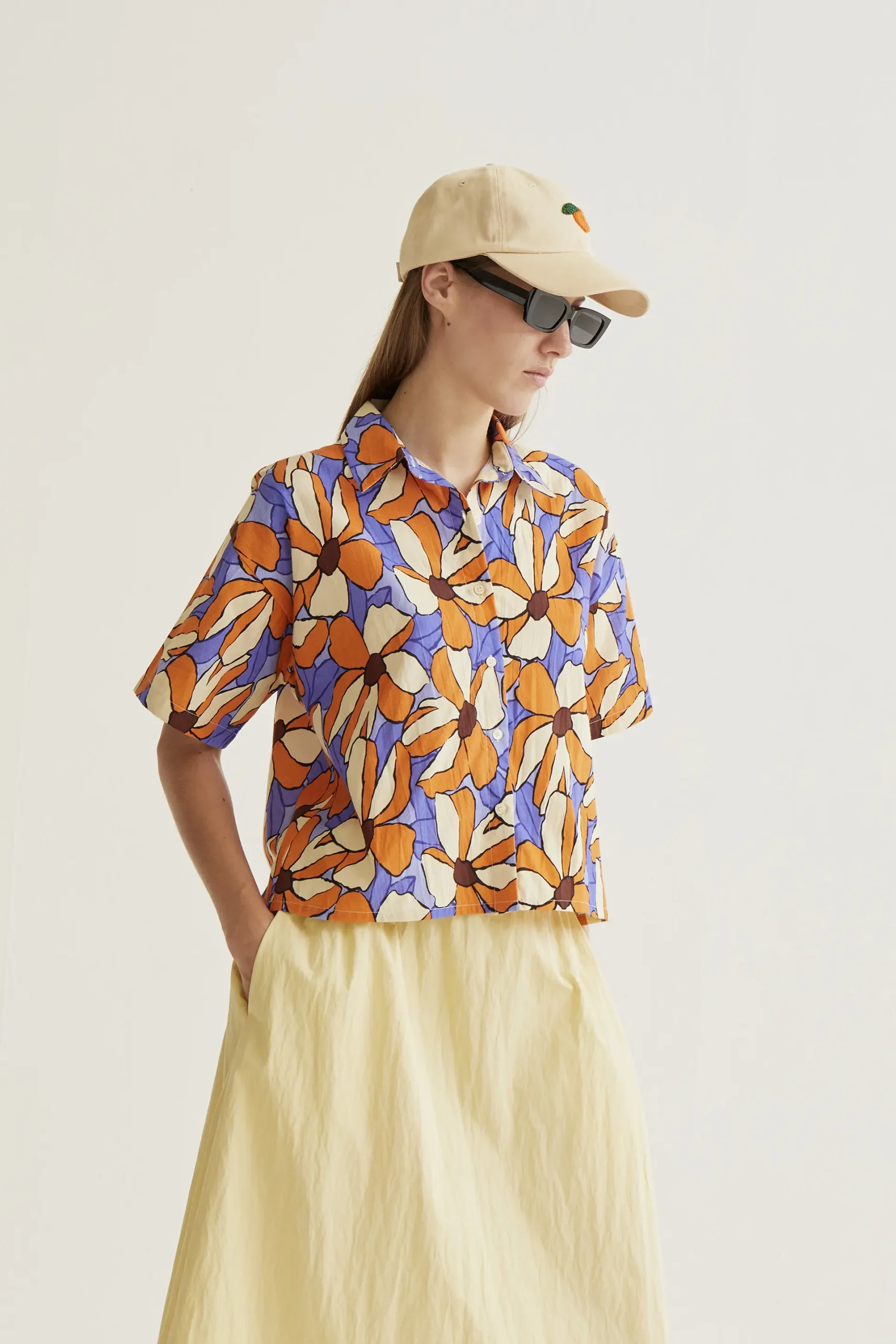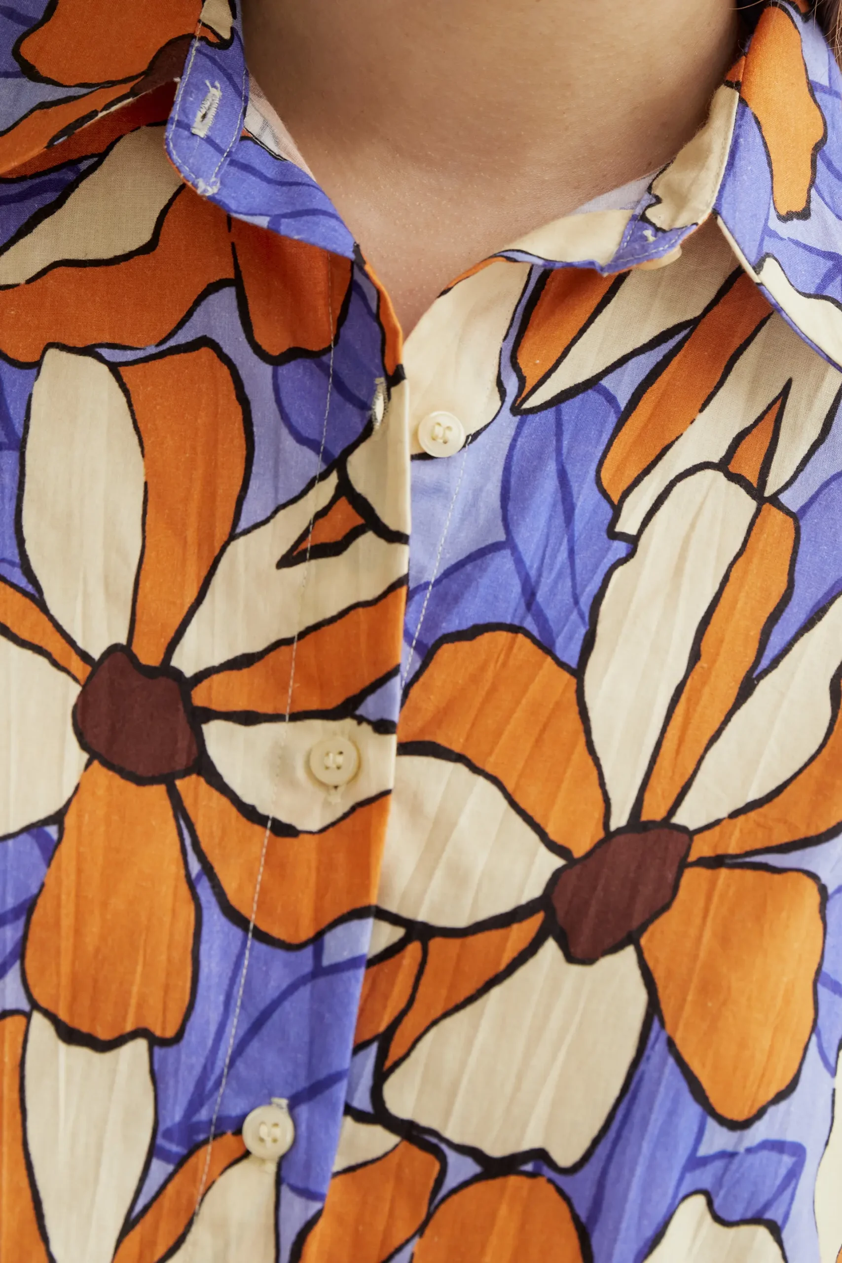 Camisa de tejido 100% algodón con estampado marigold. Cuello solapa y manga 3/4. Hombro caído. Cierre frontal con botones. La modelo mide 177 cm y lleva la talla S.