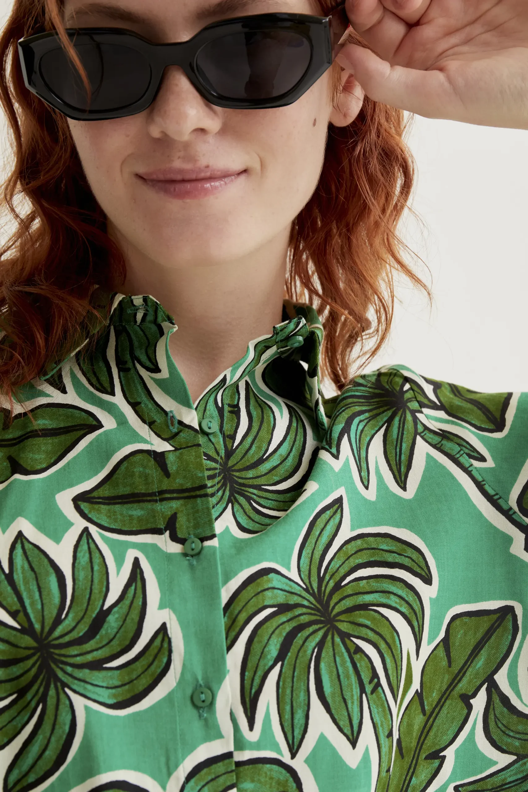 Camisa con estampado palm tree. Cuello con solapa y manga corta. Cierre frontal con botones de color verde. La modelo mide 175 cm y lleva la talla S.