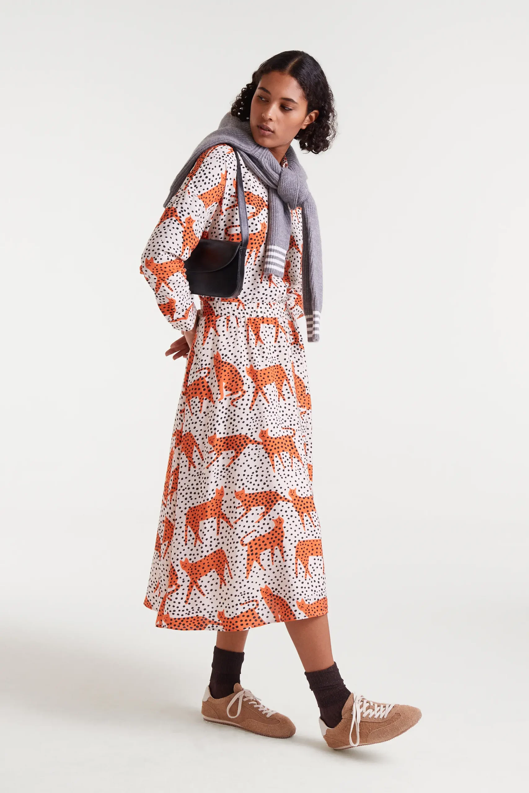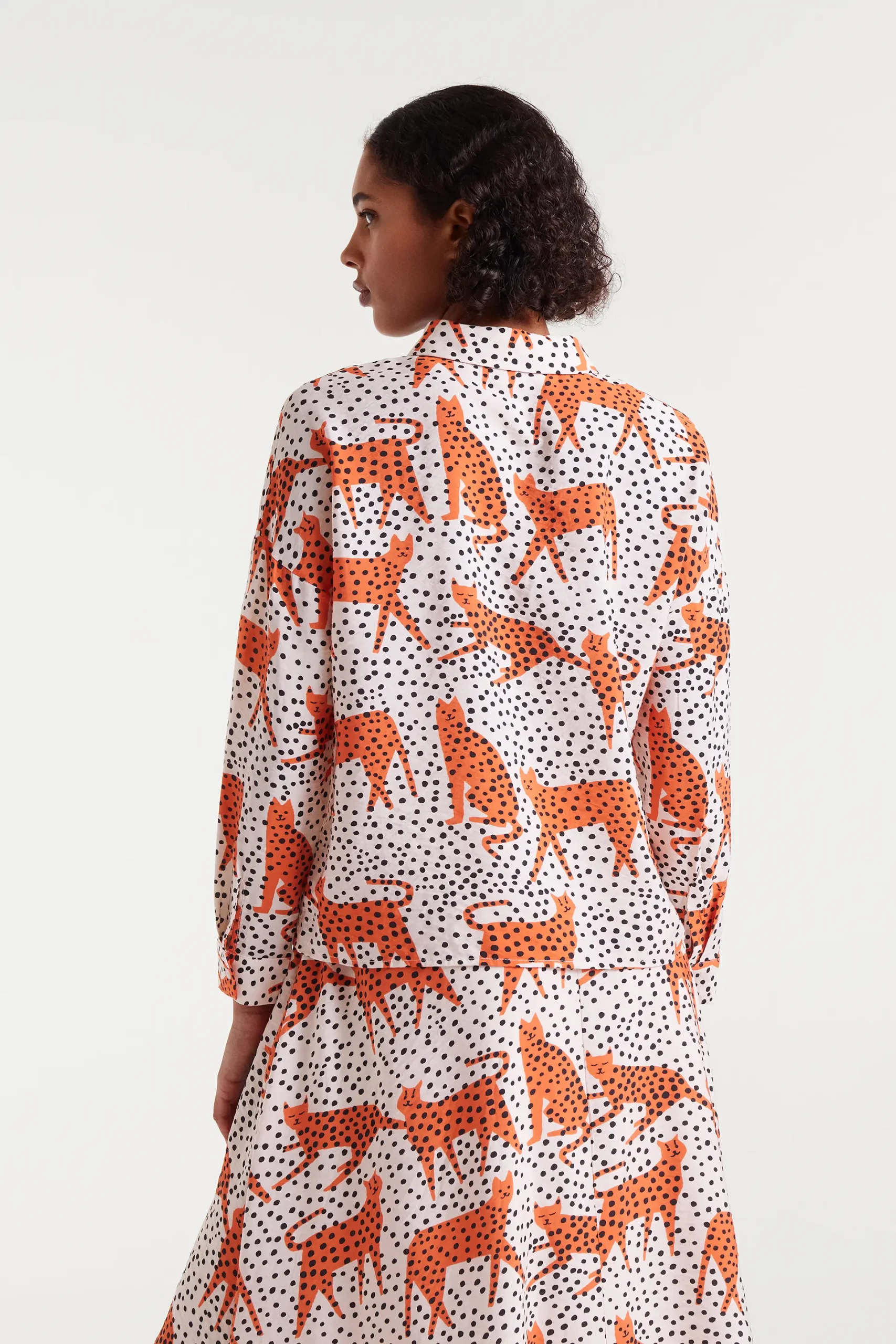 Camisa de tejido crepé ligero con estampado Tano. Cuello con solapa y manga larga terminada en puño con botón. Cierre frontal con botones. La modelo mide 175 cm y lleva la talla S.