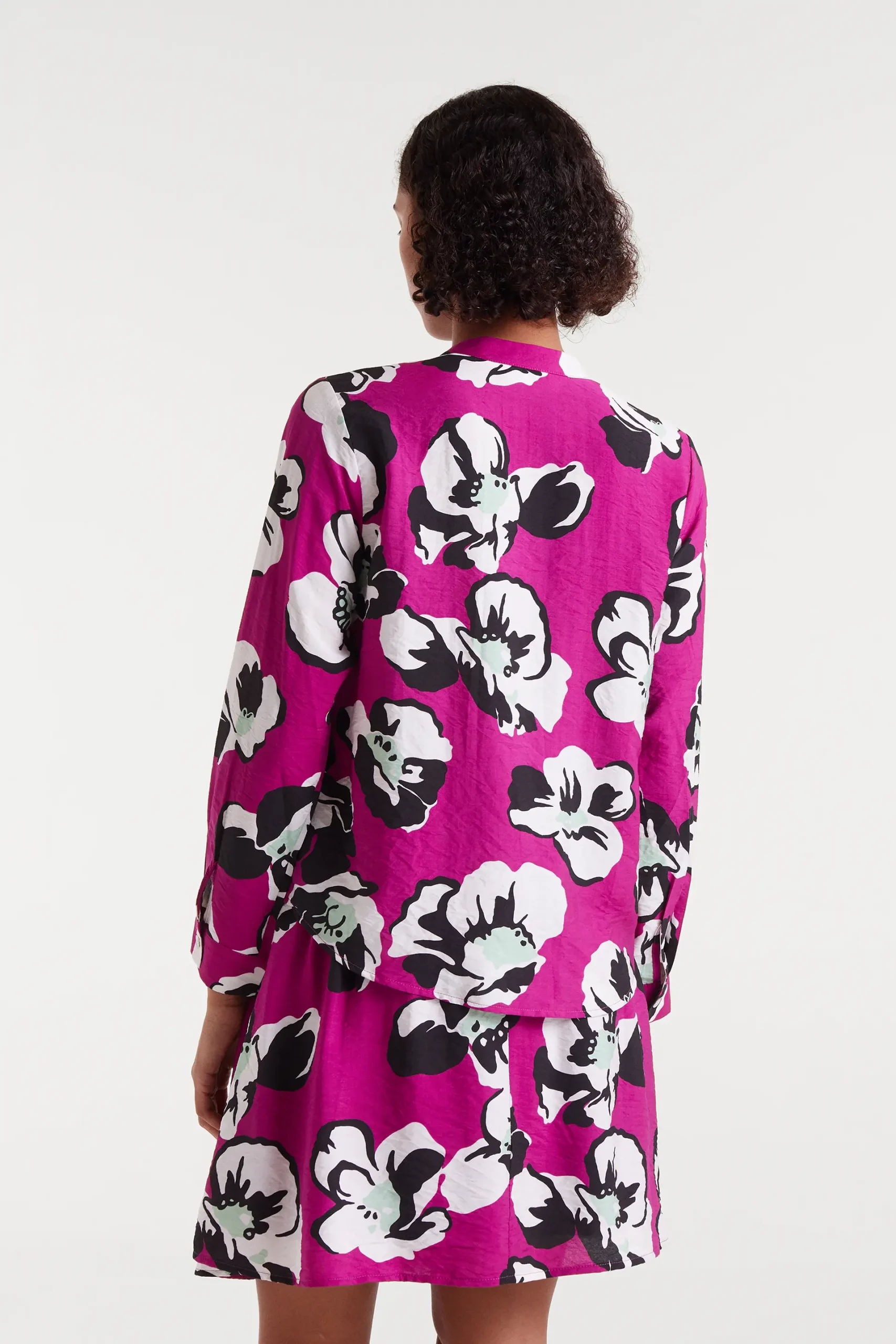 Camisa de tejido crepé ligero con estampado Vivid Viola. Cuello redondo con escote pico y manga larga terminada en puño con botón. Cierre frontal con botones. La modelo mide 175 cm y lleva la talla S.