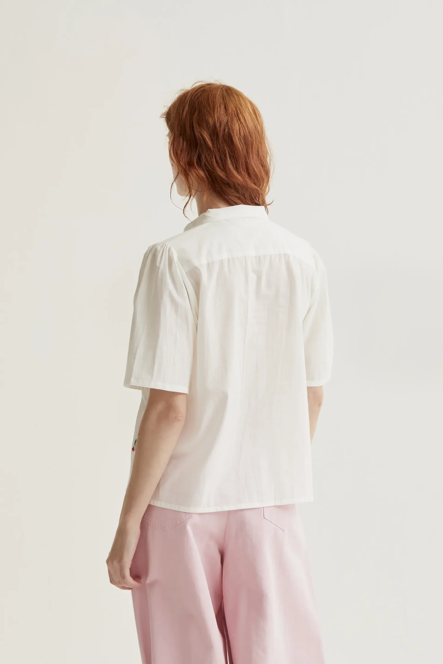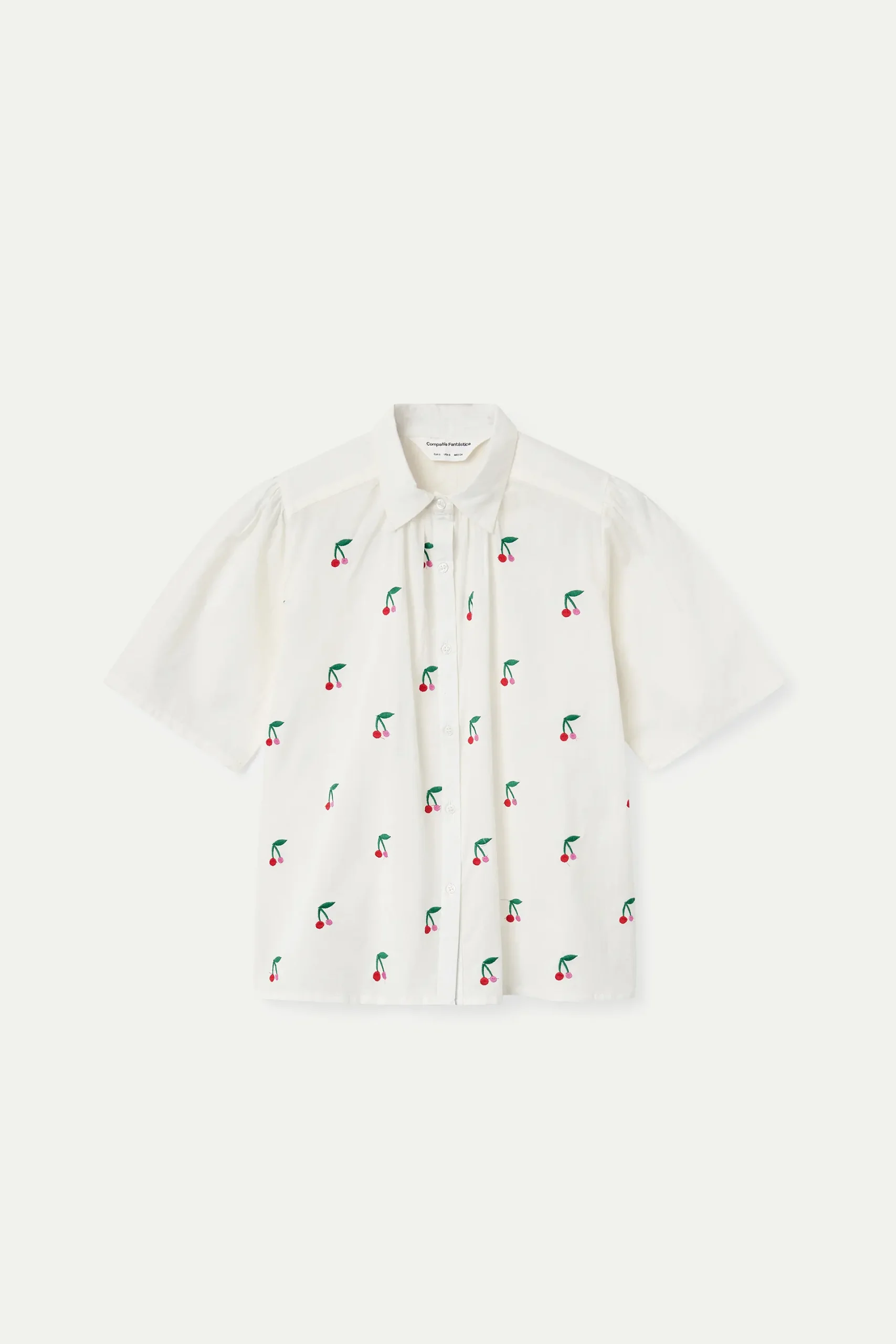 Camisa de tejido 100% algodón de color blanco con estampado white cherries. Cuello solapa y manga corta ligeramente abullonada. Cierre frontal con botones de color blanco. La modelo mide 175 cm y lleva la talla S.