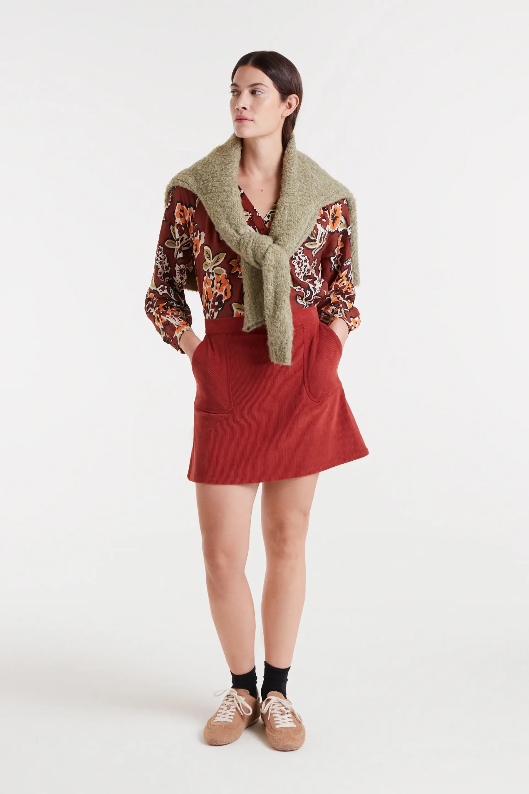 Camisa de crepé ligero con estampado Daisy. Cuello pico y manga larga con abertura elástica. Cierre frontal con botones de color marrón. La modelo mide 177 cm y lleva la talla S.