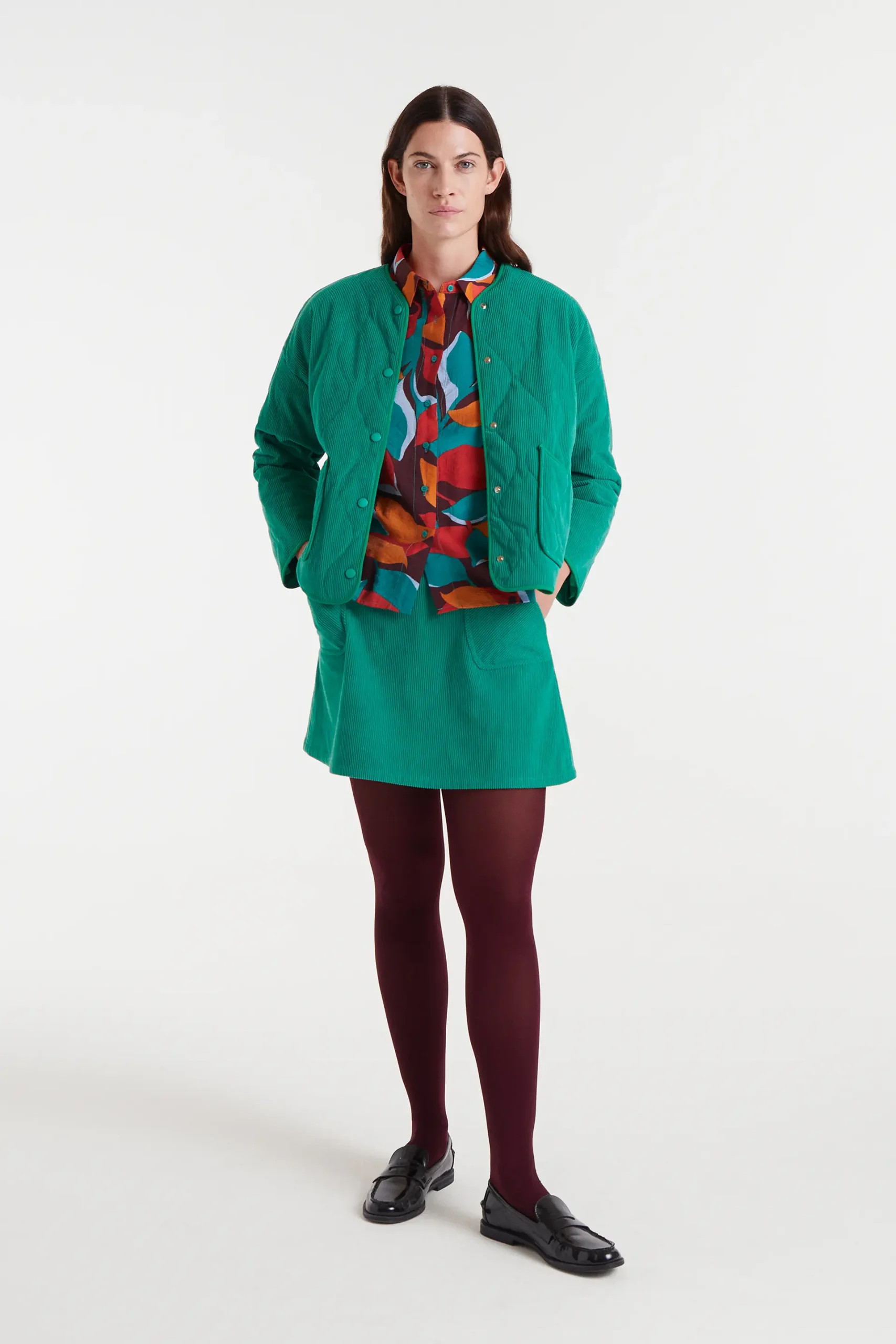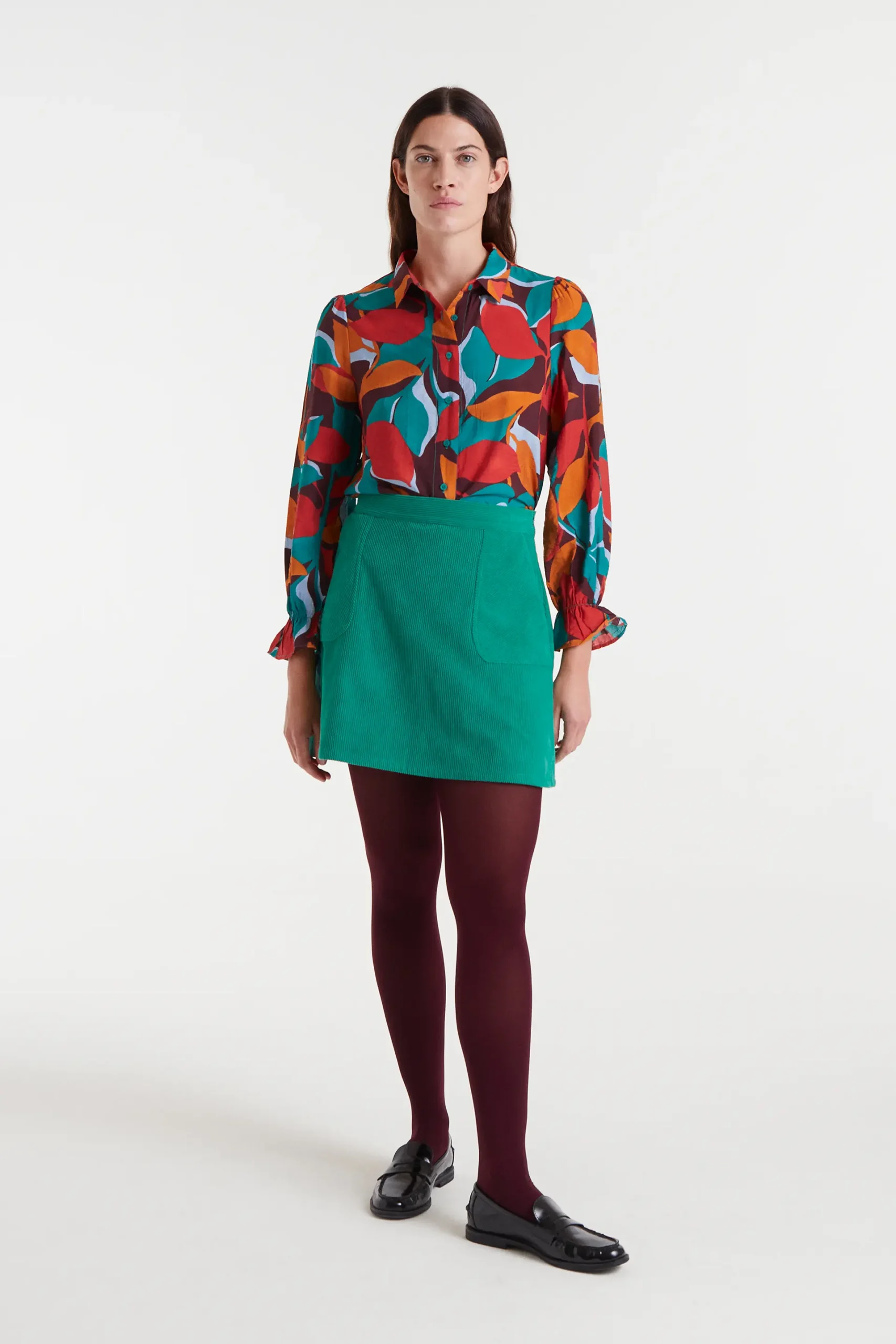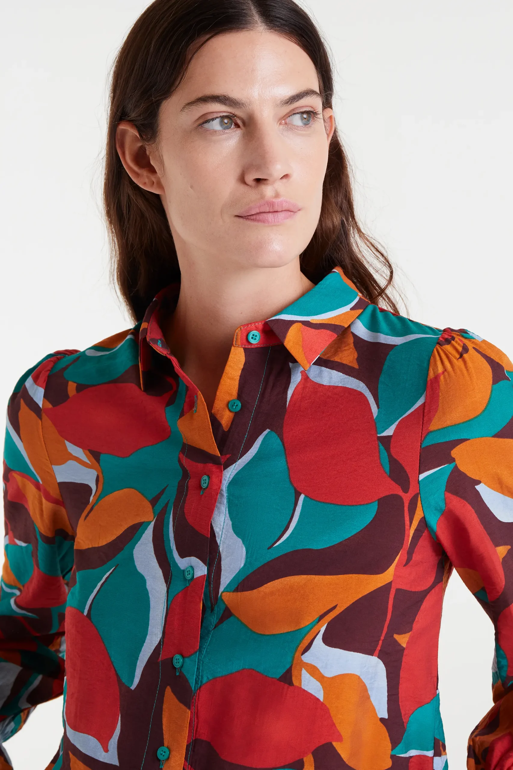 Camisa de tejido crepé ligero con estampado Ponziana. Cuello solapa con manga larga y puño elástico con volante. Cierre frontal con botones verde. La modelo mide 177 cm y lleva la talla S.