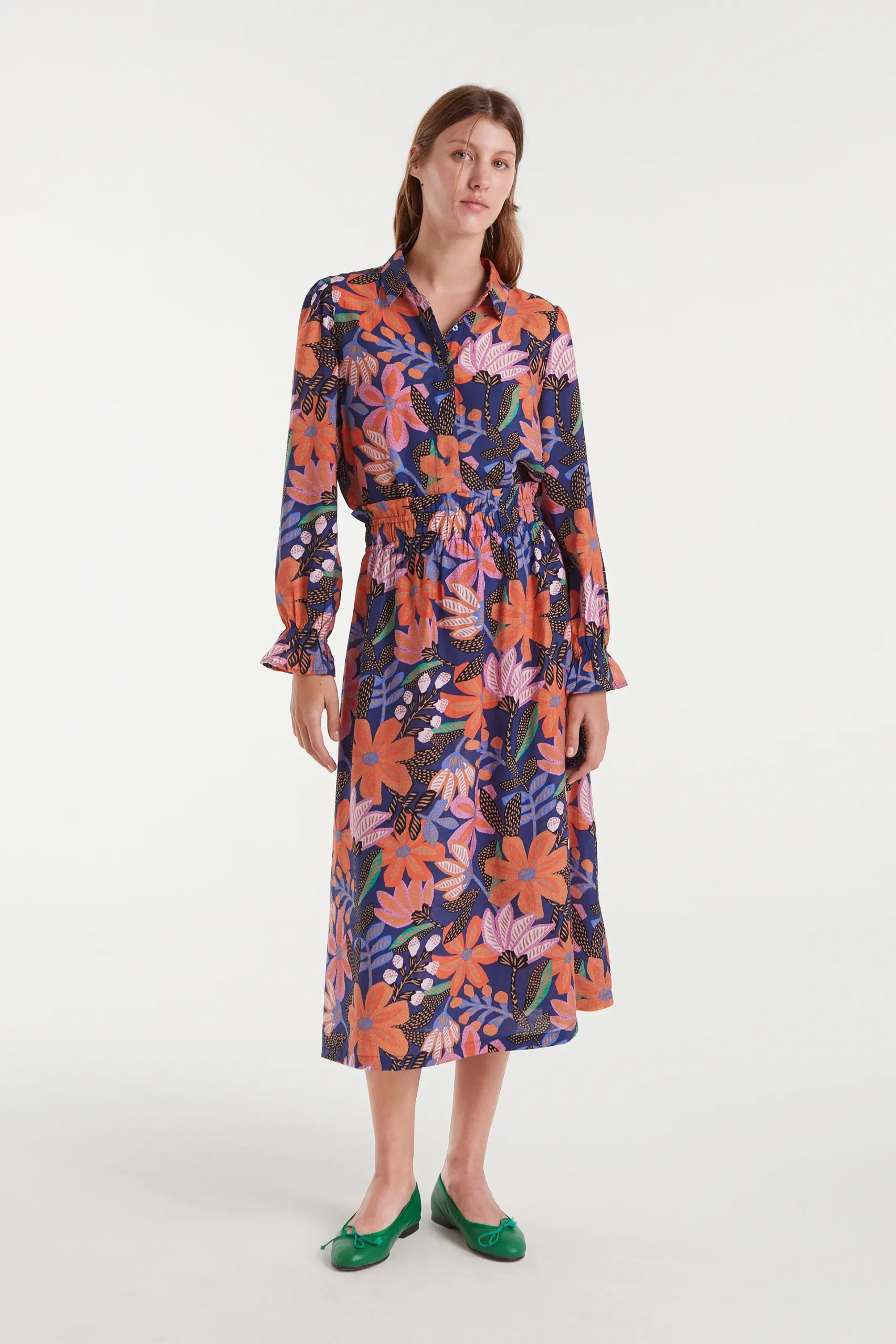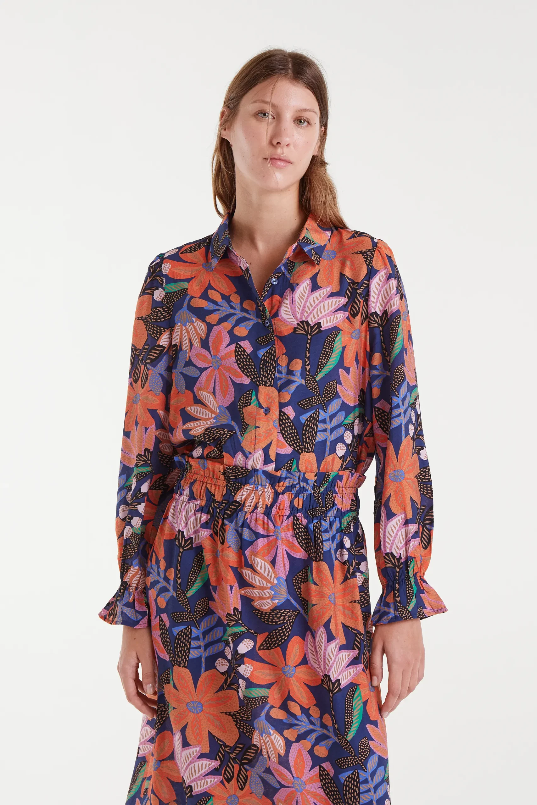 Camisa de tejido crepé ligero con estampado Tigerlily. Cuello solapa con manga larga y puño elástico con volante.Cierre frontal con botones azules. La modelo mide 177 cm y lleva la talla S.