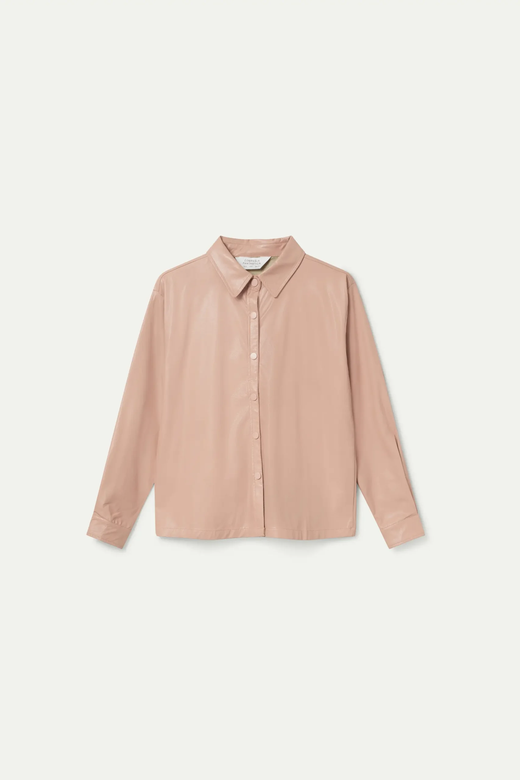 Camisa en tejido efecto piel de color rosa claro. Cuello solapa y manga larga terminada en puño con botón. Cierre frontal con botones de color rosa claro.