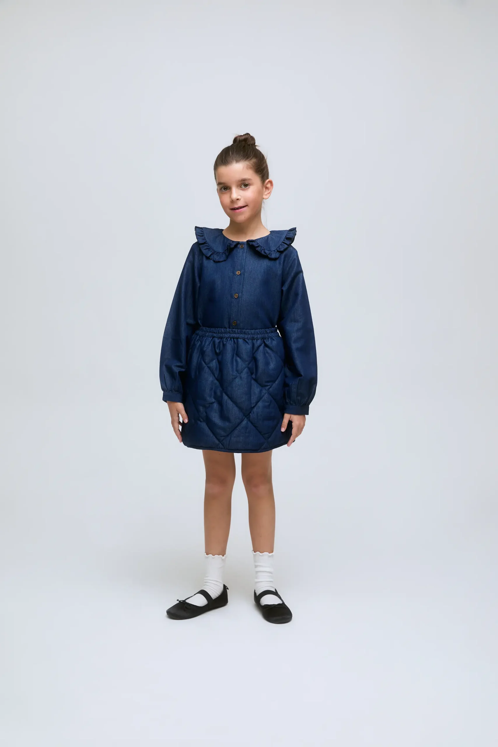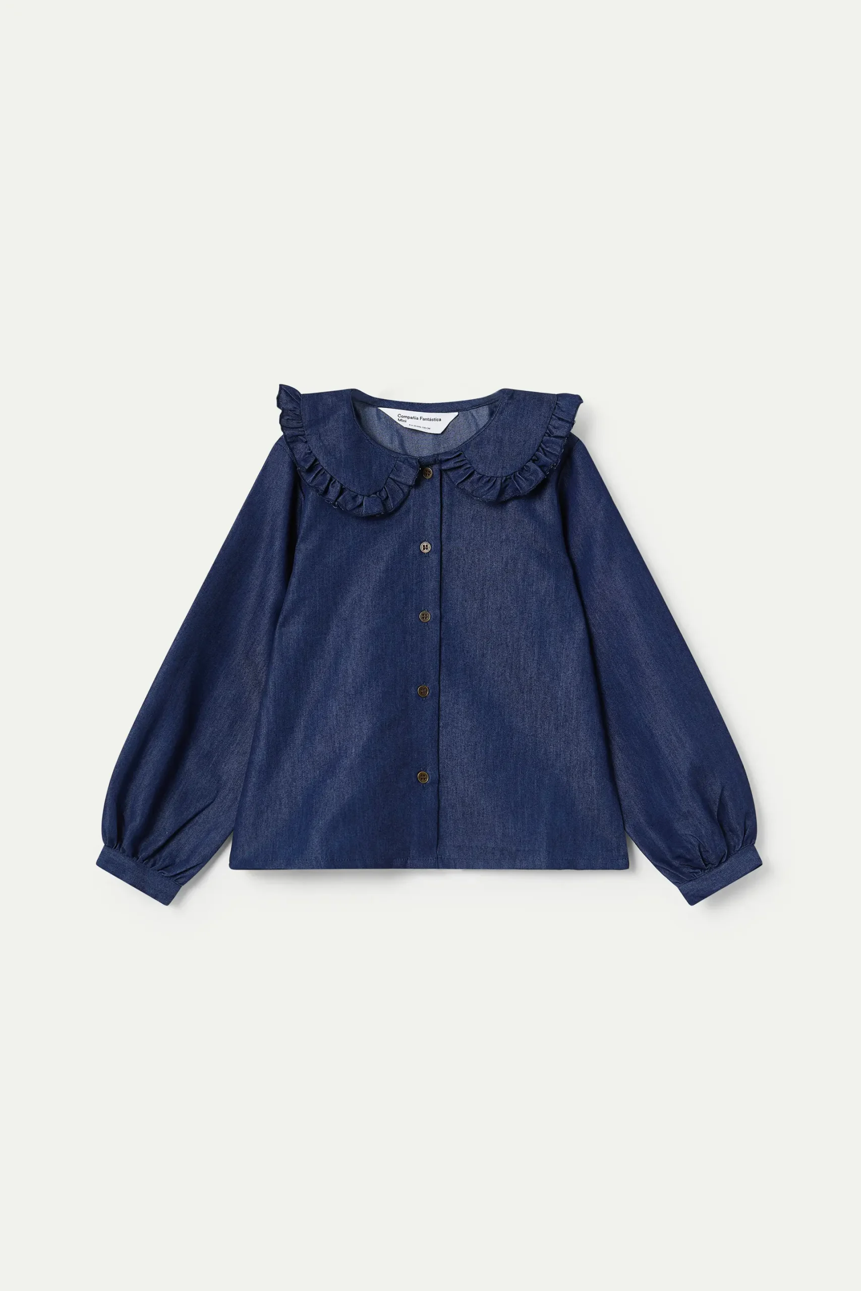 Camisa de niña confeccionada en algodón tipo chambray, de color azul efecto denim. Cuello redondo con volantes, cierre frontal con botones y mangas largas con puños fruncidos.