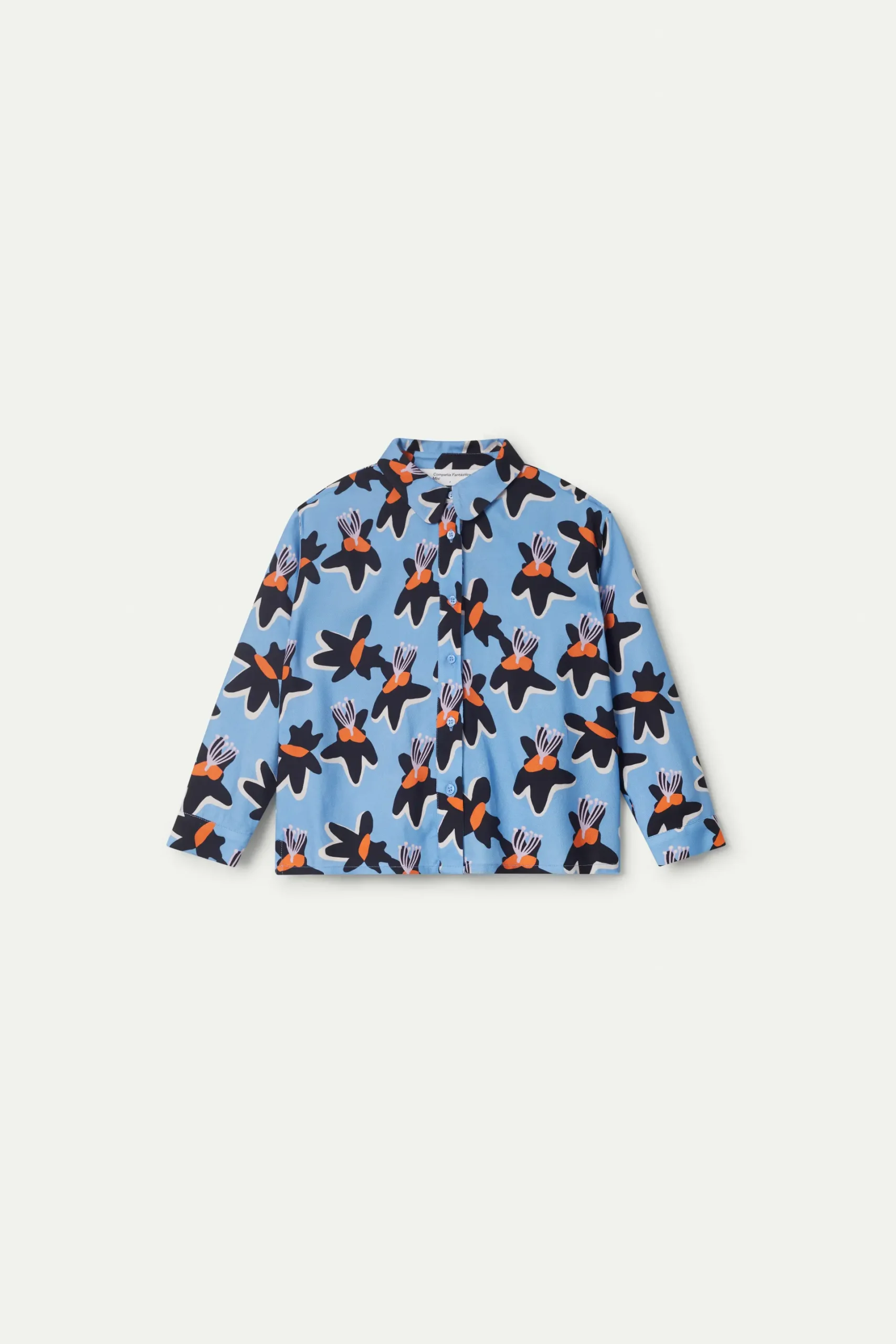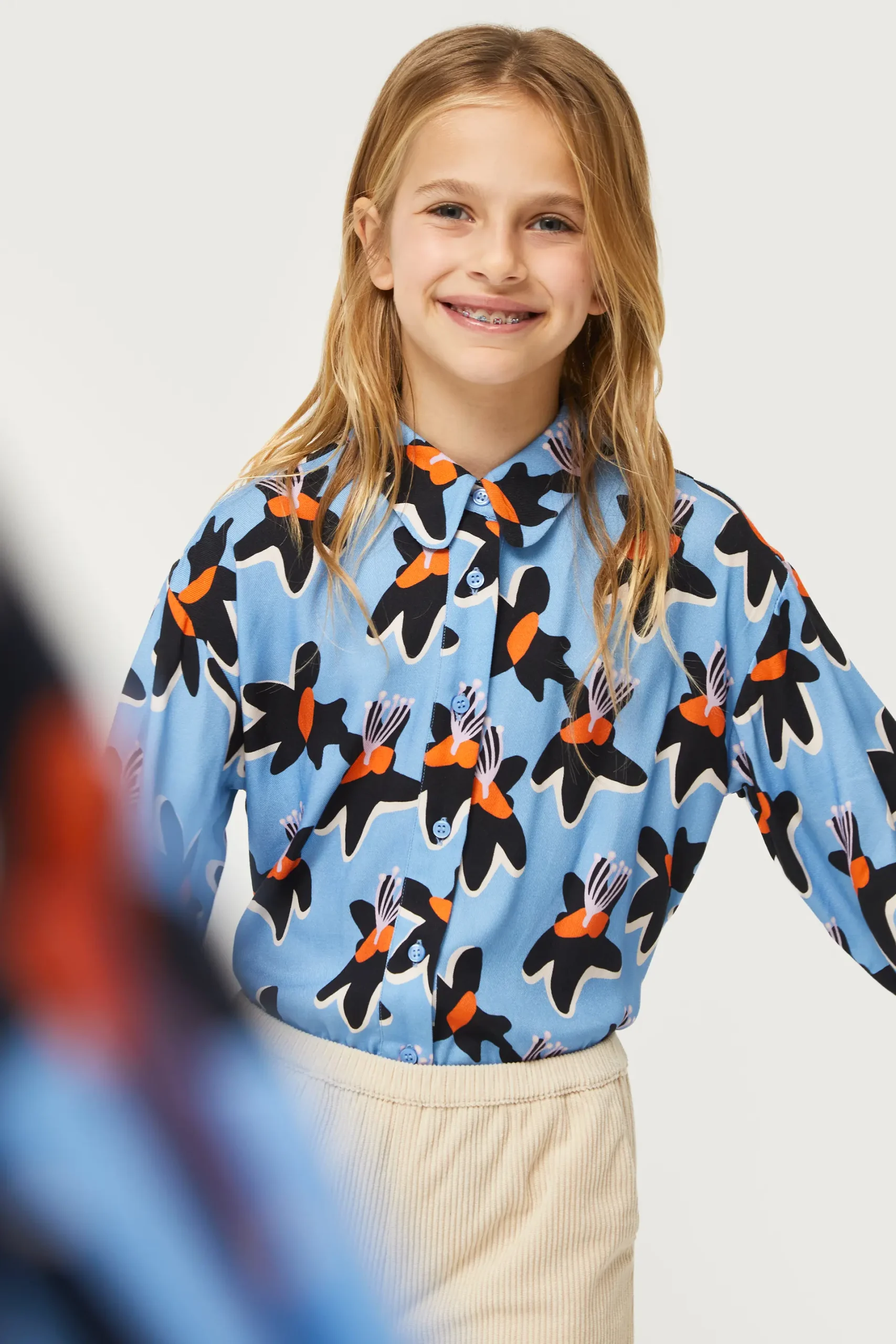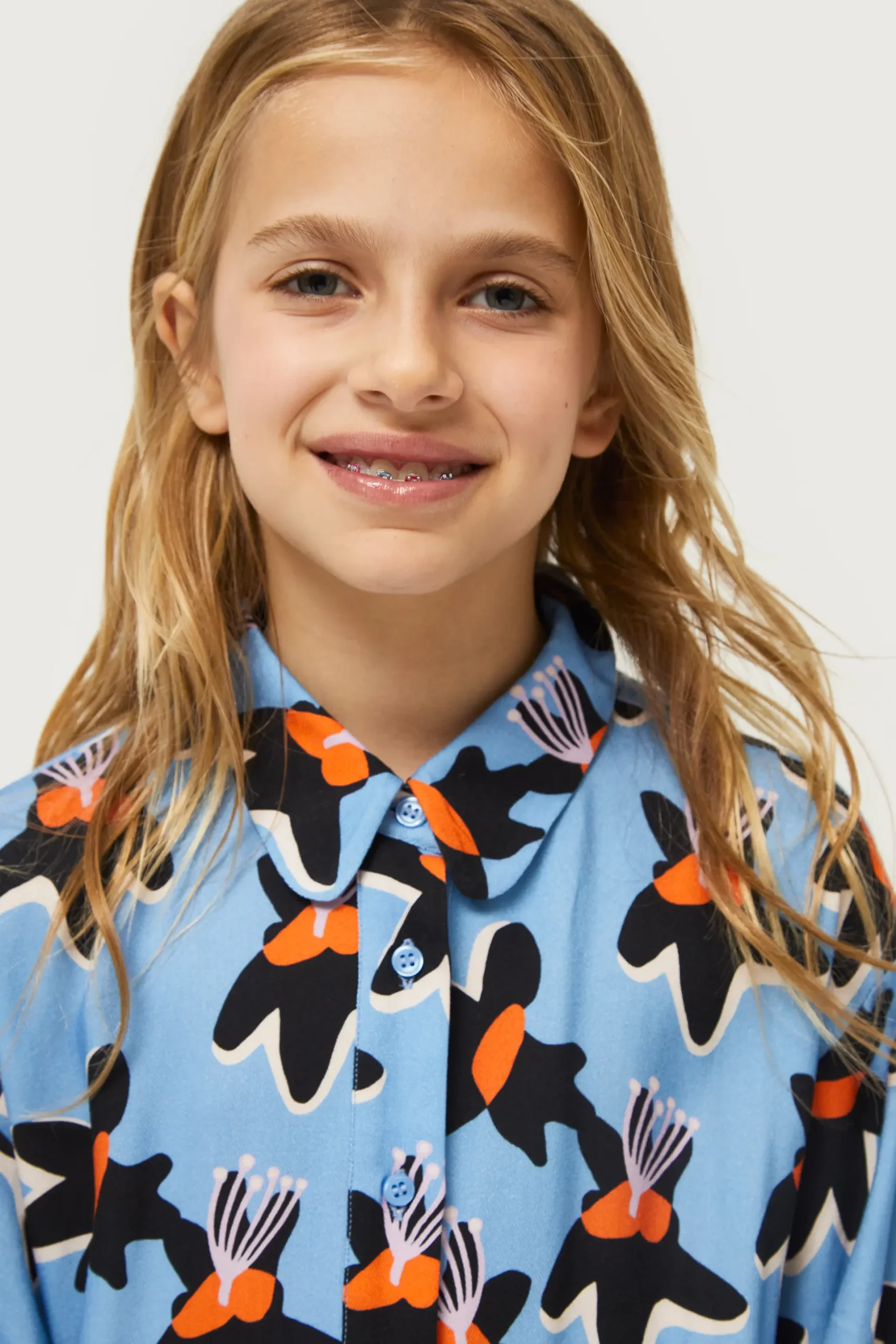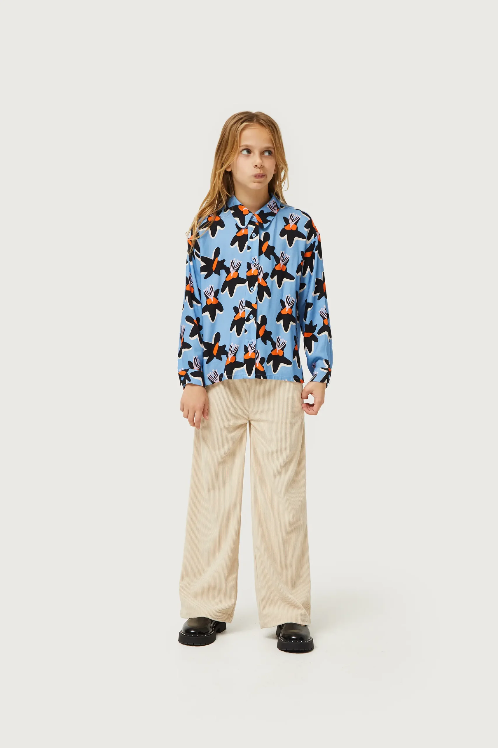 Camisa de niña en twill de viscosa de color azul con estampado de flores negras y amarillas. Con cuello solapa y manga larga. Cierre frontal con botones. La modelo mide 140 cm y lleva la talla 8.