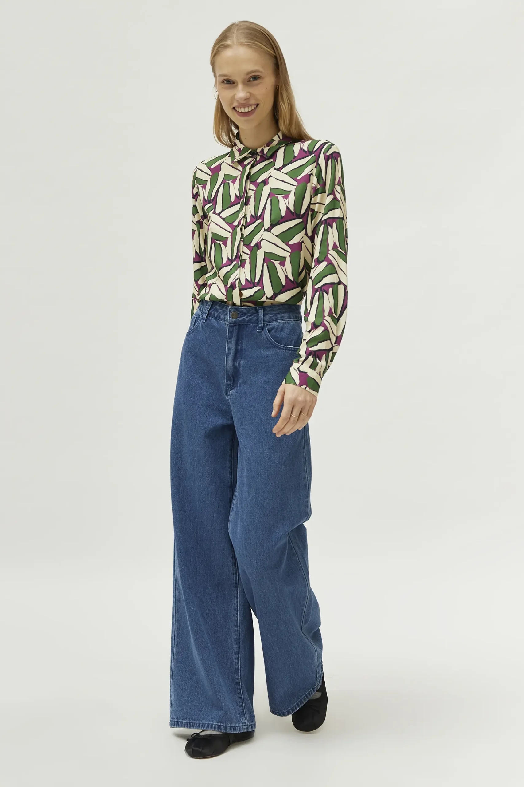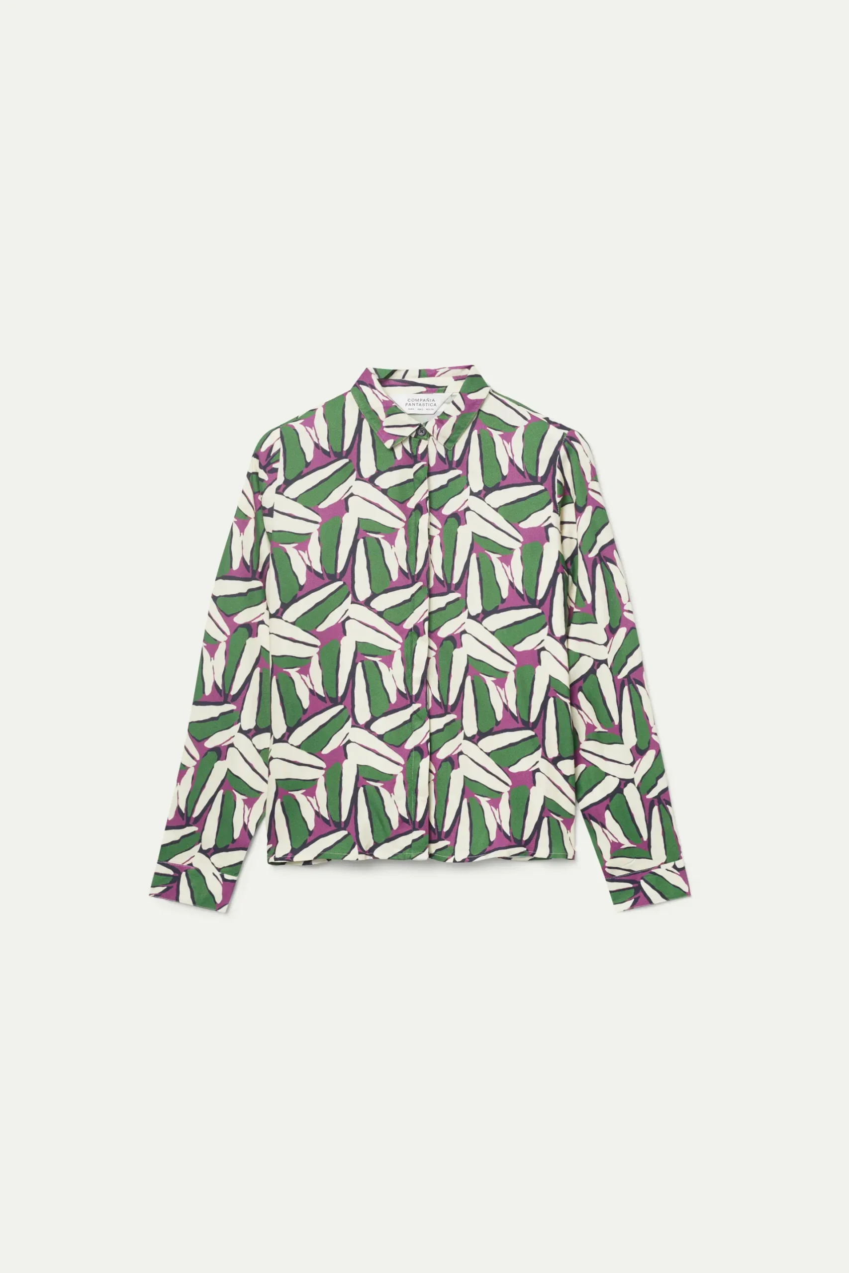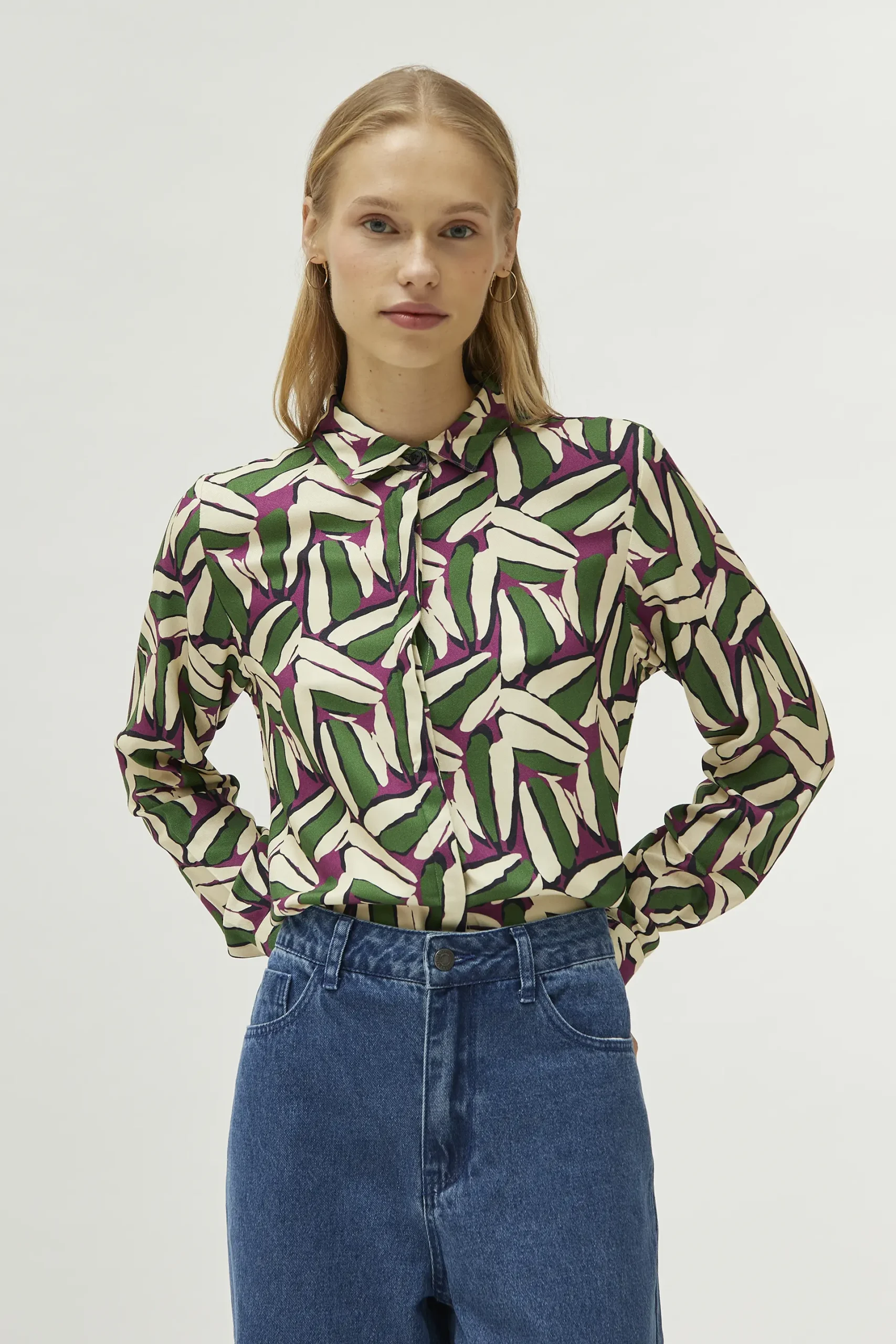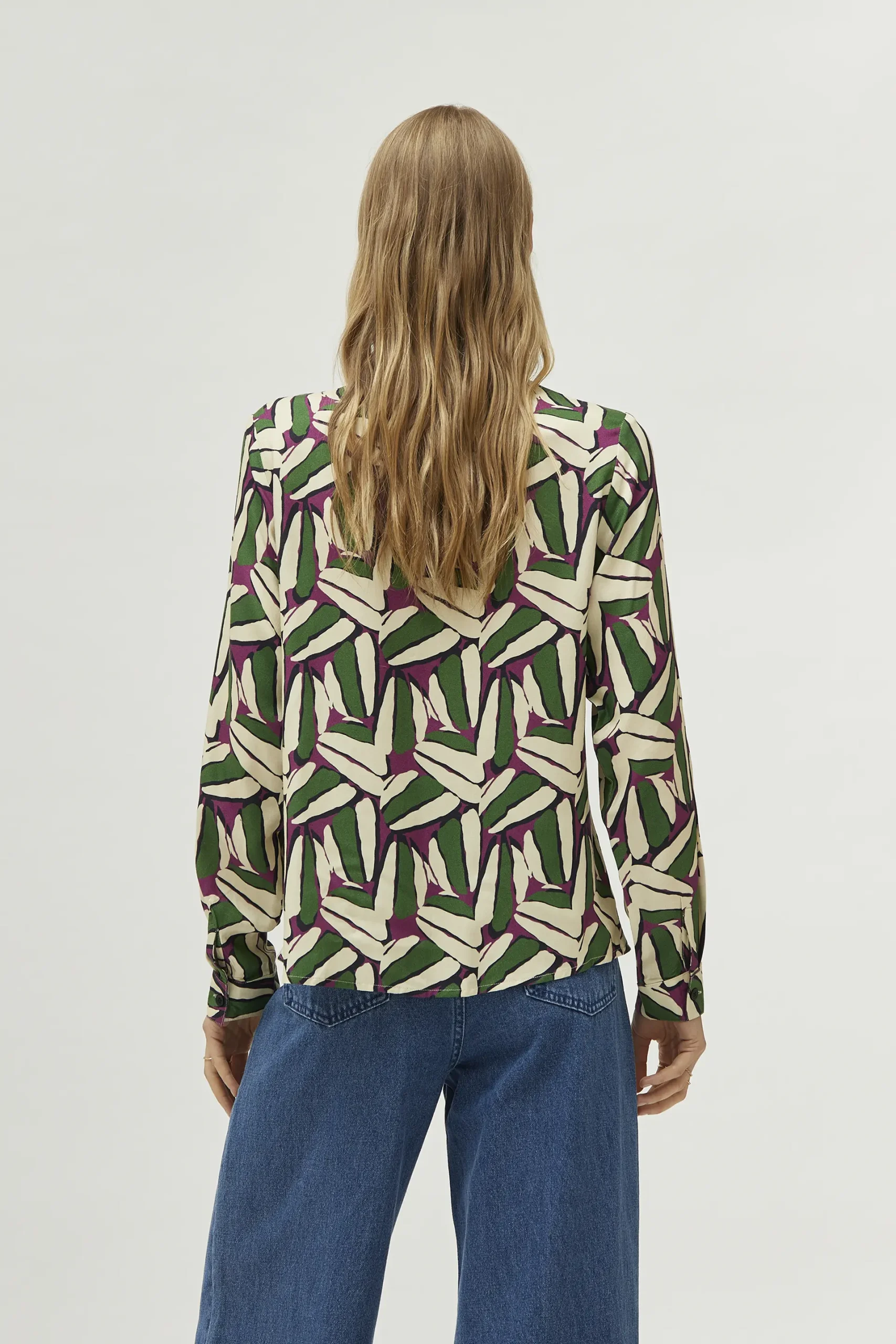Camisa en twill de viscosa con estampado geométrico de color verde, blanco y morado. Con cuello solapa y manga larga. Cierre frontal con botones. La modelo mide 174 cm y lleva la talla S.