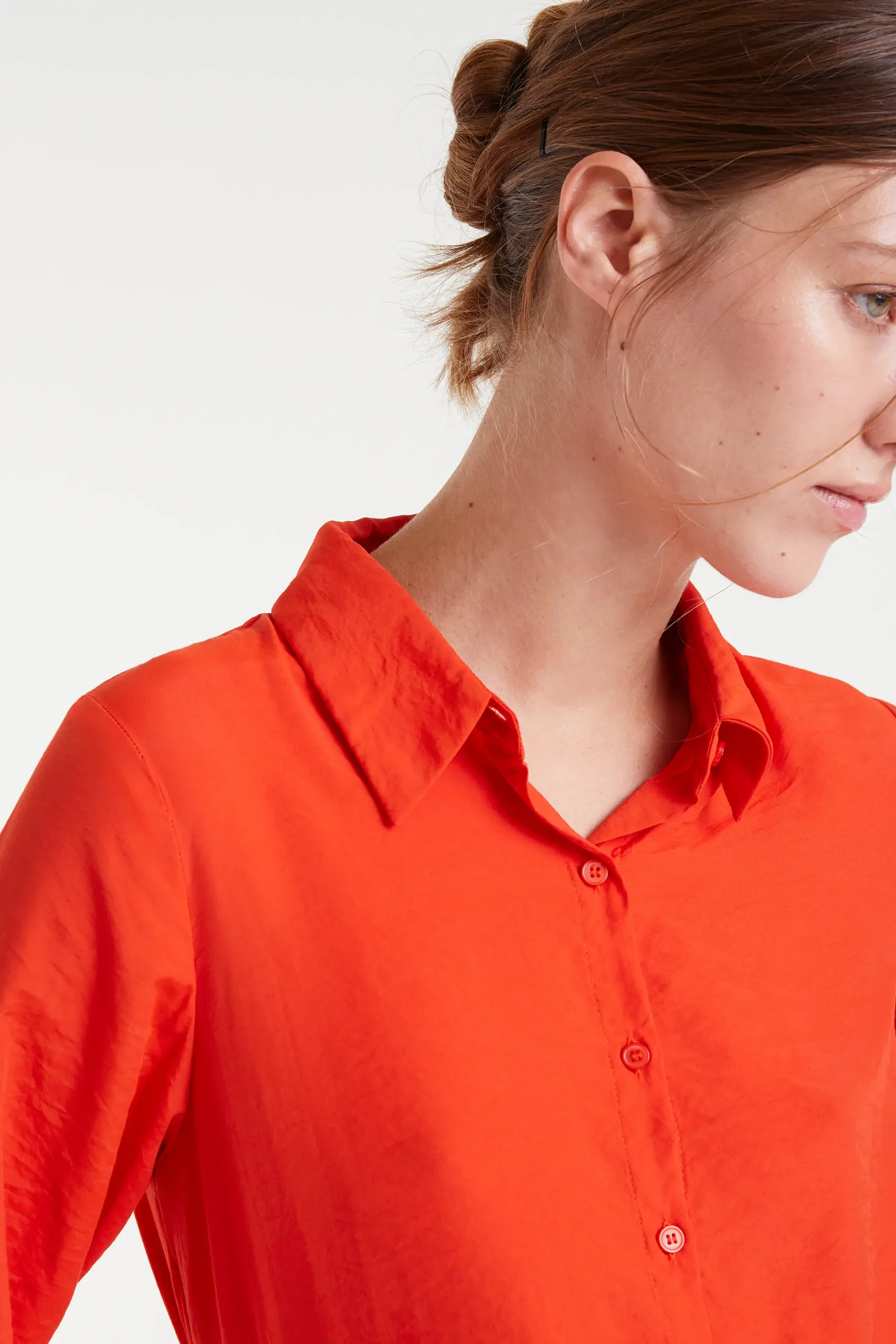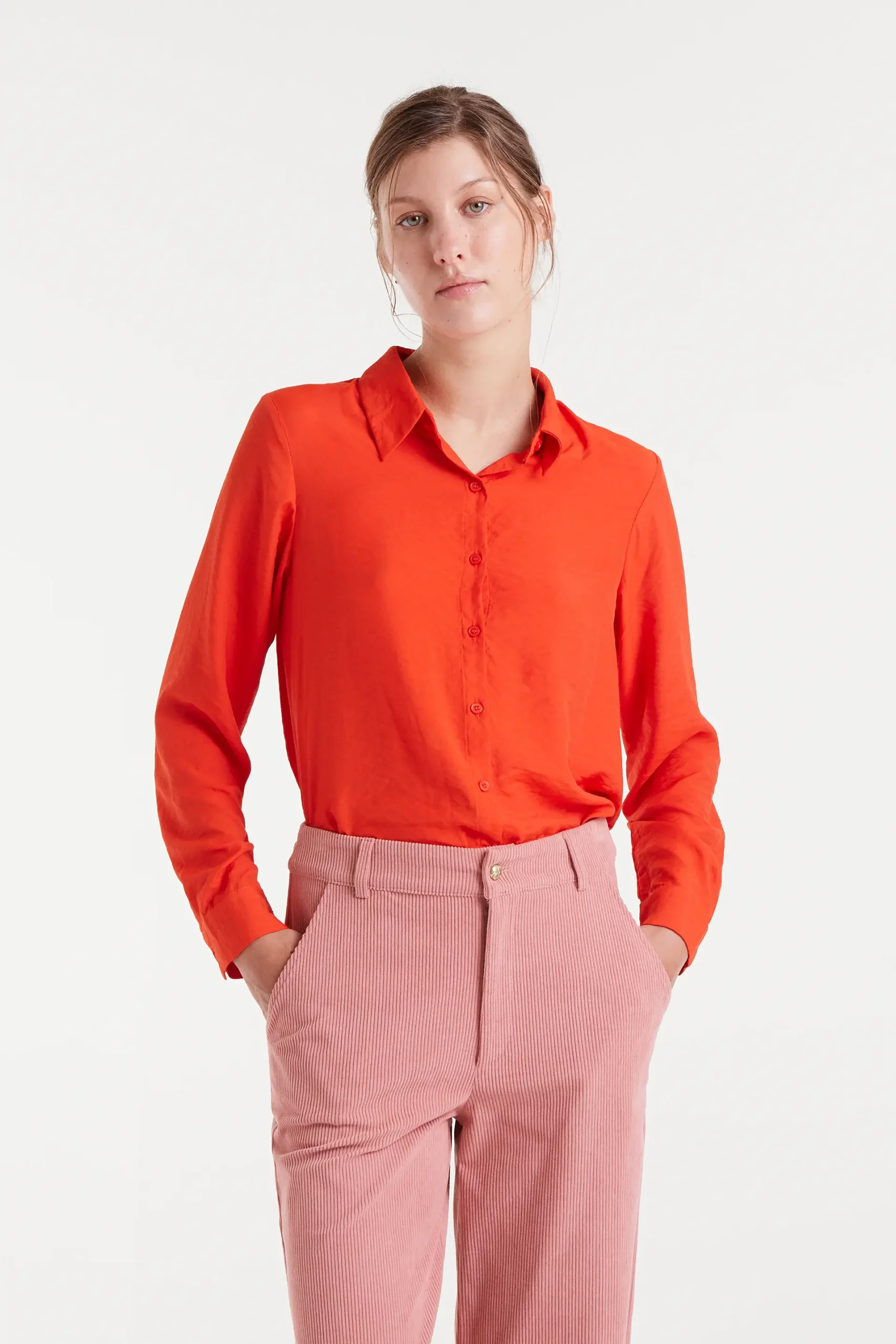 Camisa fluida con tejido viscosa de bambú de color naranja. Cuello con solapa y manga larga terminada en puño con botón. Cierre frontal con botones. La modelo mide 177 cm y lleva la talla S.