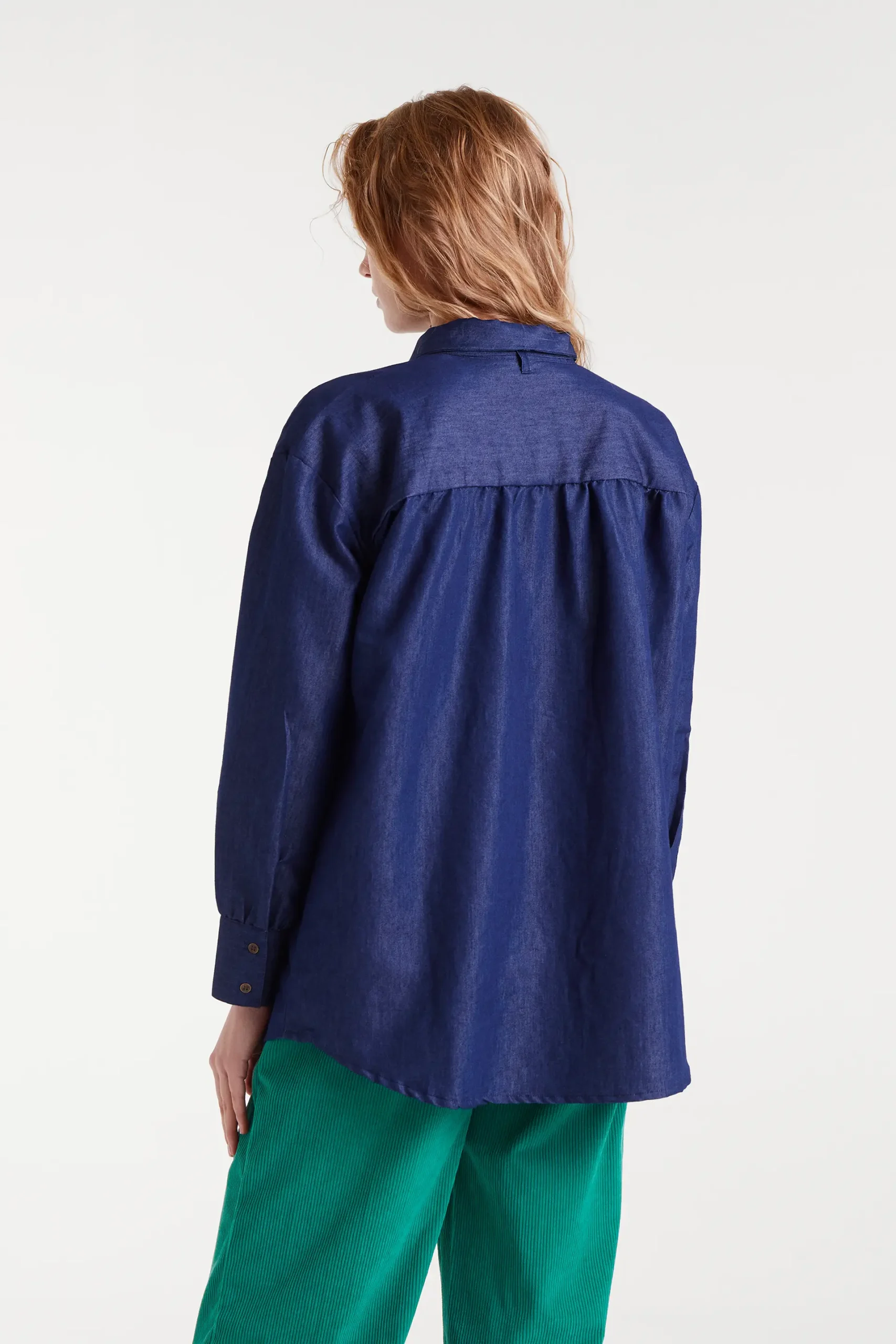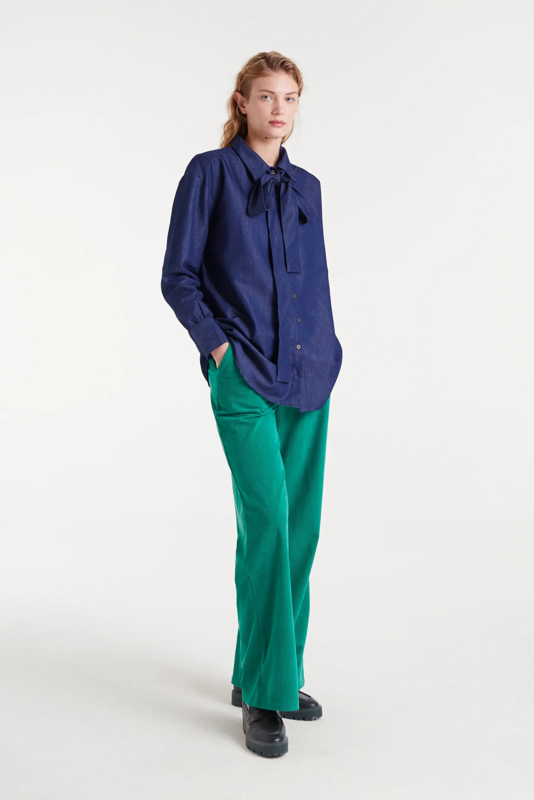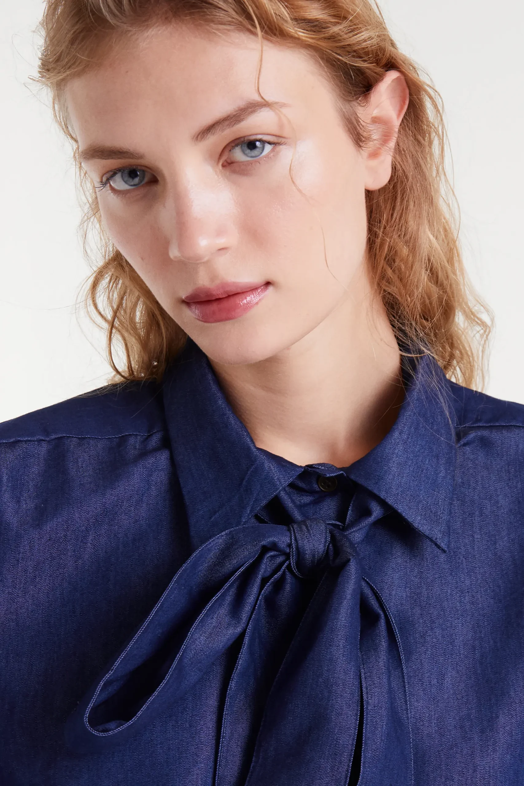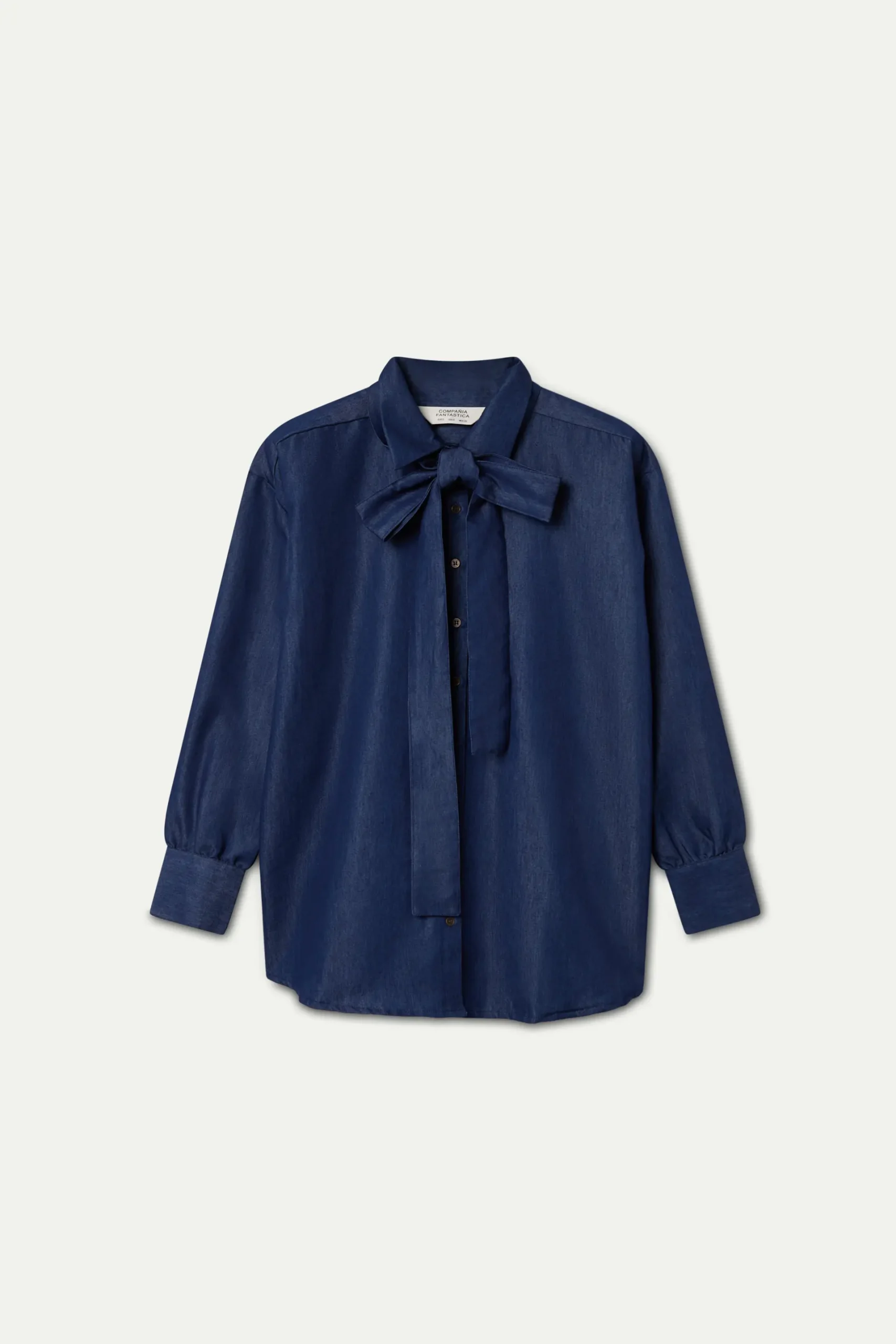 Camisa con tejido chambray 100% algodón de color azul. Con cuello lazado grande y manga larga terminada en puño con botón. La modelo mide 179 cm y lleva la talla S.