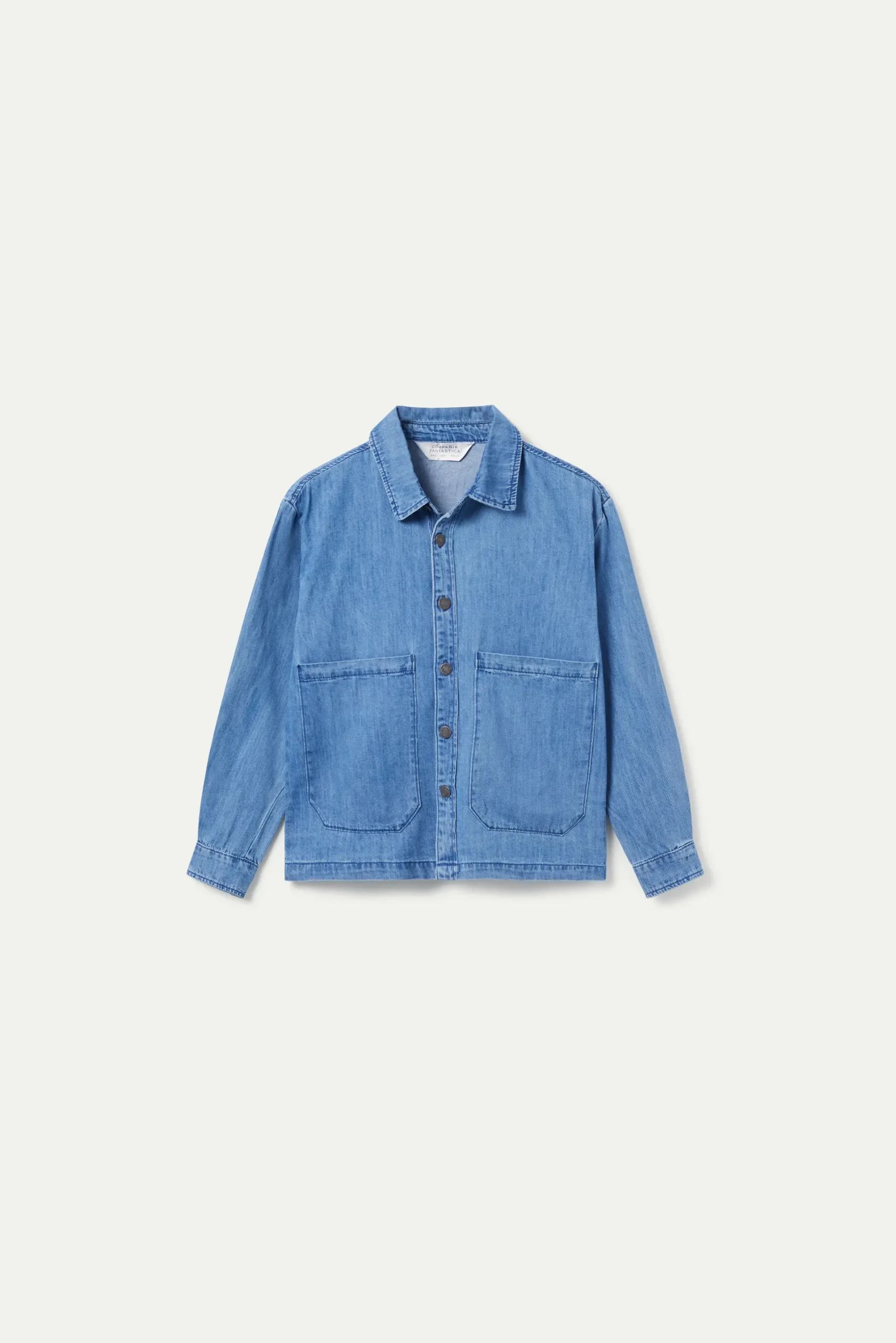 Camisa de tejido vaquero 100% algodón de color azul. Cuello solapa y manga larga terminada en puño con botón. Cierre frontal con botones metalicos. Detalles de maxi bolsillos.