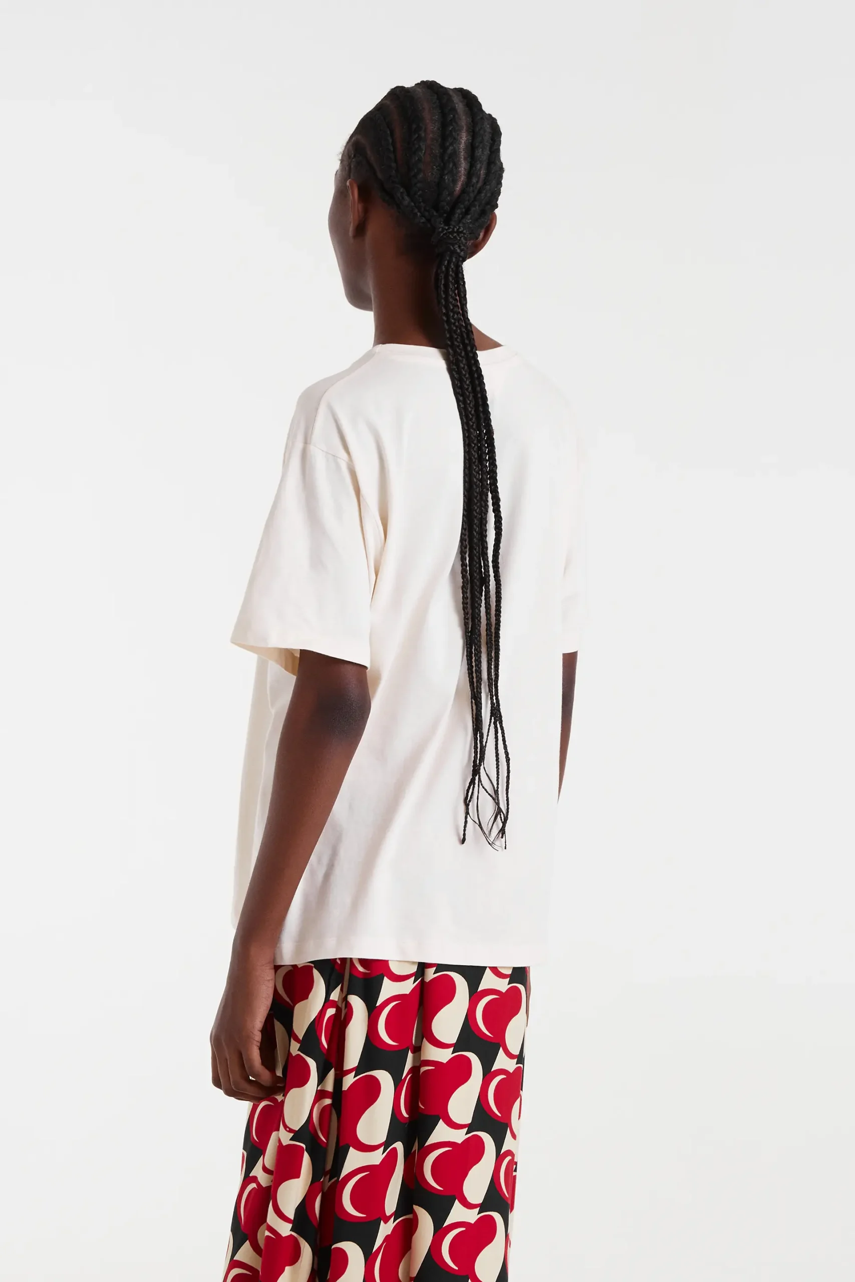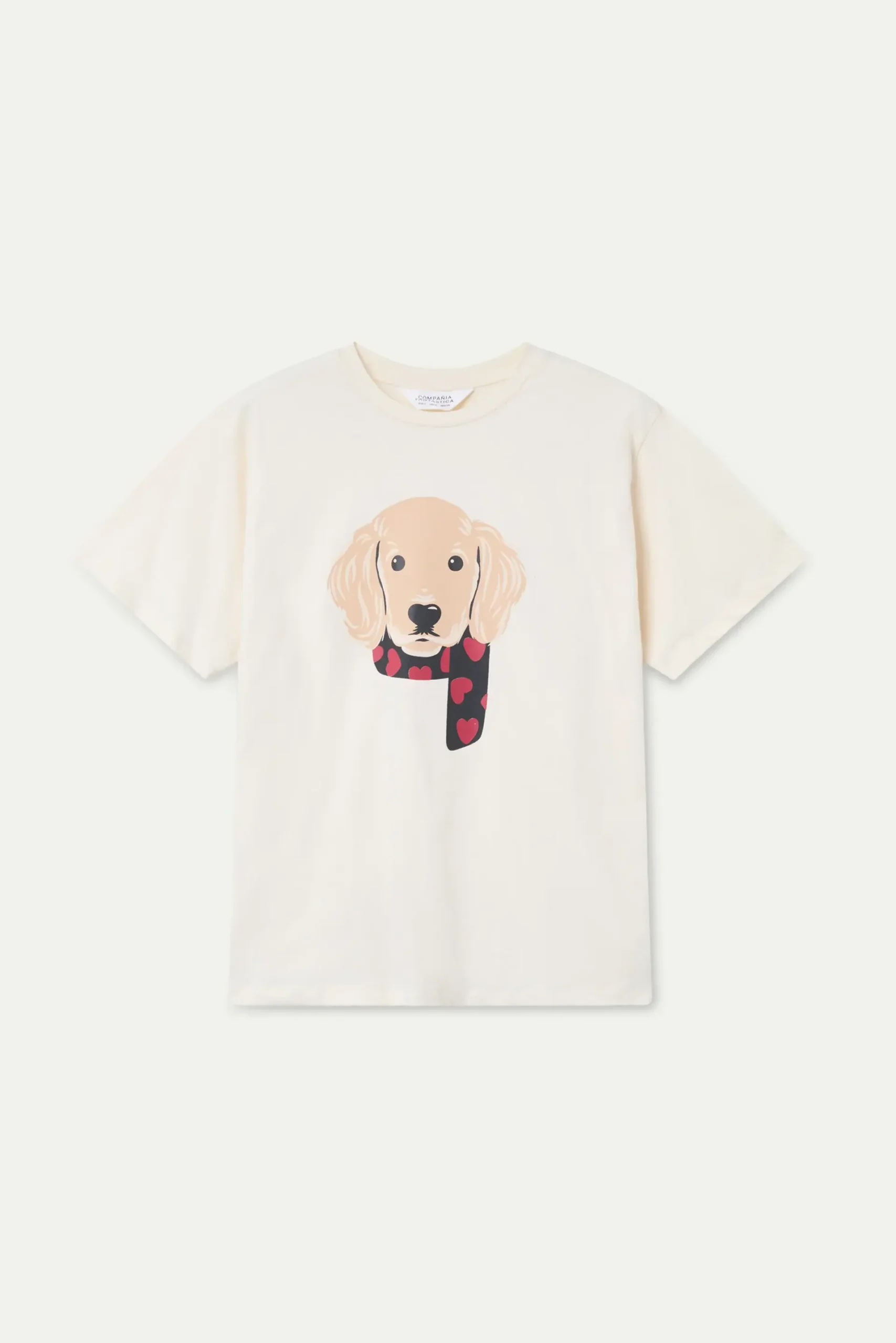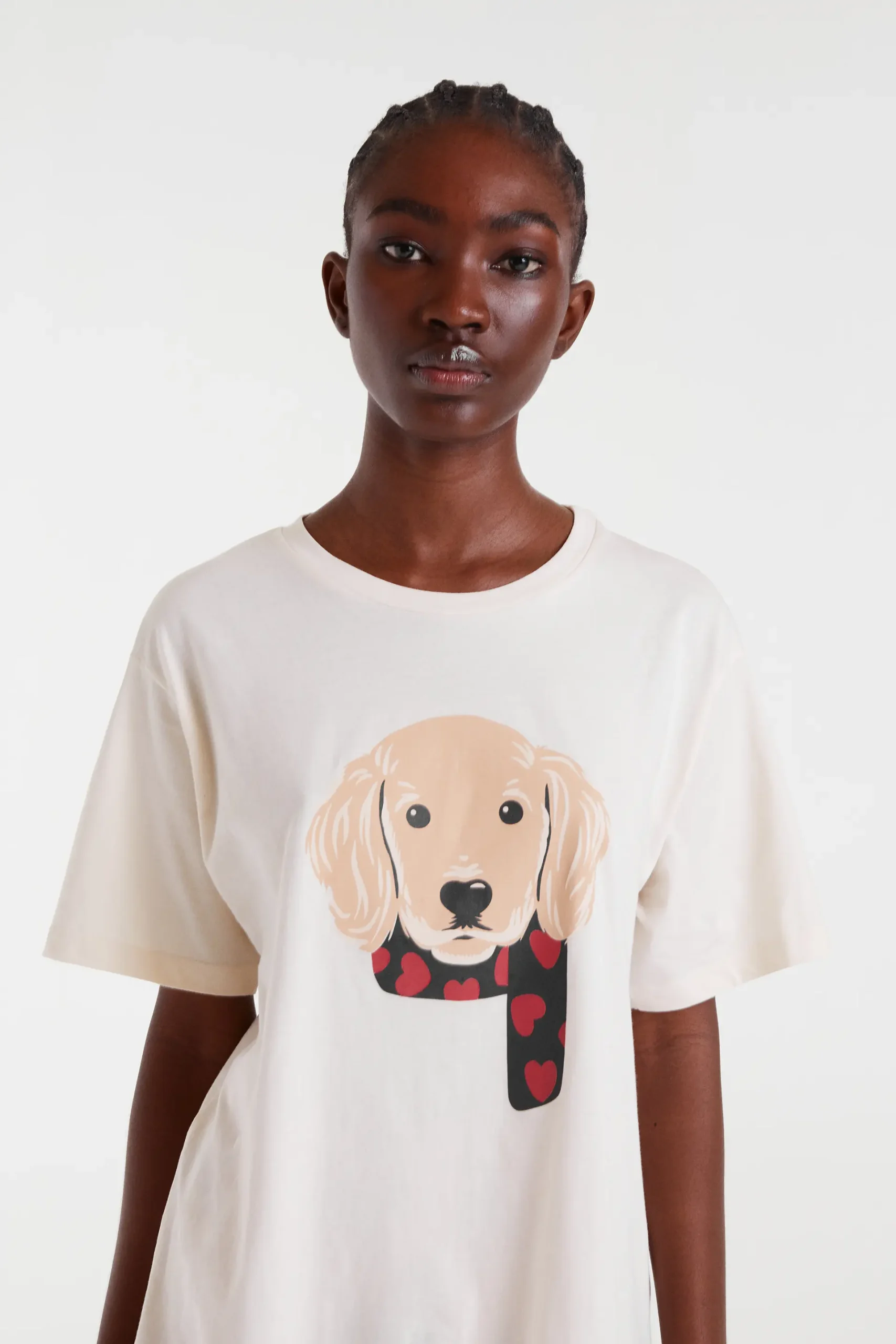 Camiseta tejido 100% algodón de color blanco con estampado de perro. Cuello redondo y manga corta. Hombro ligeramente caído. La modelo mide 178 cm y lleva la talla S.