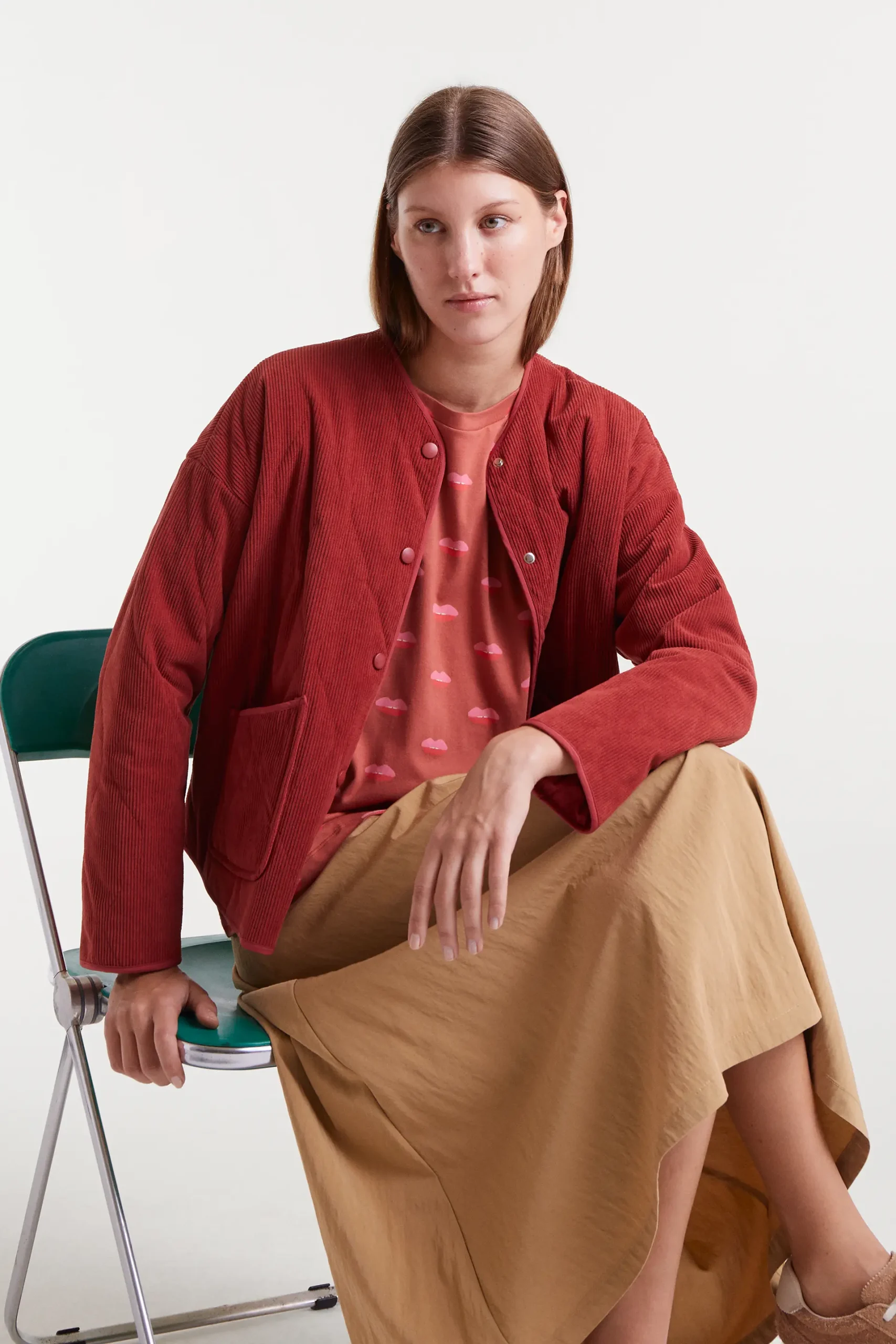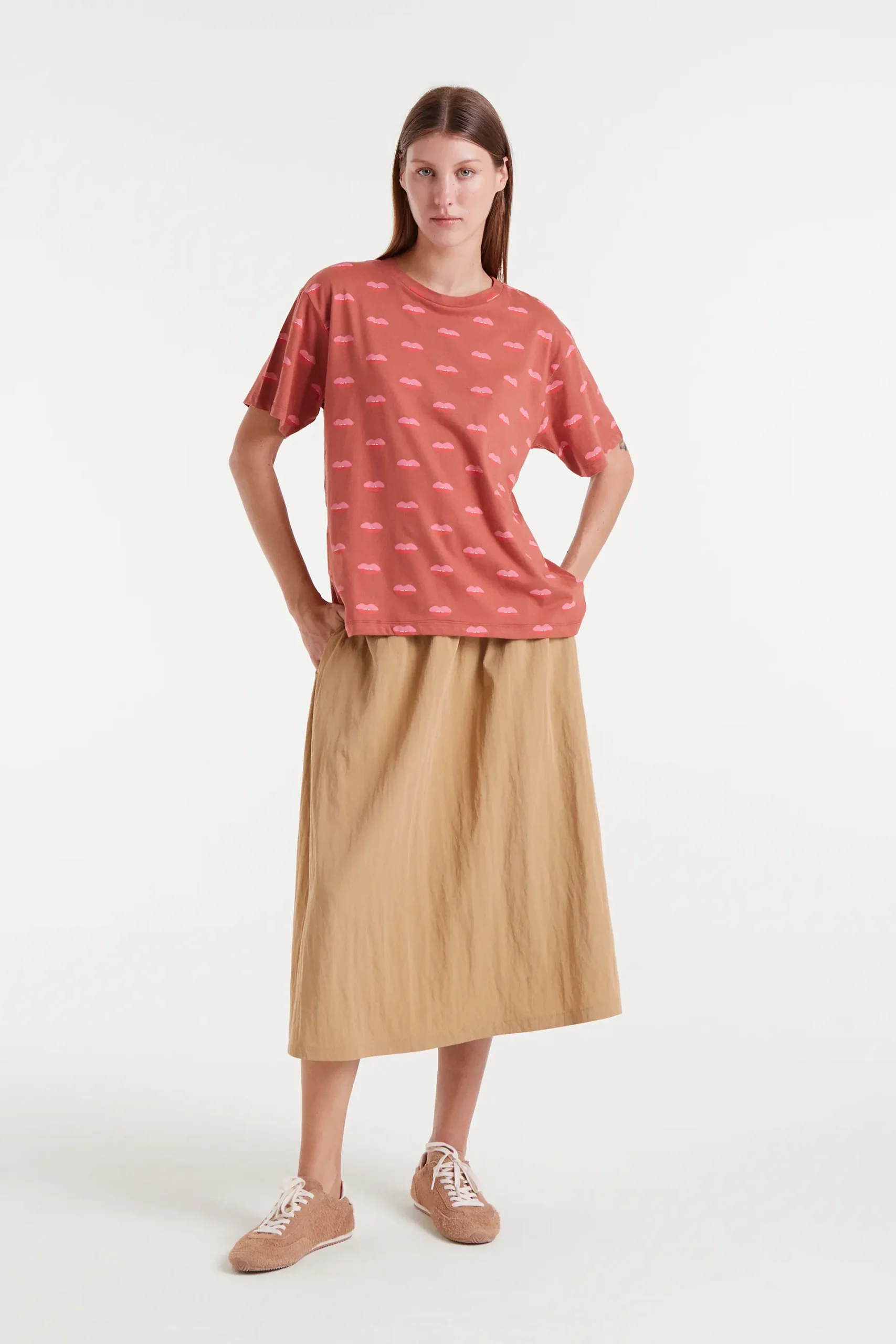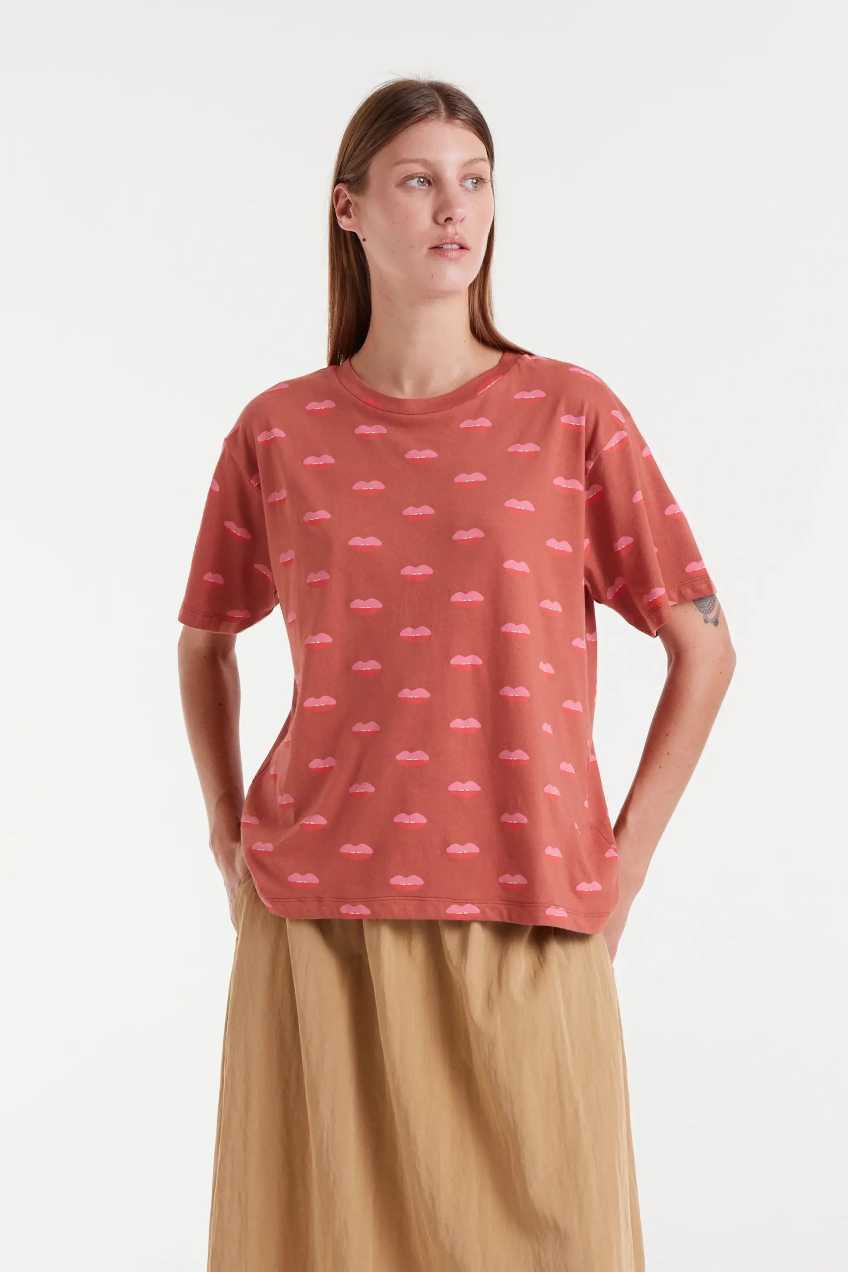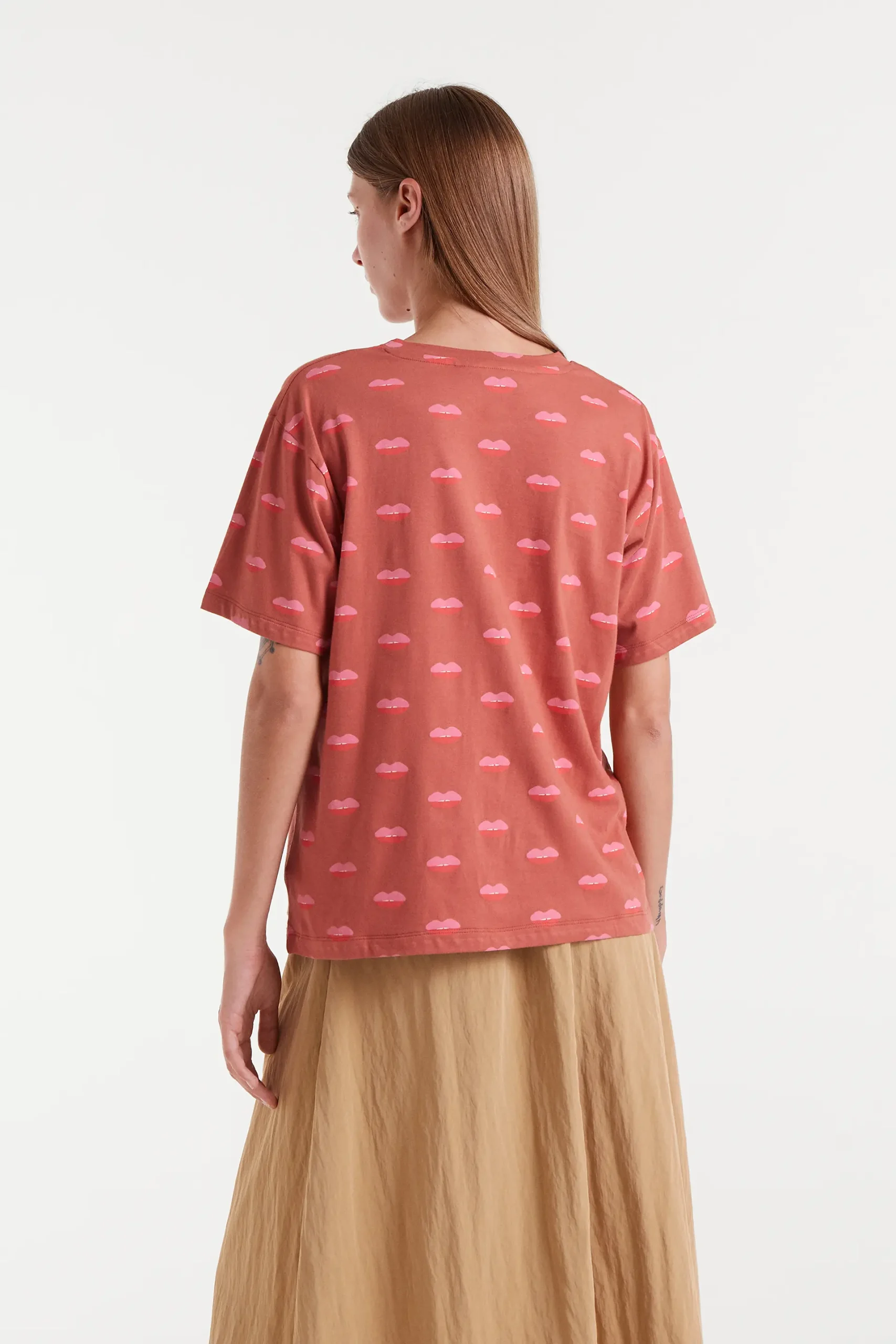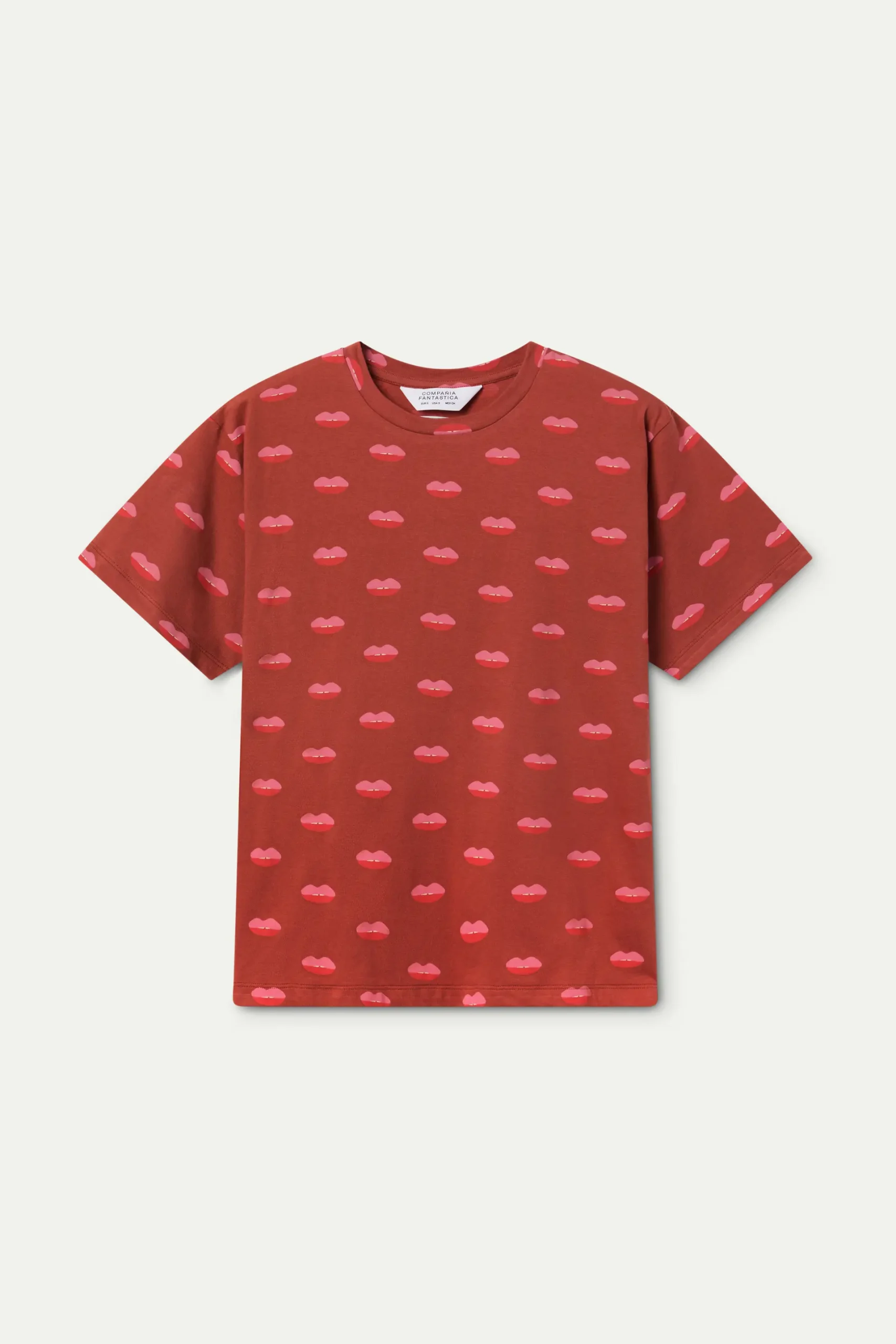 Camiseta con tejido 100% algodón de color marrón con estampado Lips. Cuello redondo y manga corta. Hombro ligeramente caído. La modelo mide 177 cm y lleva la talla S.