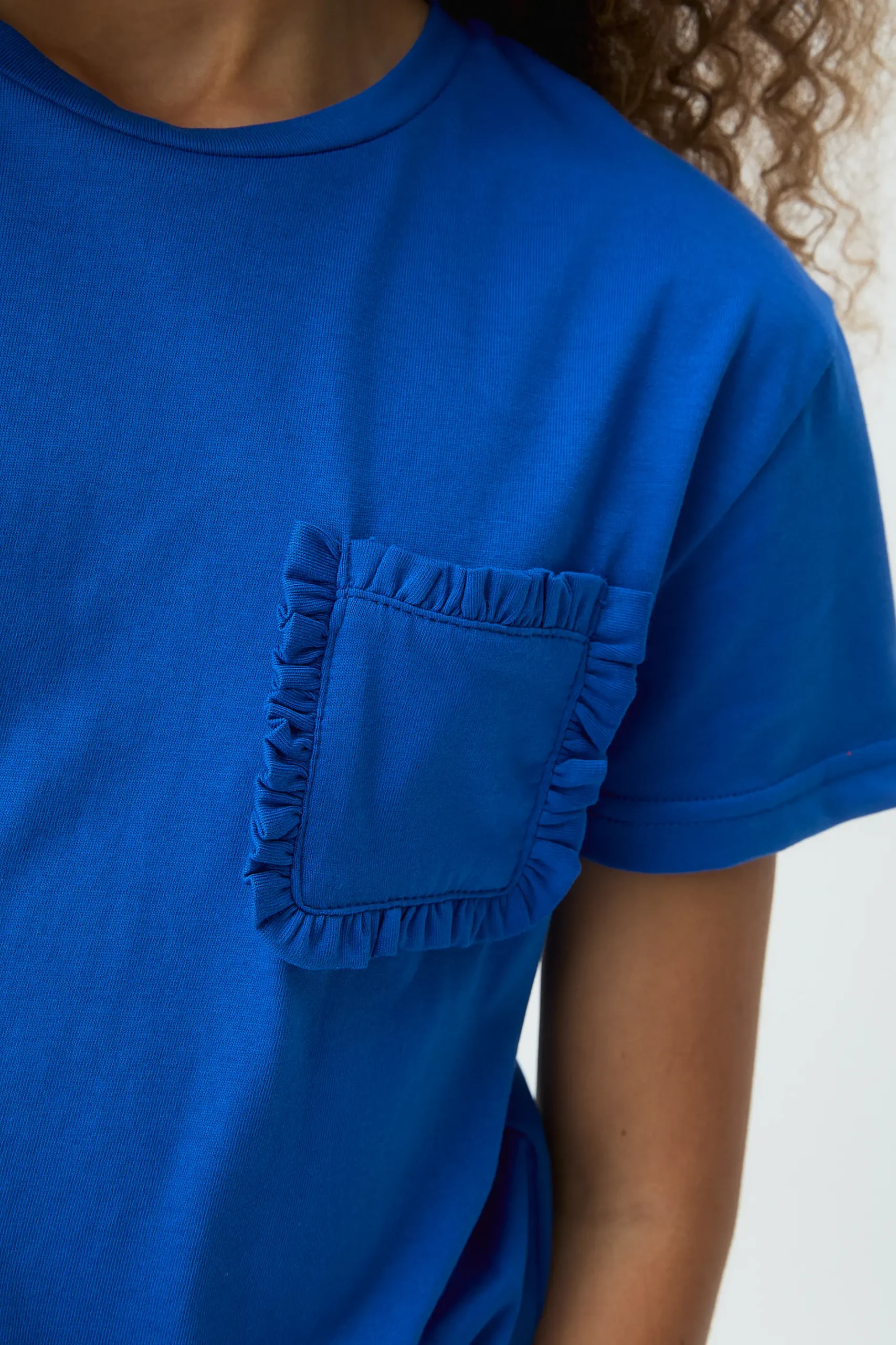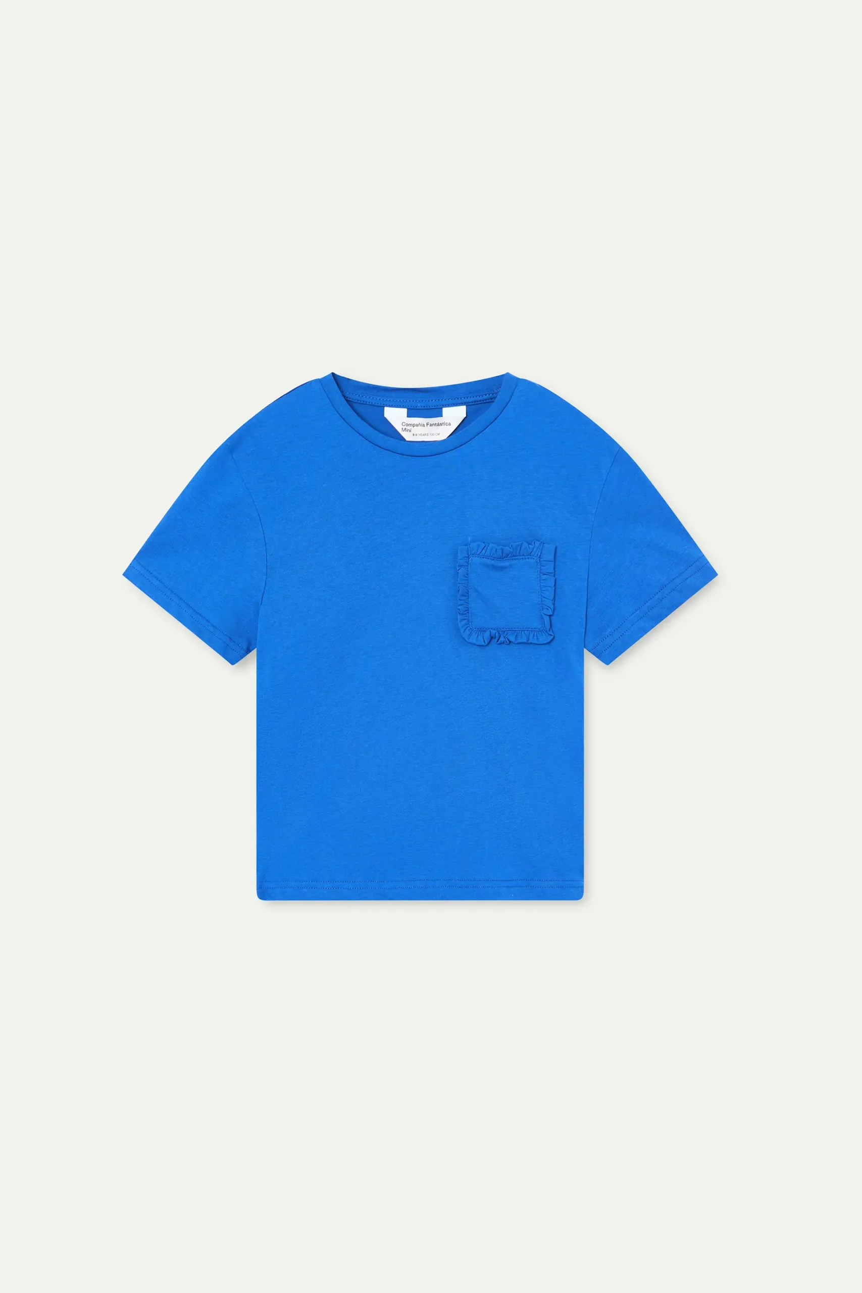Camiseta de niña con tejido 100% algodón de color azul. Cuello rendondo y manga corta. Detalle de bolsillo frontal con flecos. La modelo mide 135 cm y lleva la talla 8-9 años.