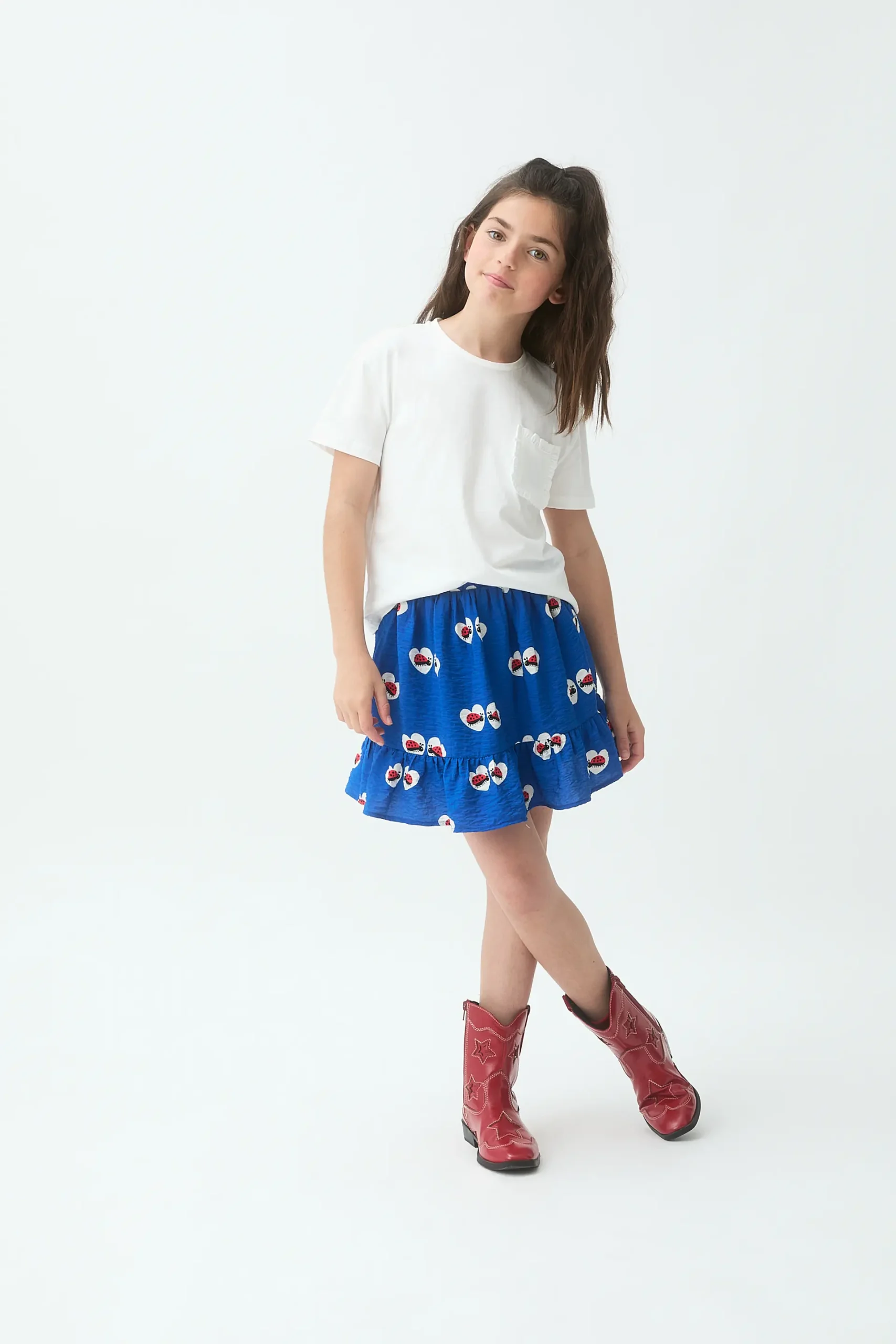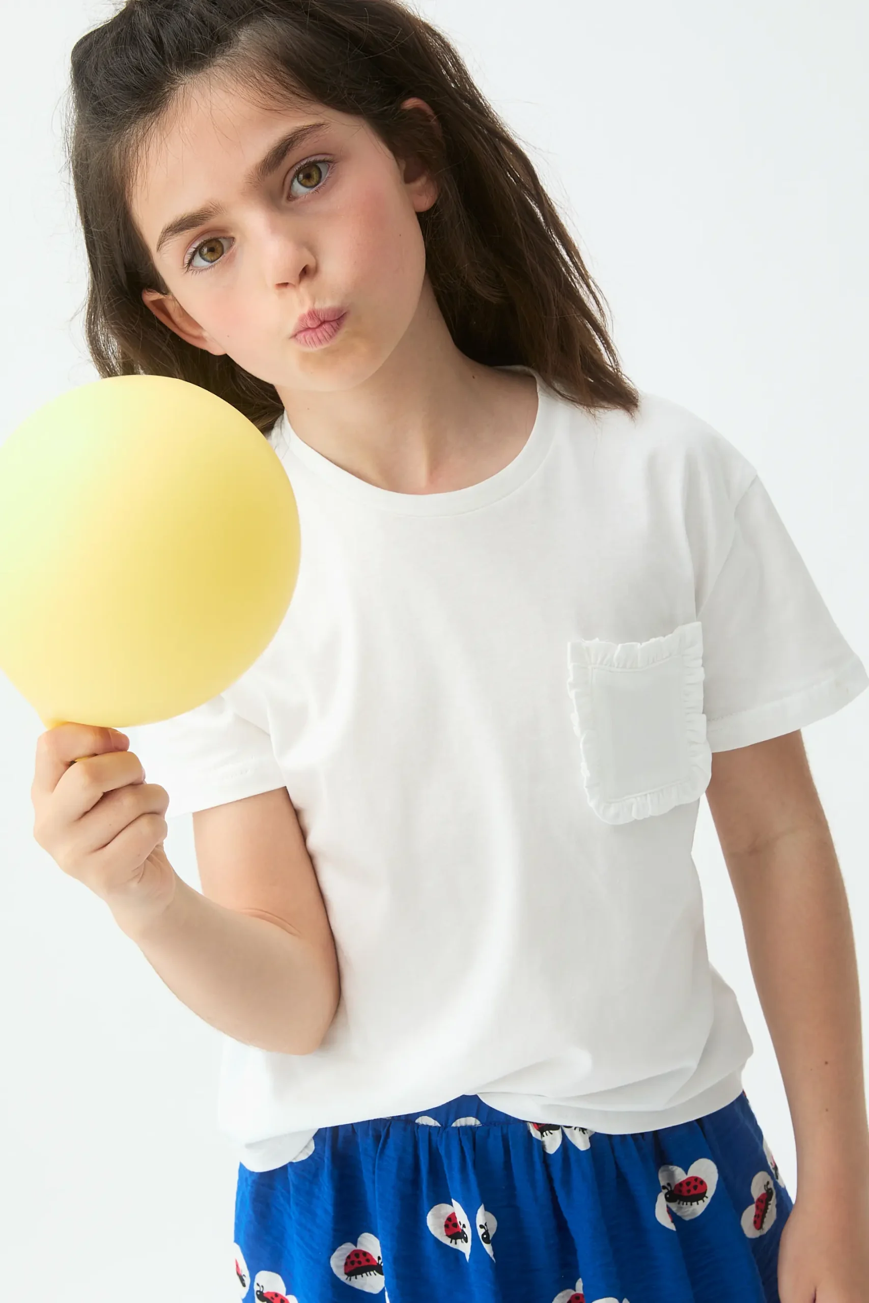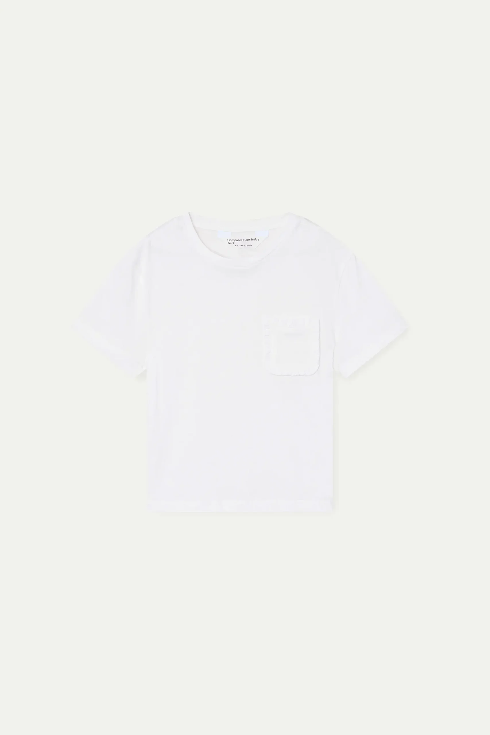 Camiseta de niña con tejido 100% algodón de color blanco. Cuello rendondo y manga corta. Detalle de bolsillo frontal con flecos. La modelo mide 135 cm y lleva la talla 8-9 años.