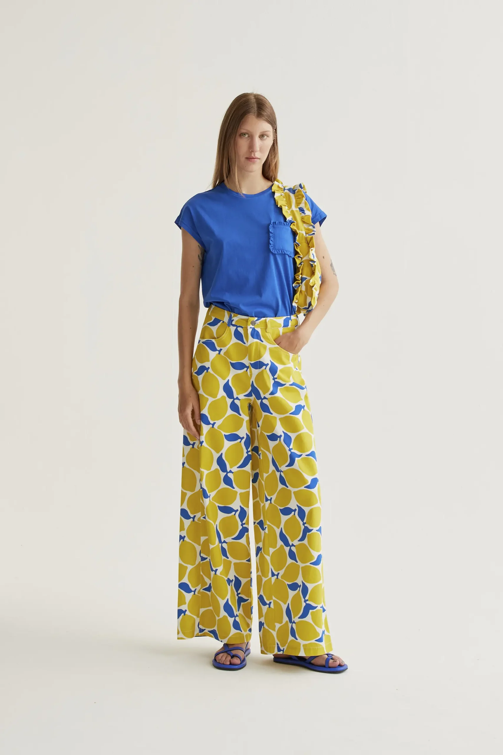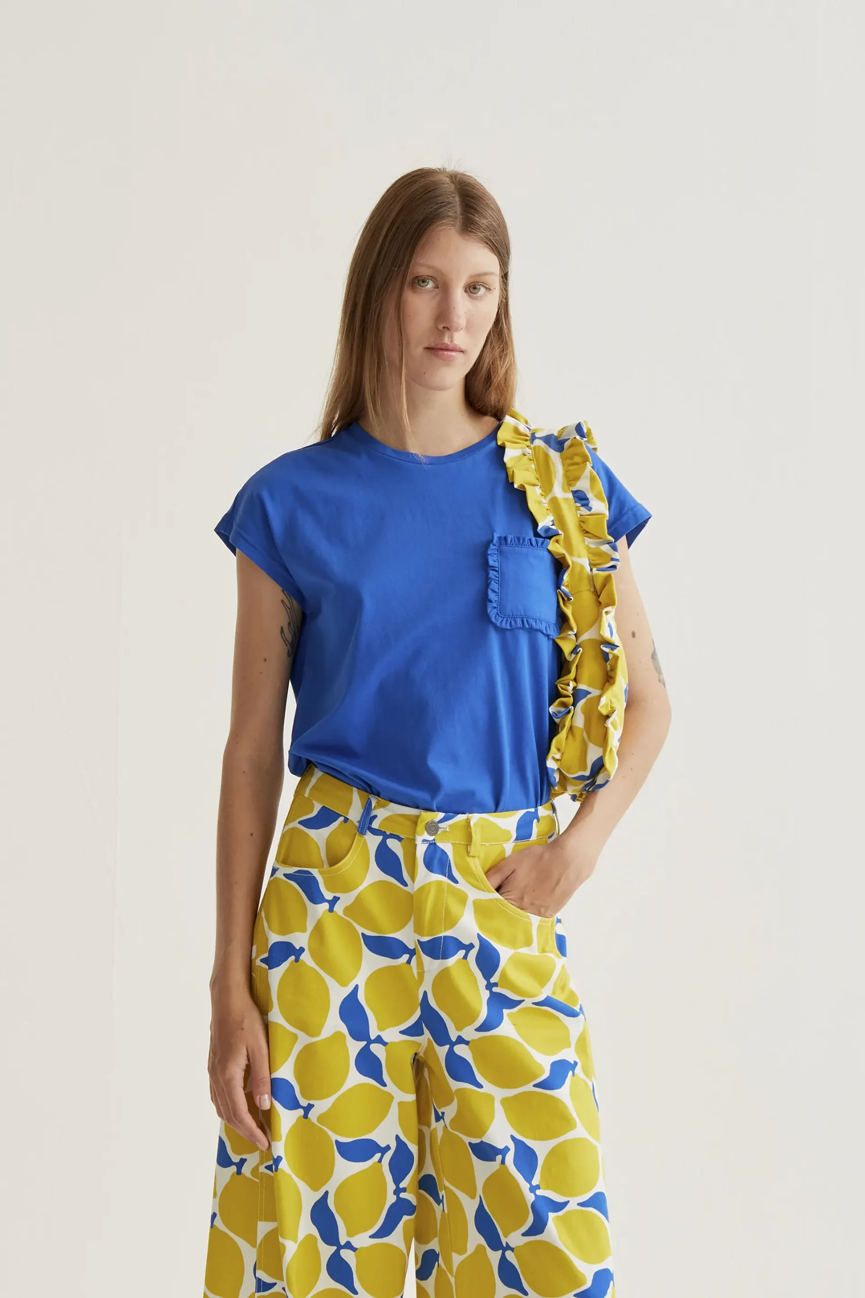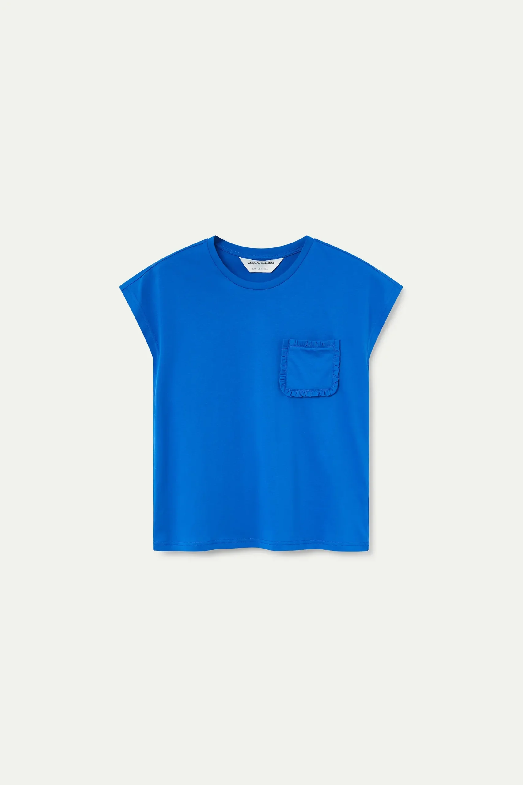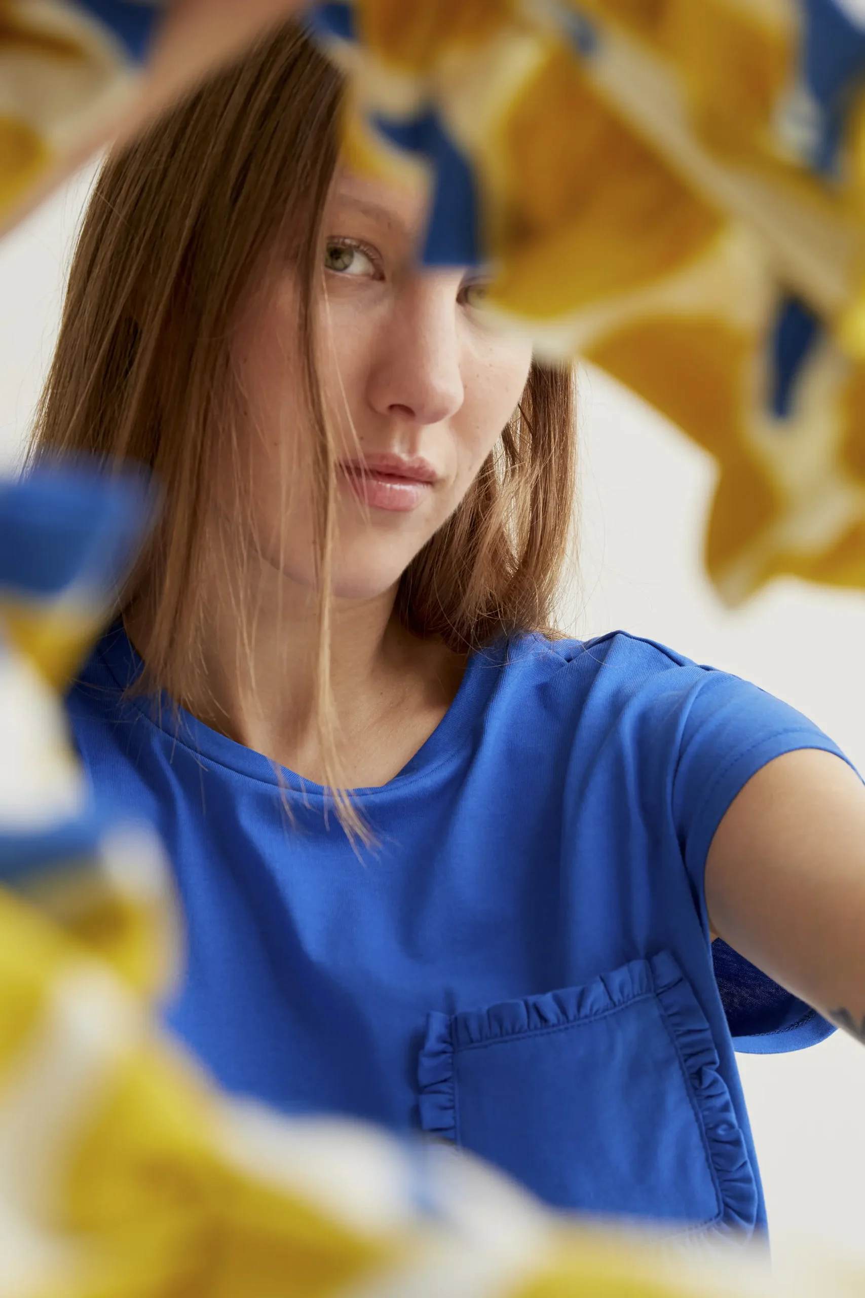 Camiseta con tejido 100% algodón de color azul. Cuello redondo y manga corta. Detalle de bolsillo con volantes. La modelo mide 177 cm y lleva la talla S.