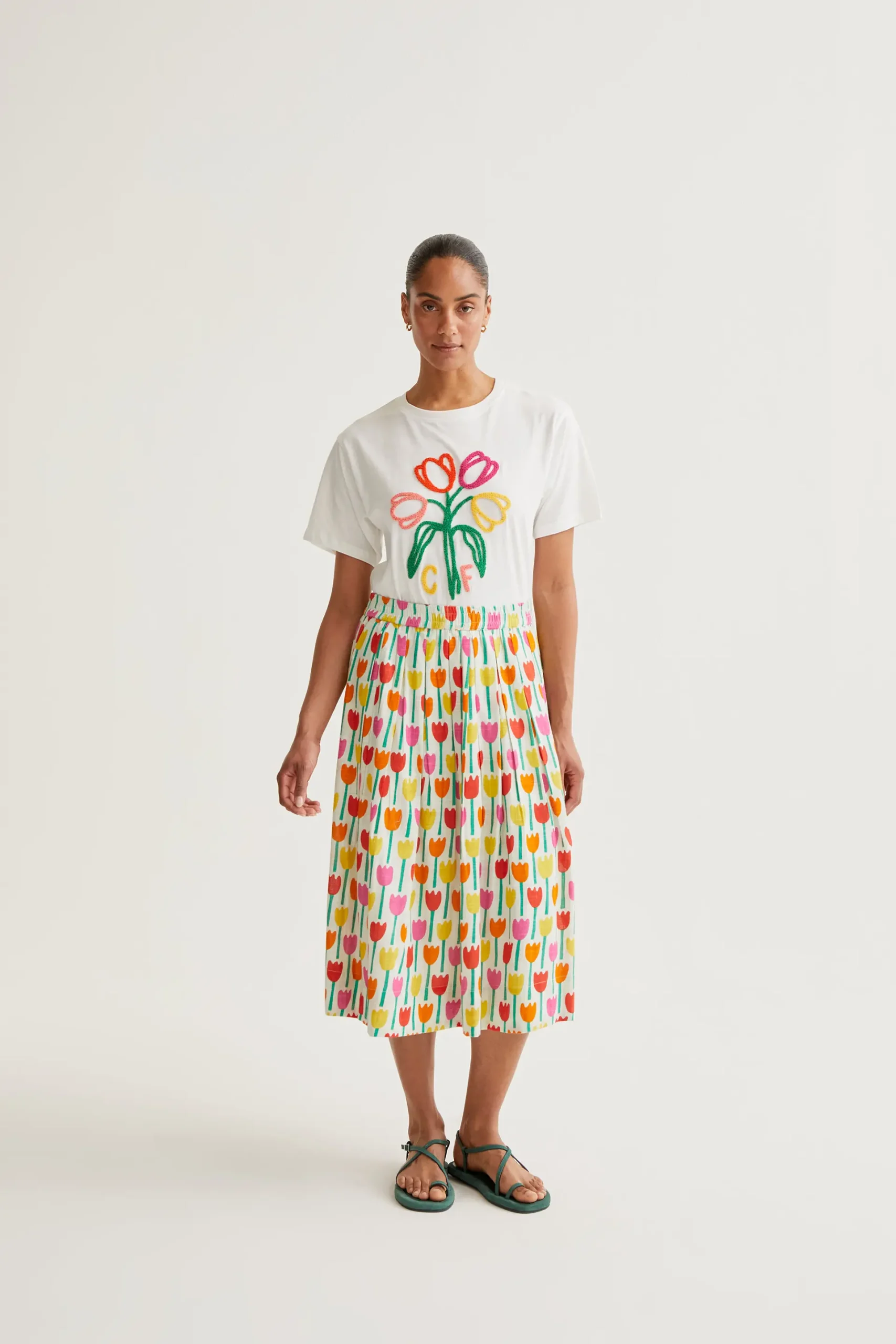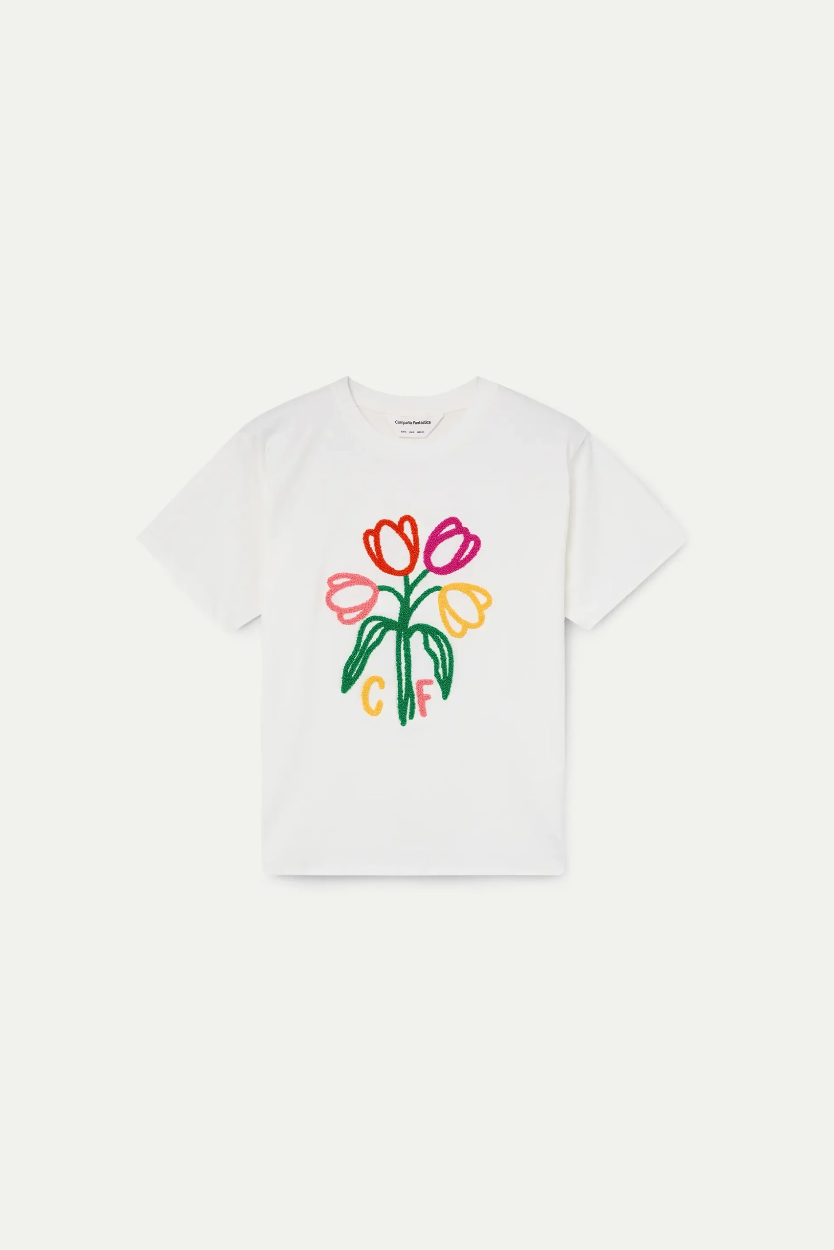 Camiseta de tejido 100% algodón con bordado de tulipanes y logo «CF». Cuello redondo y manga corta. La modelo mide 173 cm y lleva la talla S.