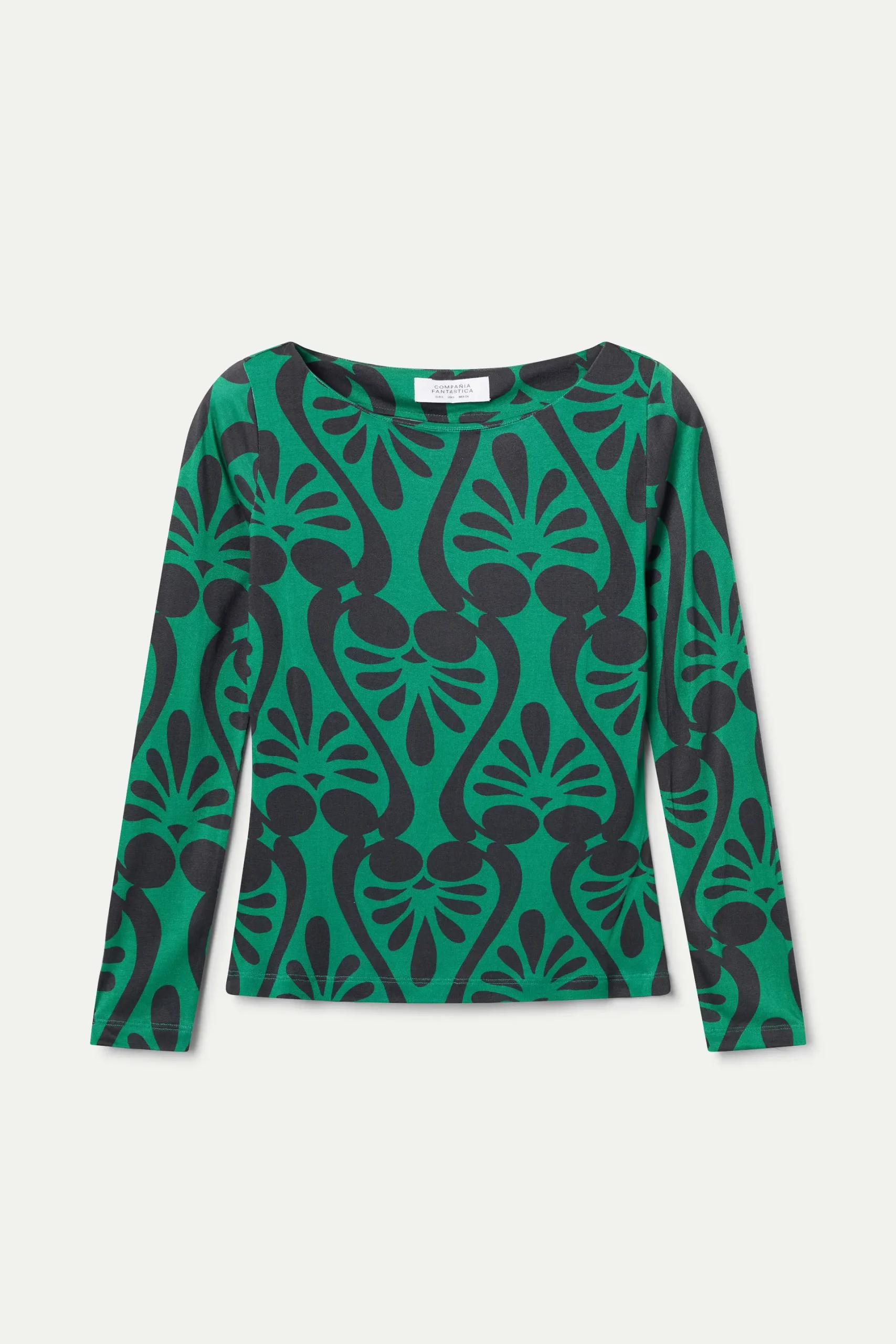 Camiseta de color verde con estampado Baroque. Con escote barco y manga larga. La modelo mide 177 cm y lleva la talla S.
