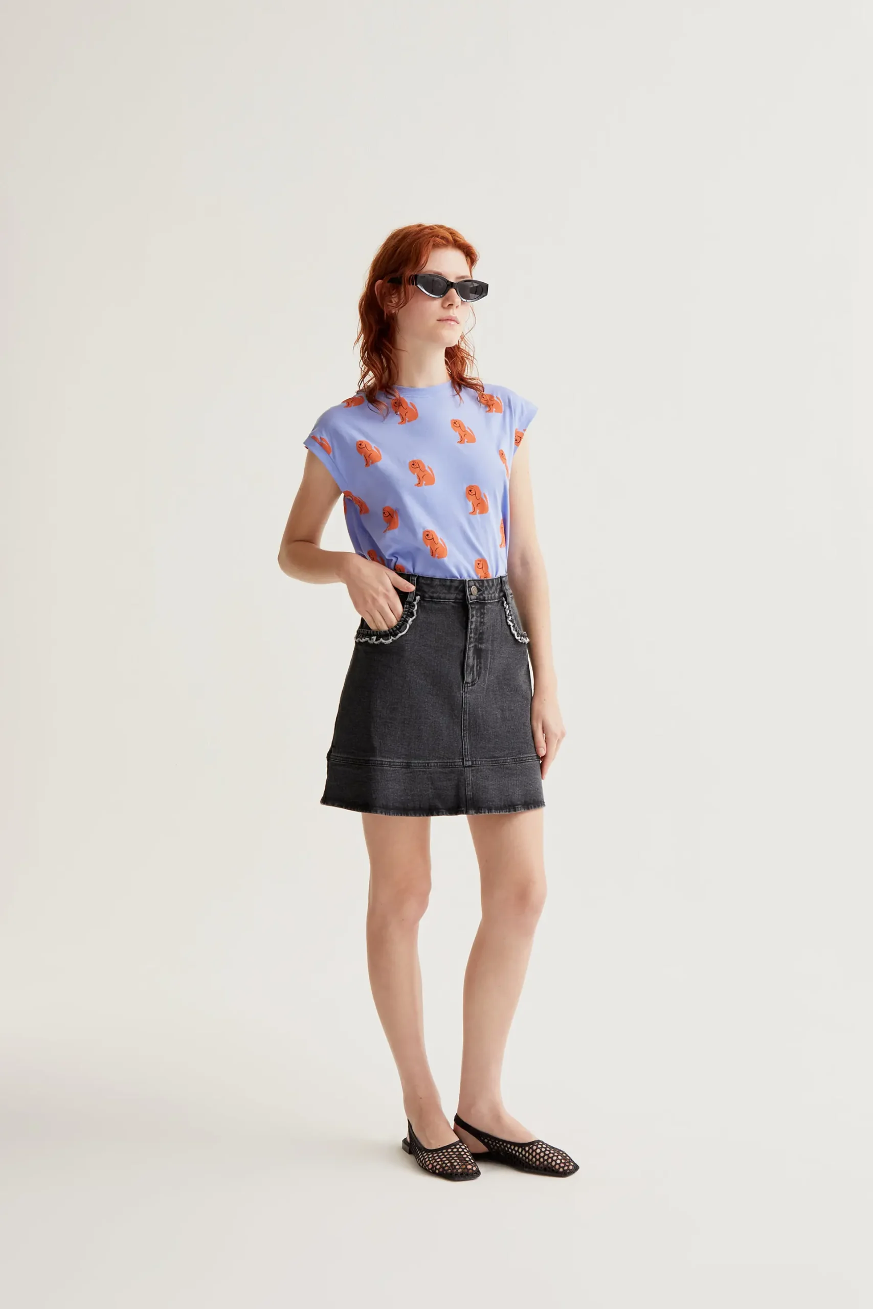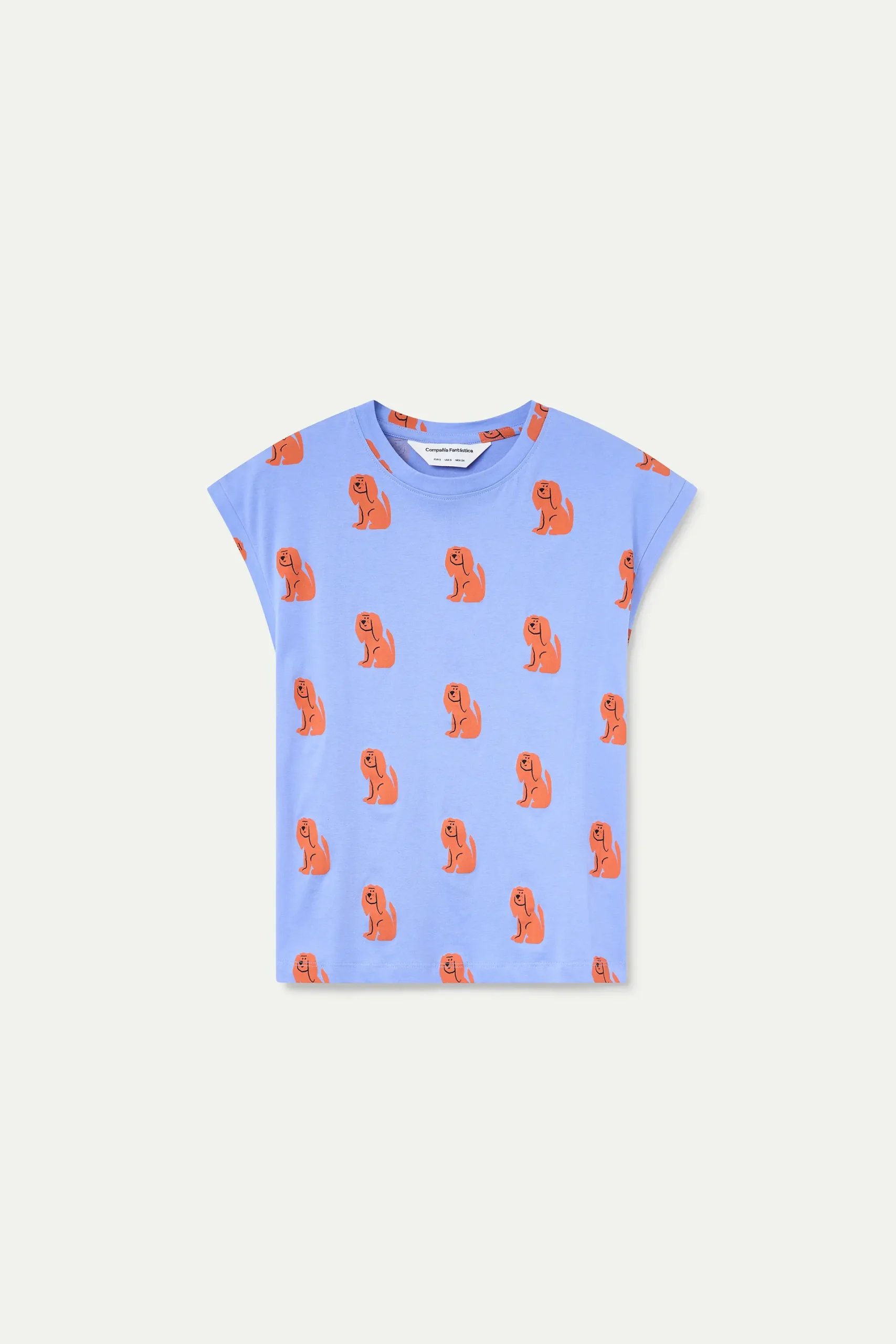Camiseta de tejido 100% algodón con estampado blue dog. Cuello redondo y manga corta. La modelo mide 175 cm y lleva la talla S.