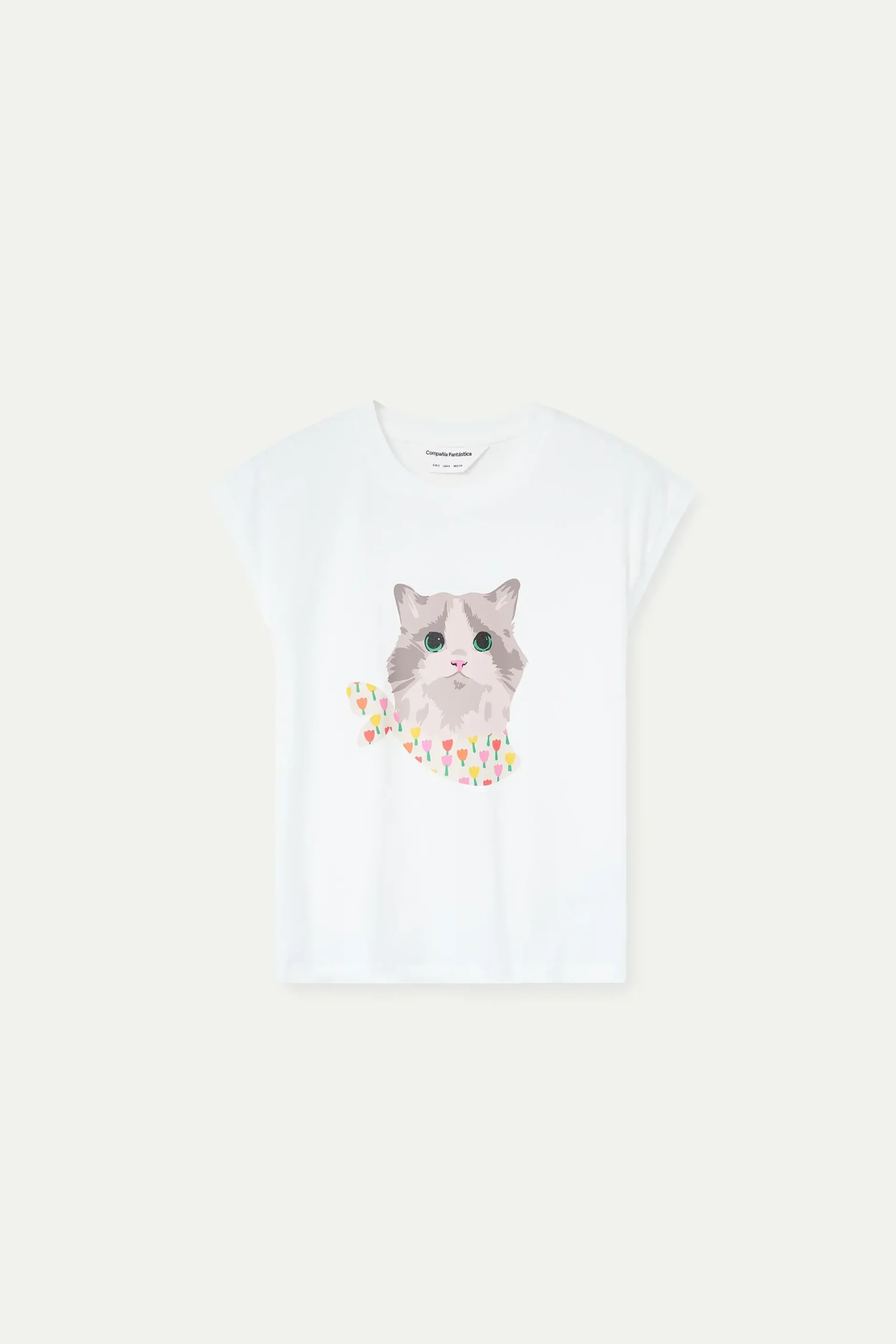 Camiseta de tejido 100% algodón con estampado de gatito. Cuello redondo y manga corta. La modelo mide 177 cm y lleva la talla S.