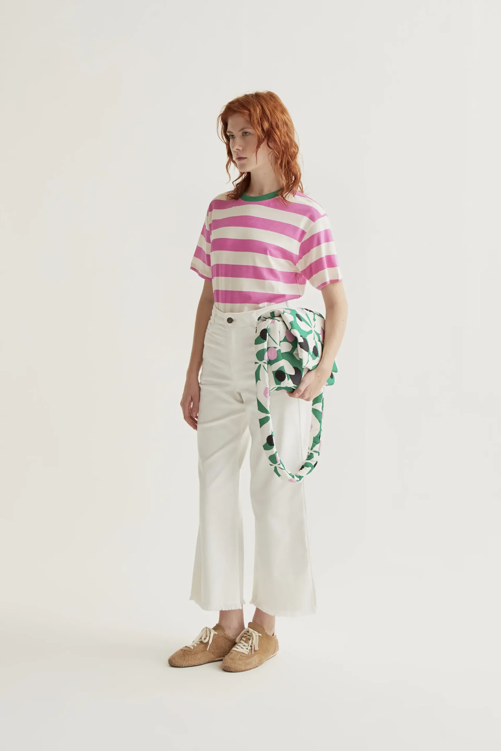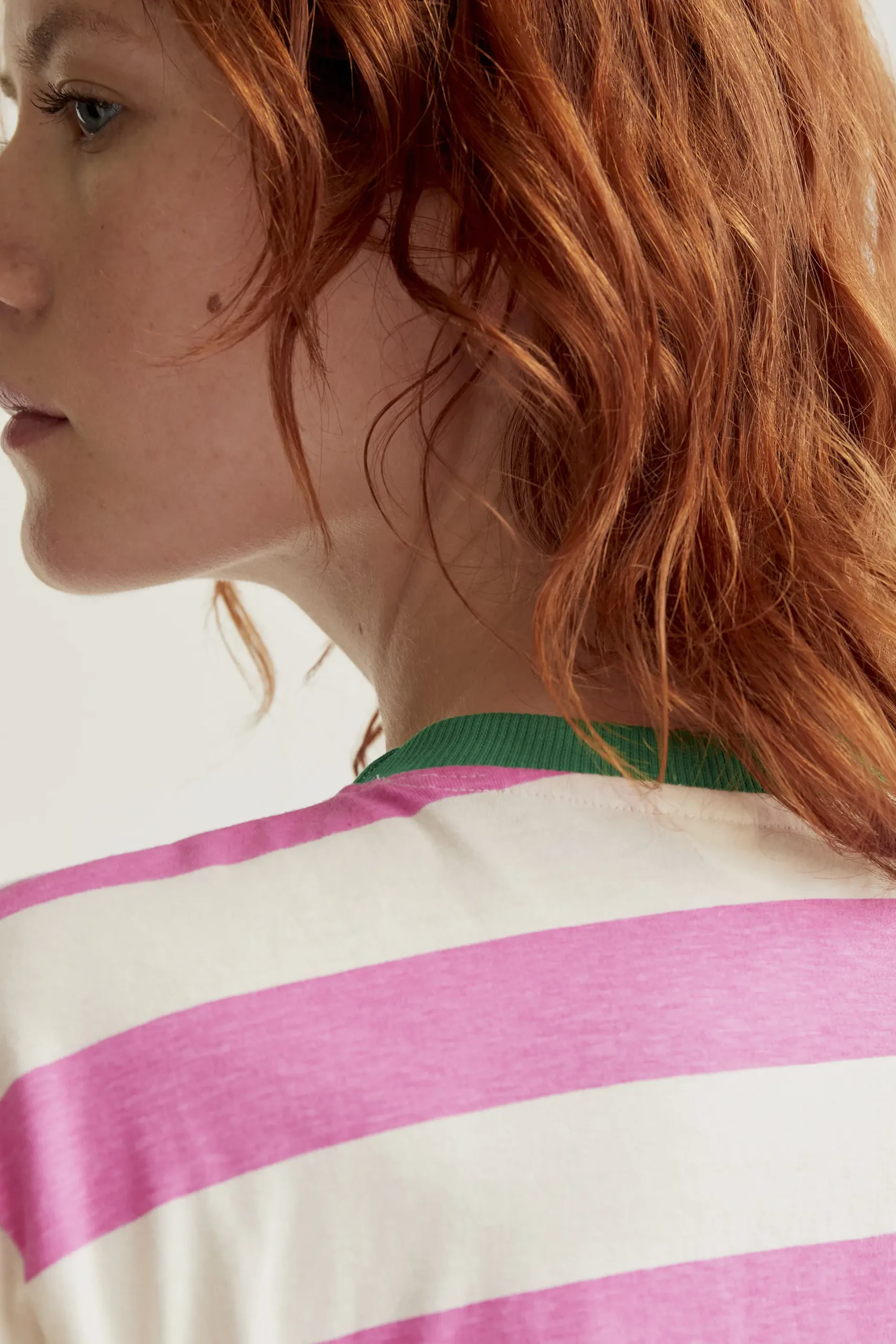 Camiseta de tejido 100% algodón con estampado de rayas de color rosa y blanco. Cuello redondo de color verde y manga corta. La modelo mide 175 cm y lleva la talla S.