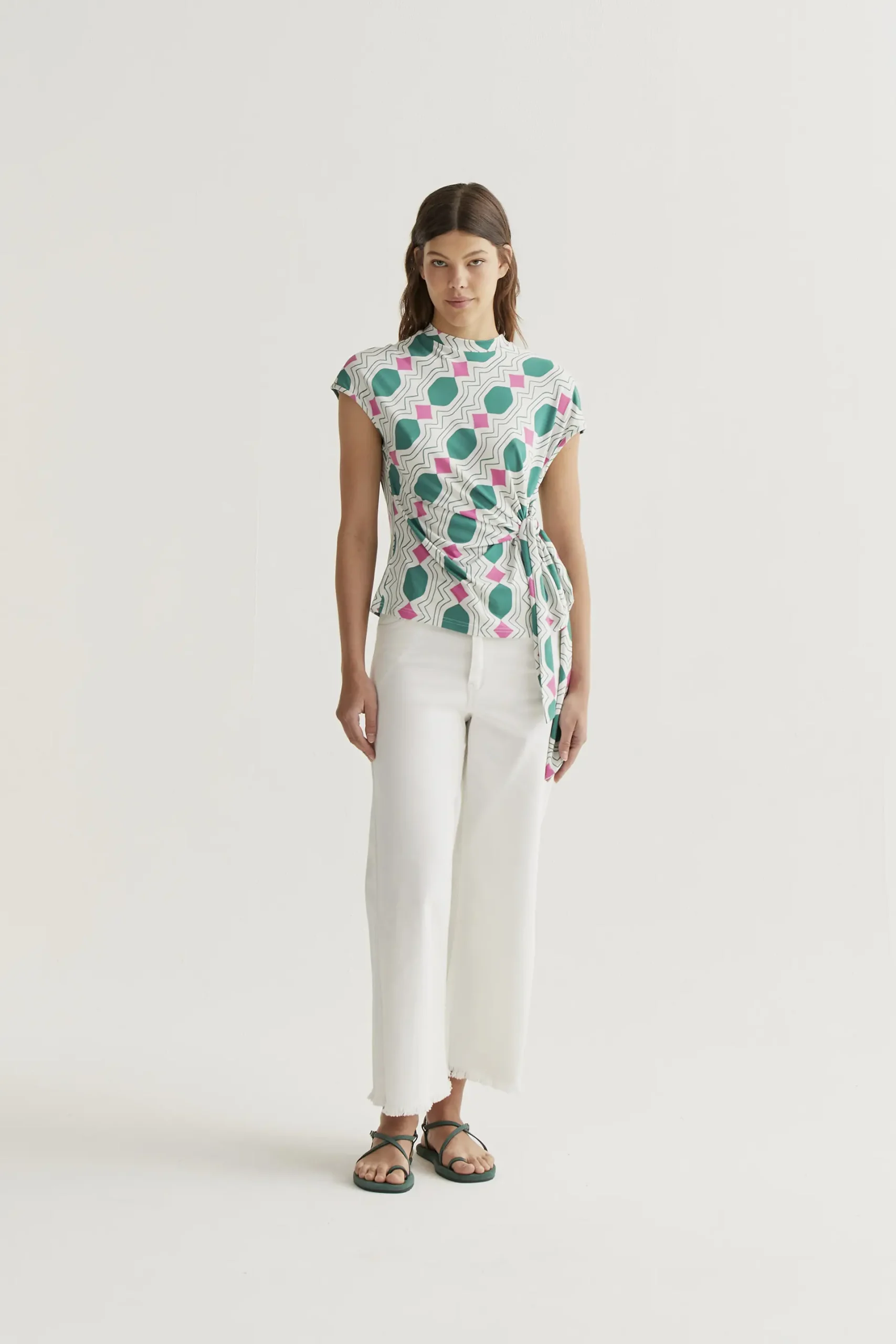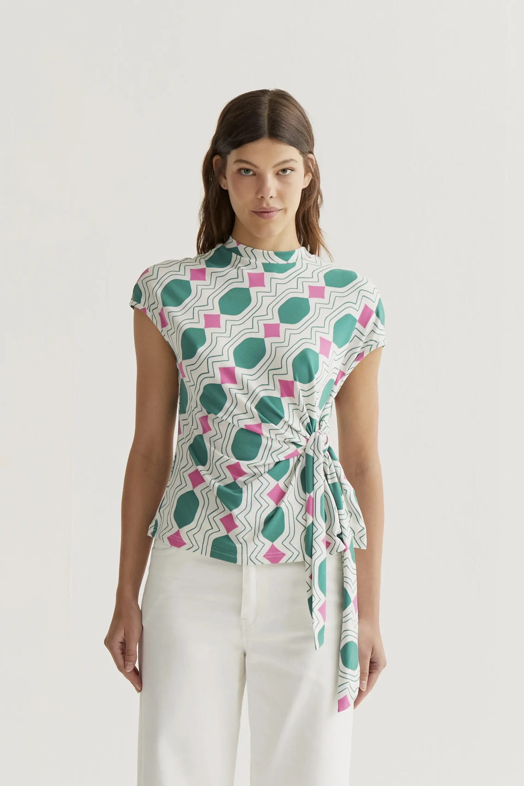 Camiseta con tejido jersey con estampado geometric. Cuello perkins y sin mangas. Detalle lazado en cintura. La modelo mide 177 cm y lleva la talla S.