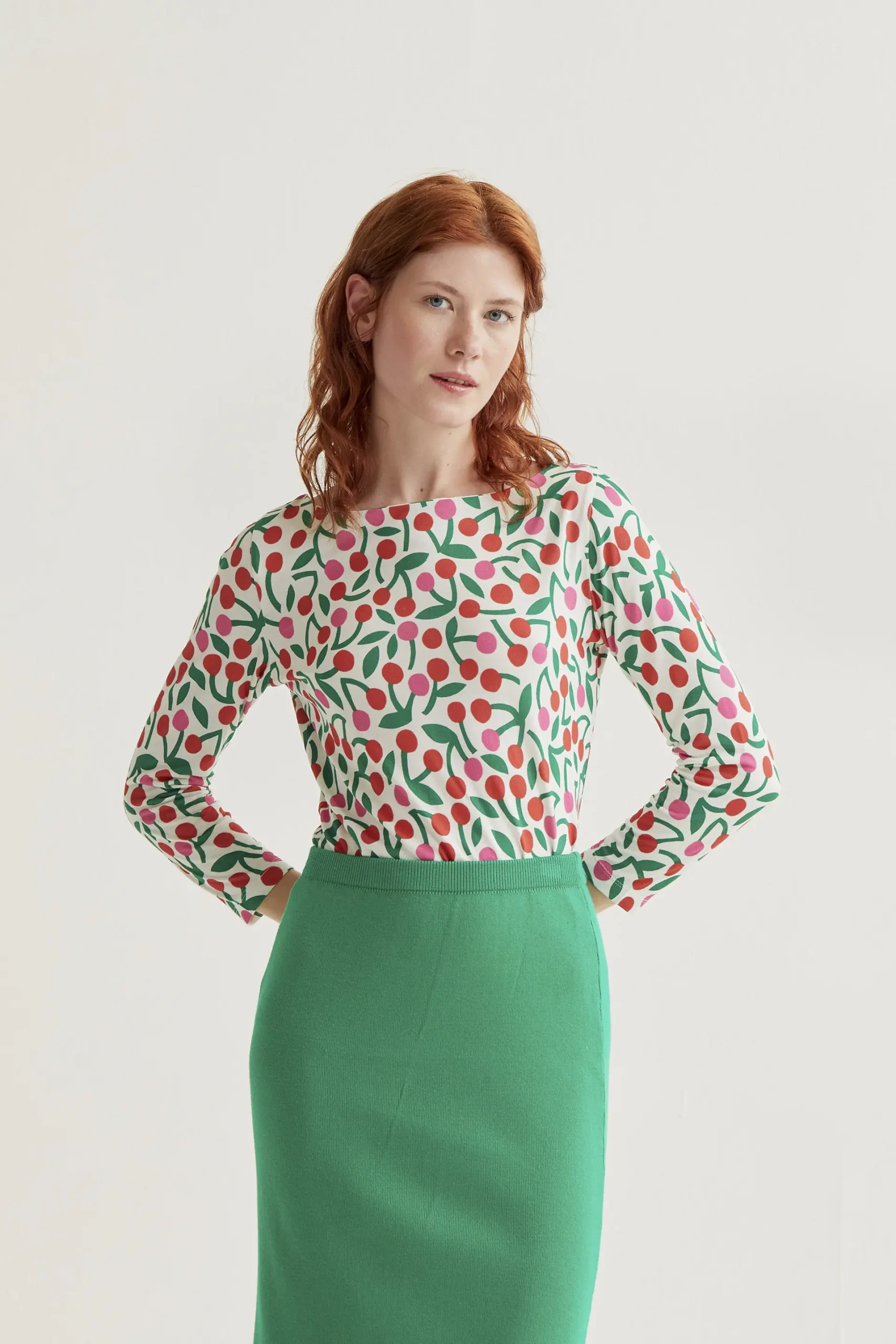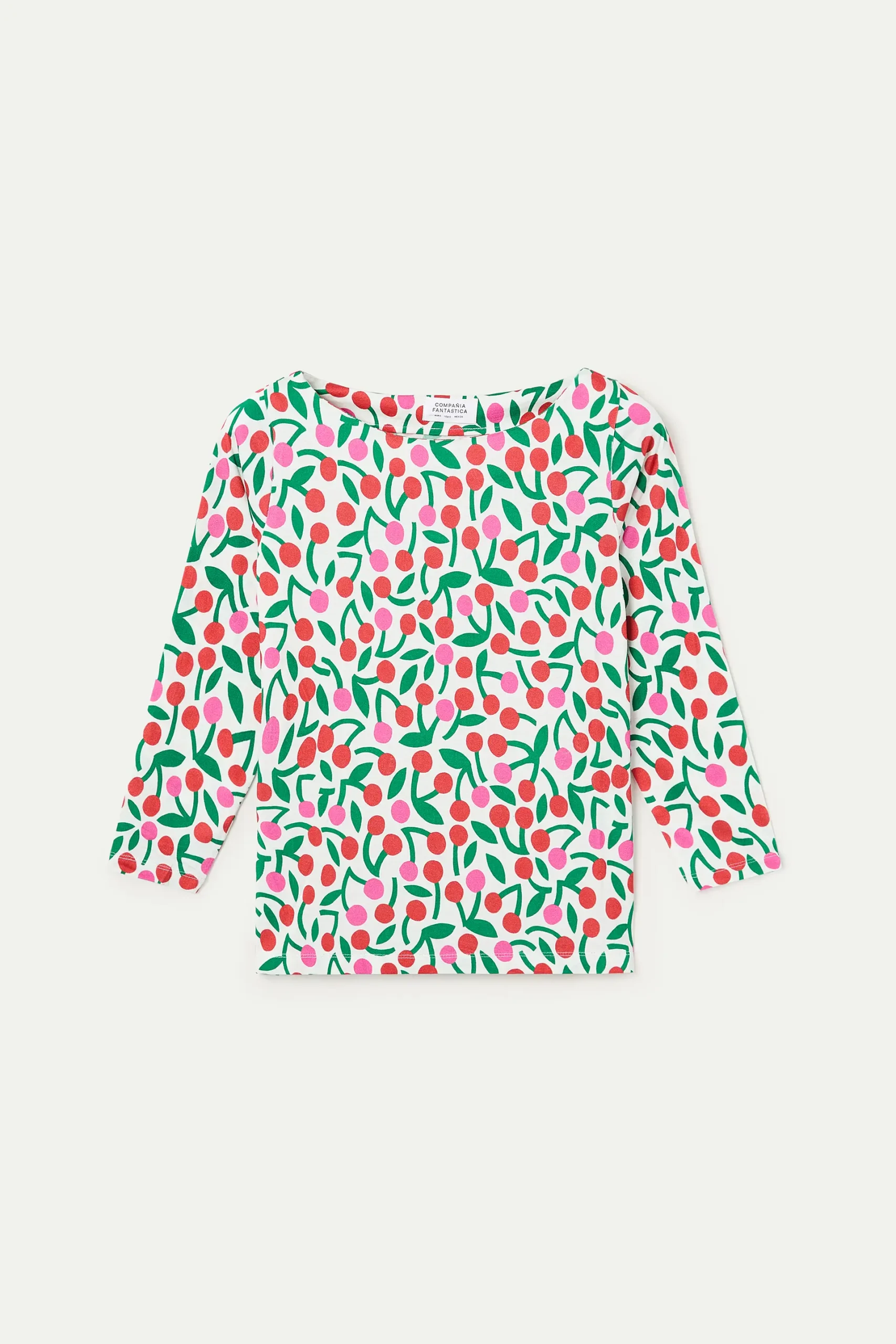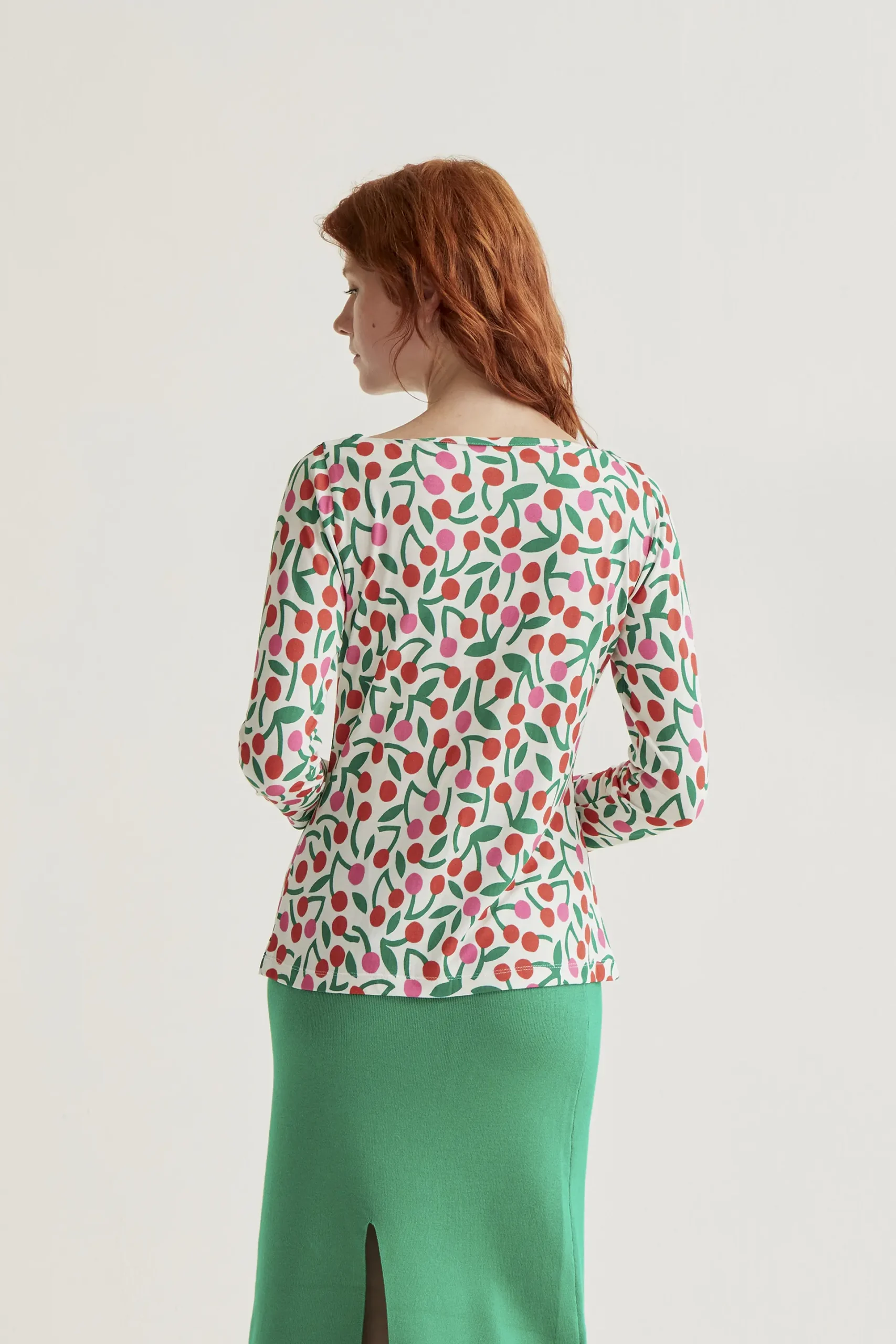 Camiseta de tejido jersey viscoso con estampado guinda. Cuello barco y manga larga. Hombros ligeramente caídos. La modelo mide 175 cm y lleva la talla S.
