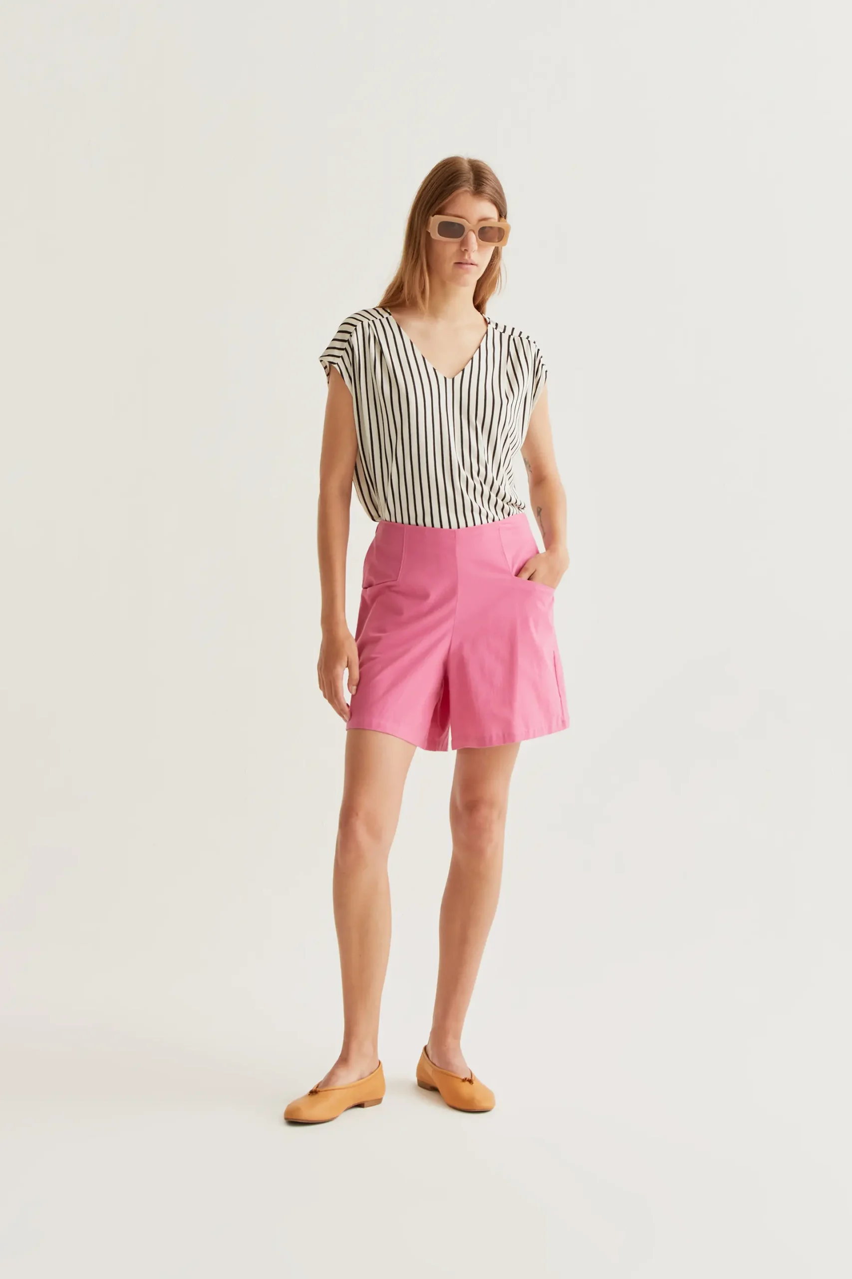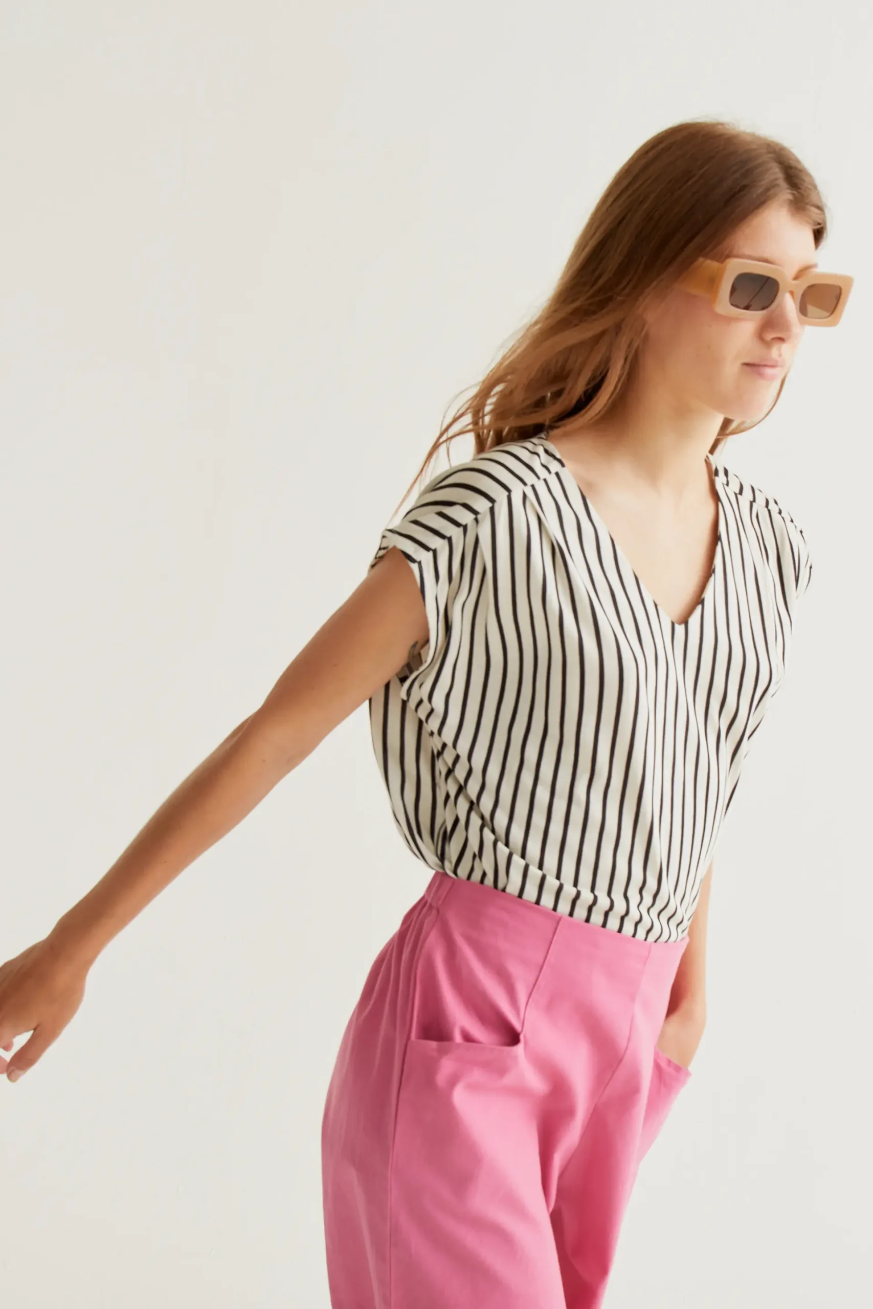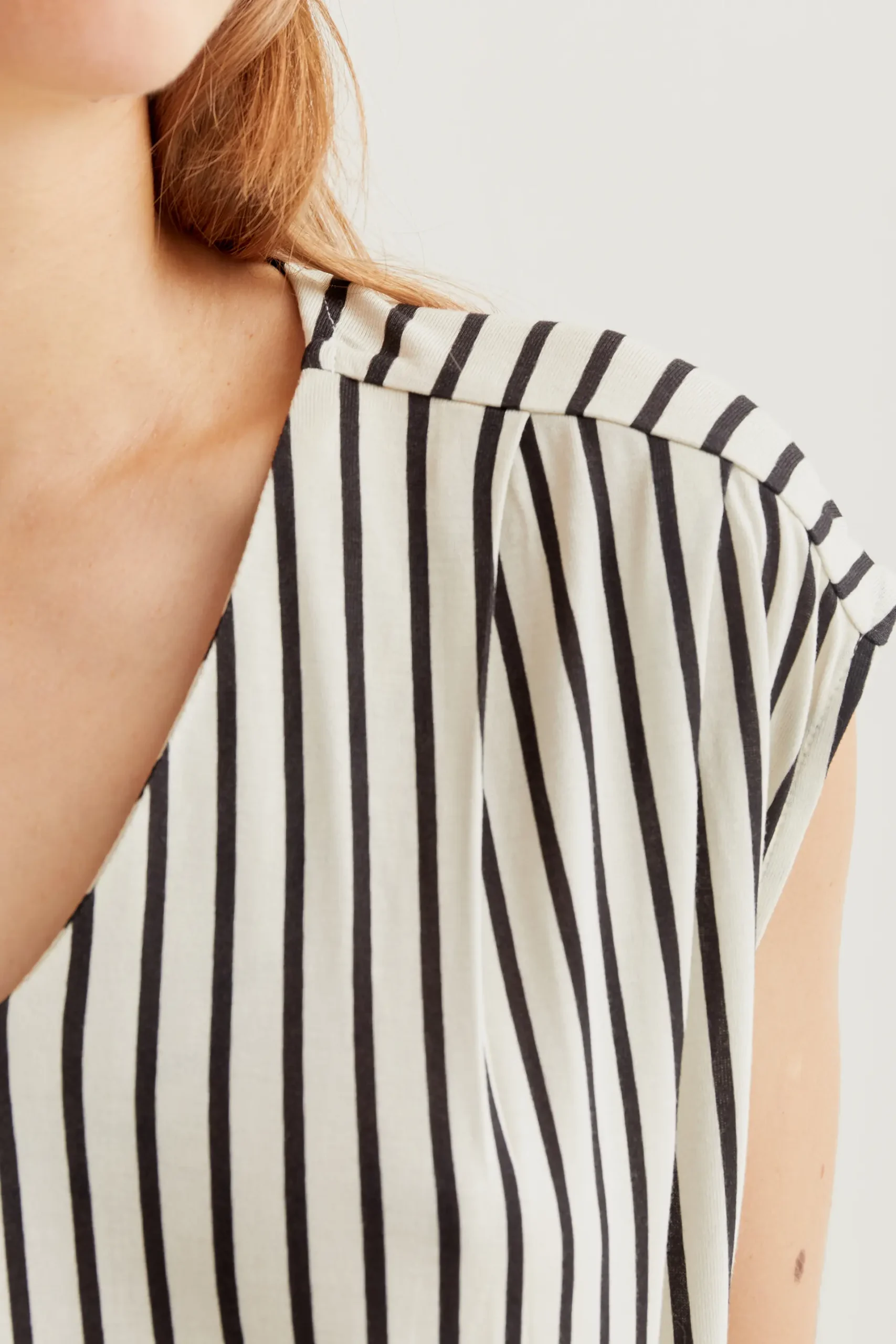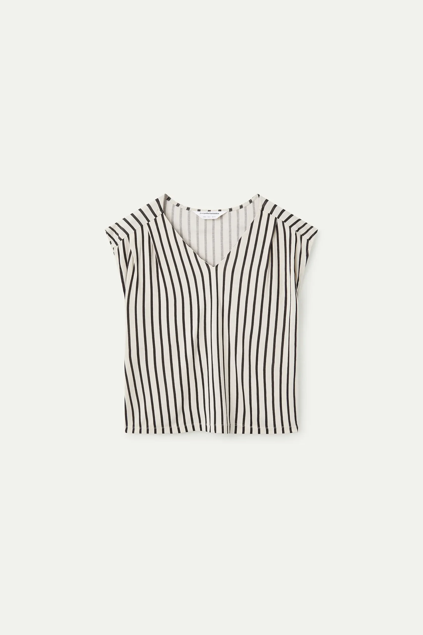 Camiseta de tejido jersey viscoso con estampado de rayas de color negro. Escote pico y manga corta. La modelo mide 177 cm y lleva la talla S.