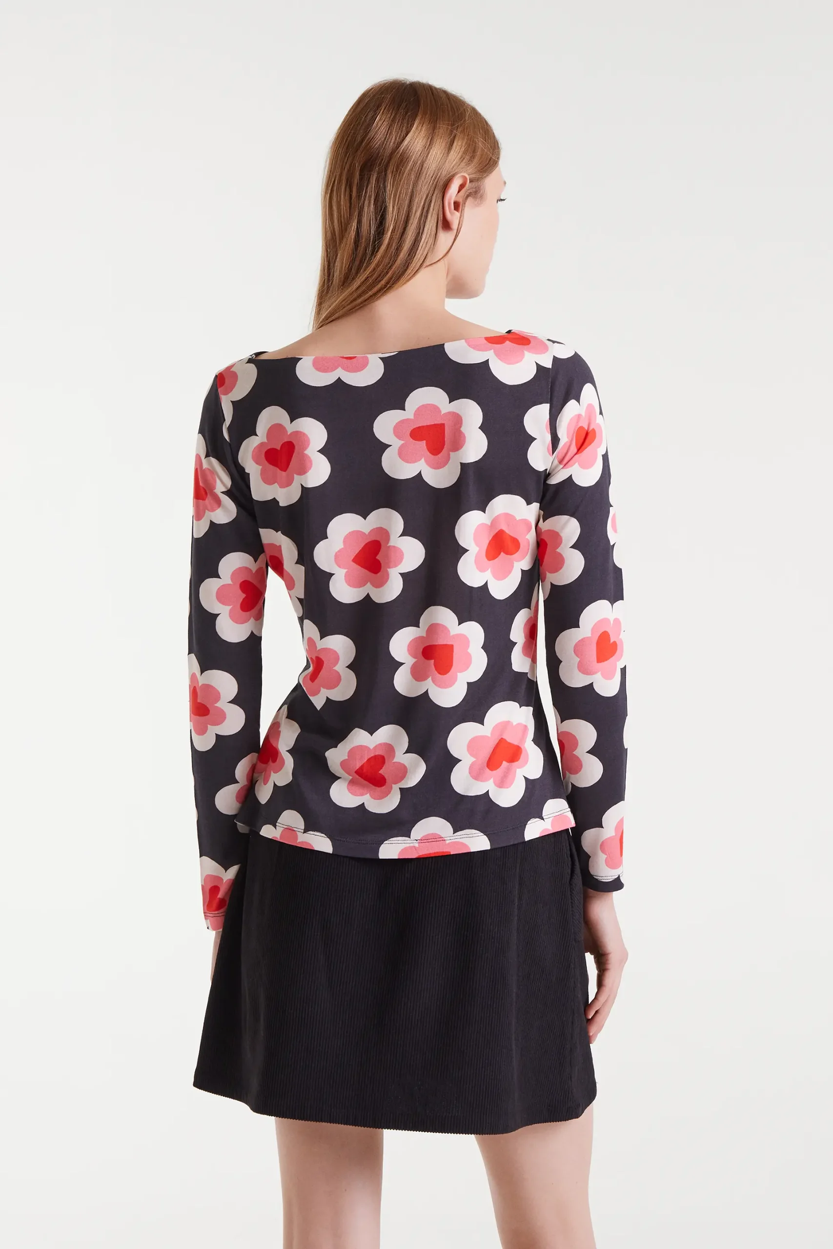 Camiseta con estampado SweetHeart. Con escote barco y manga larga. La modelo mide 179 cm y lleva la talla S.