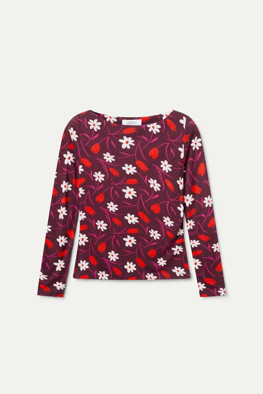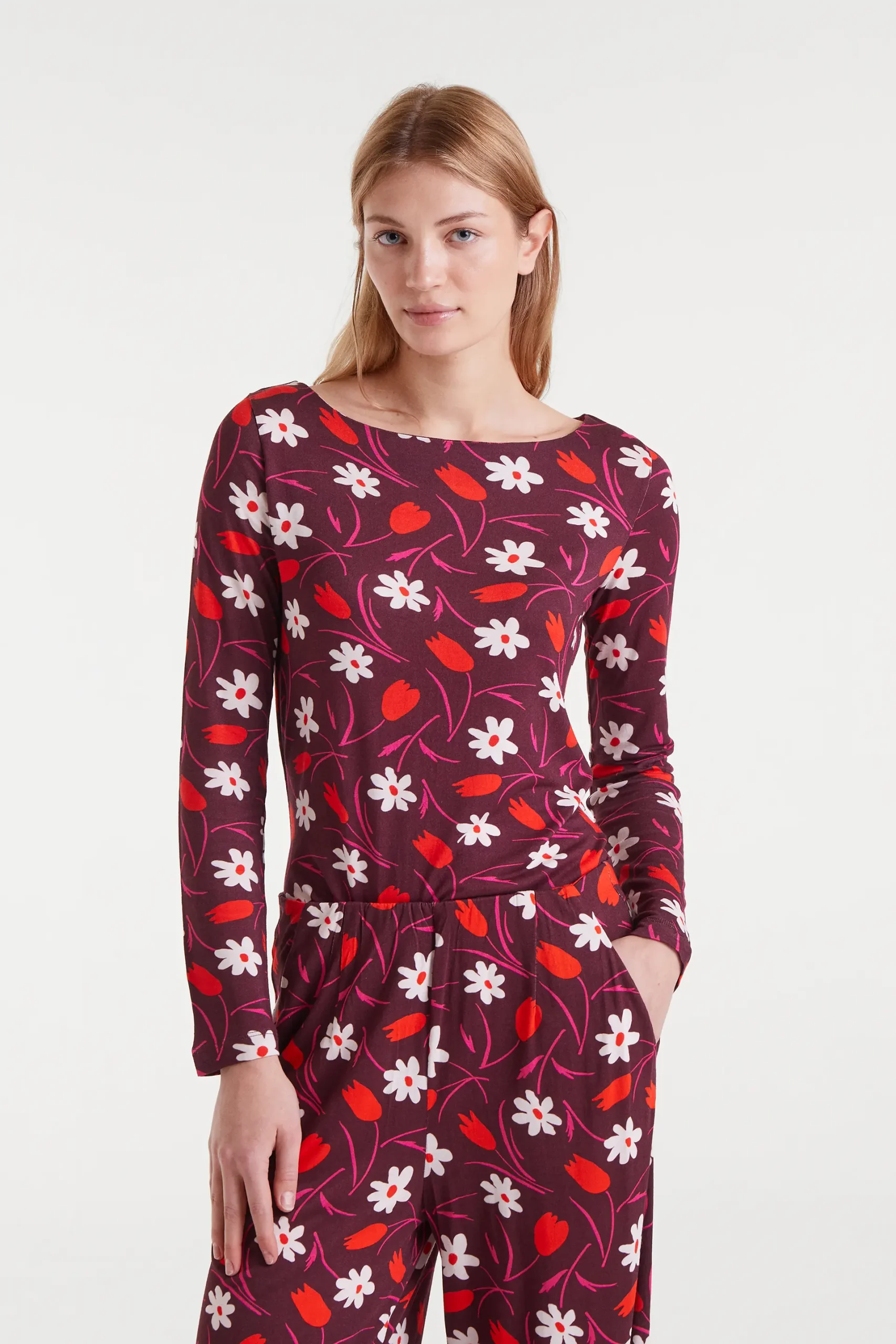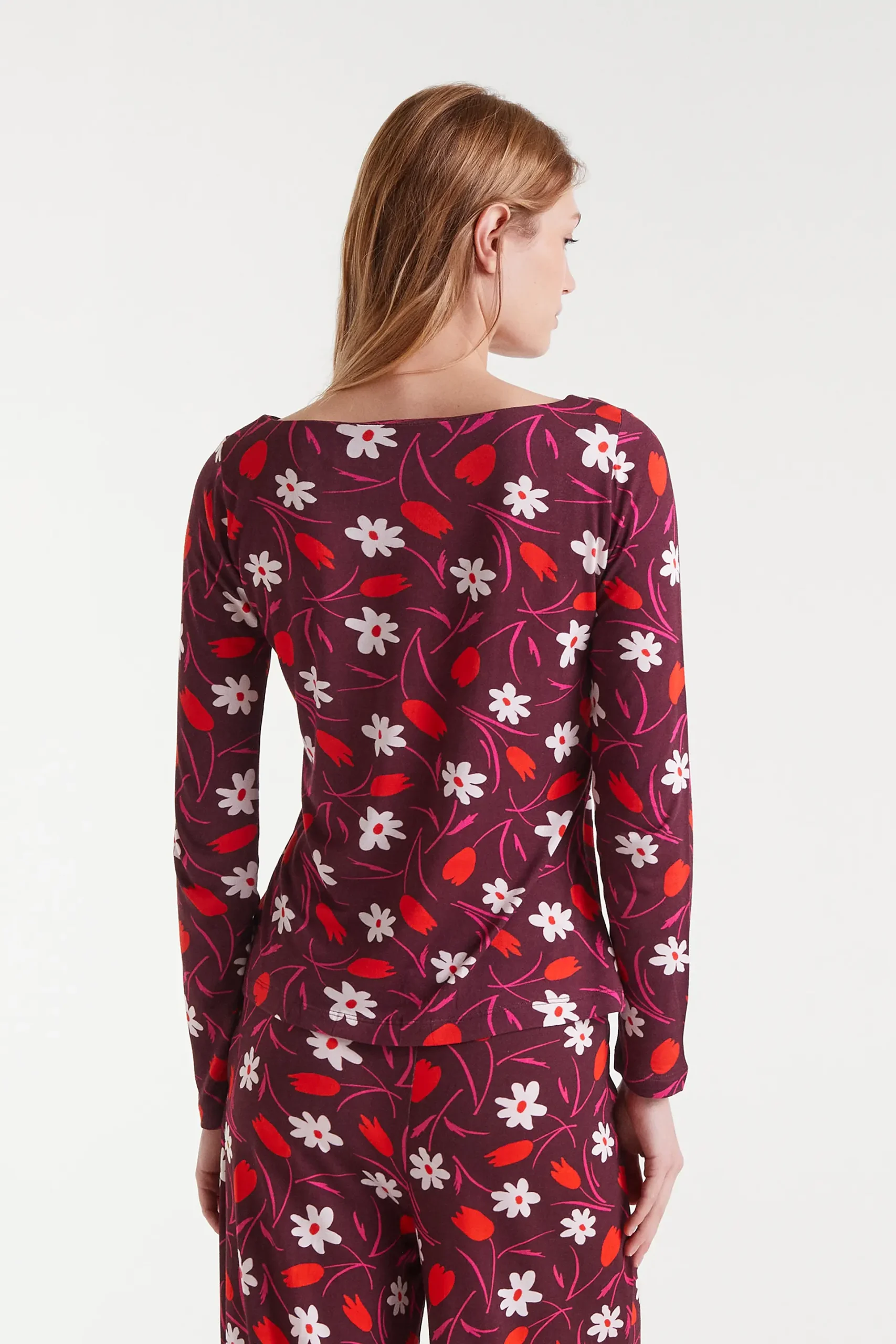 Camiseta con tejido estampado Tulip. Con cuello barco y manga larga. La modelo mide 179 cm y lleva la talla S.