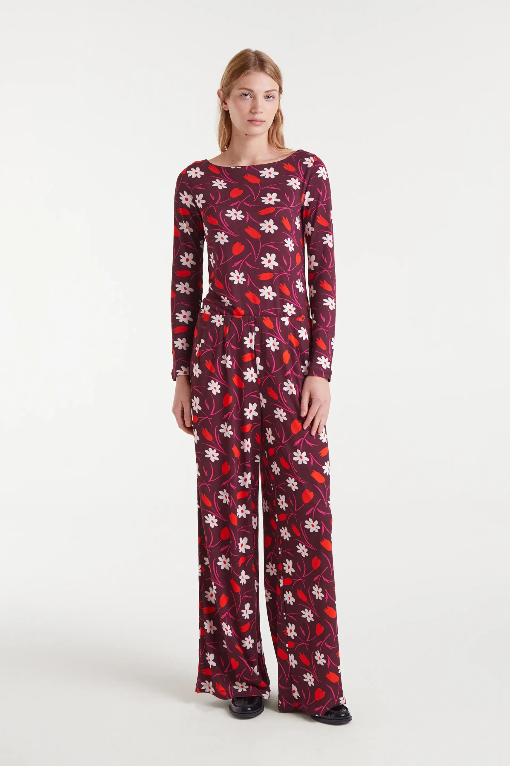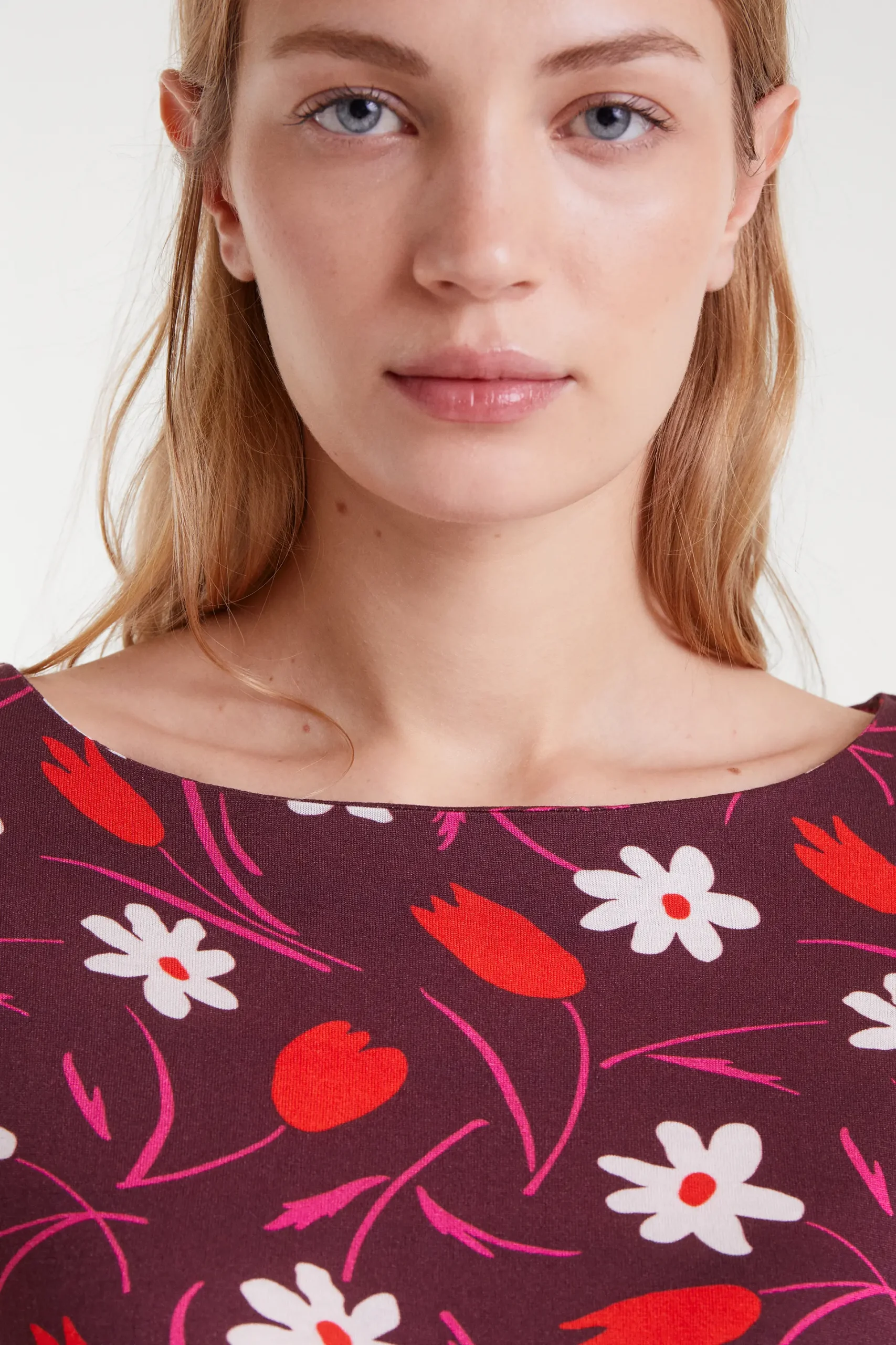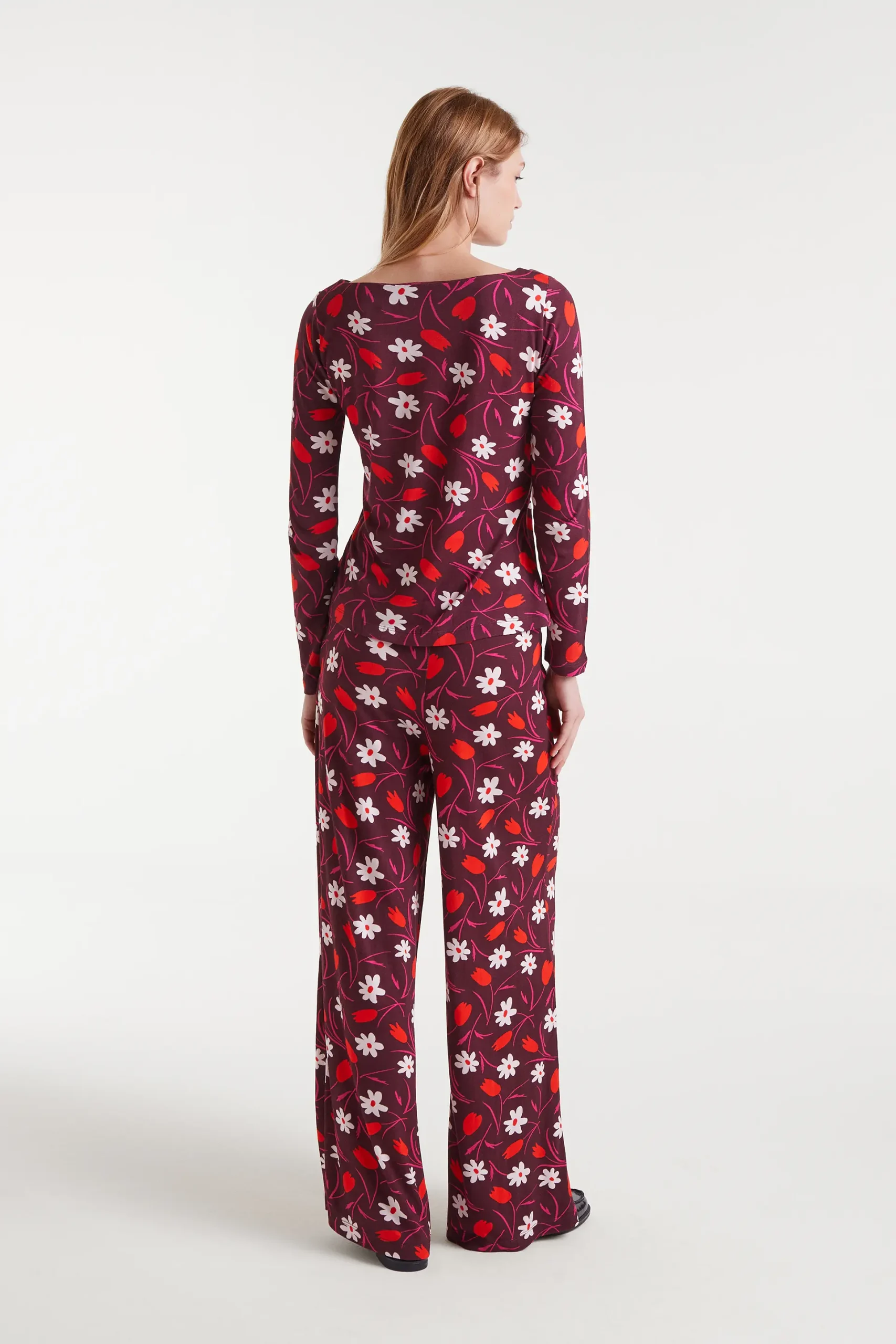 Camiseta con tejido estampado Tulip. Con cuello barco y manga larga. La modelo mide 179 cm y lleva la talla S.