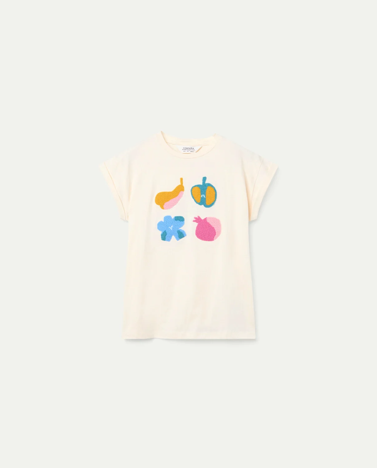 Camiseta de color beige con parche de verduras multicolor. Cuello redondo y manga corta con vuelta.