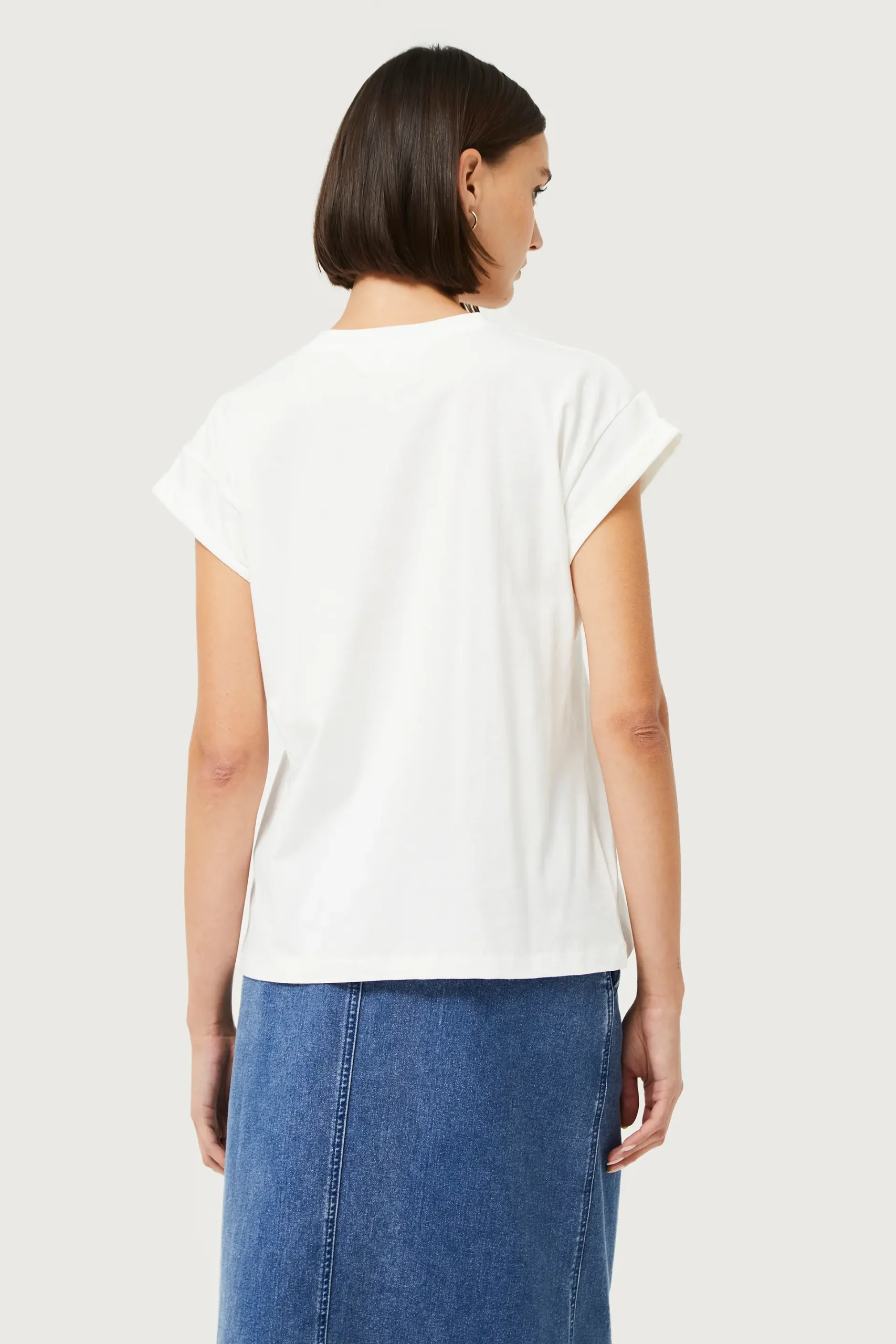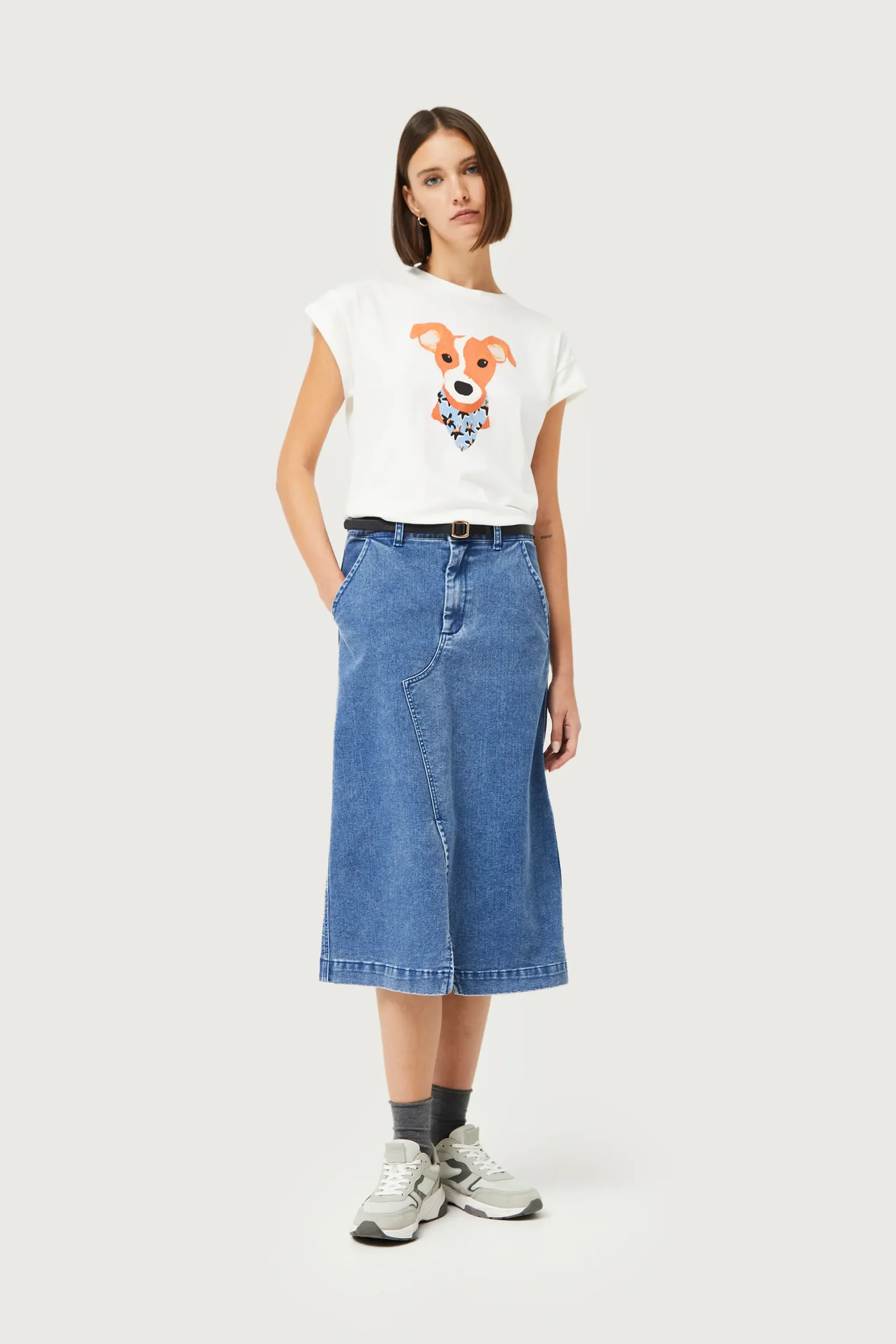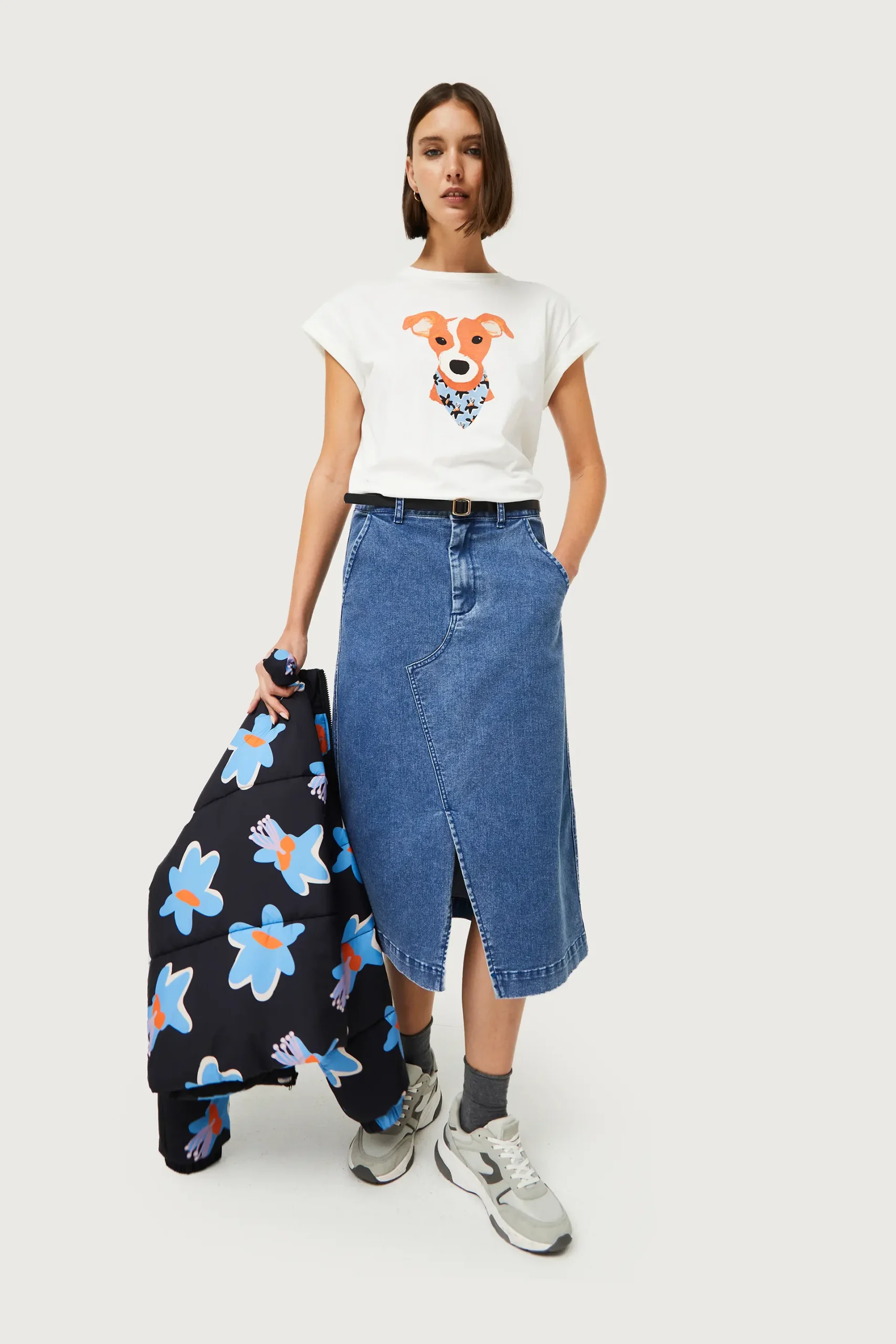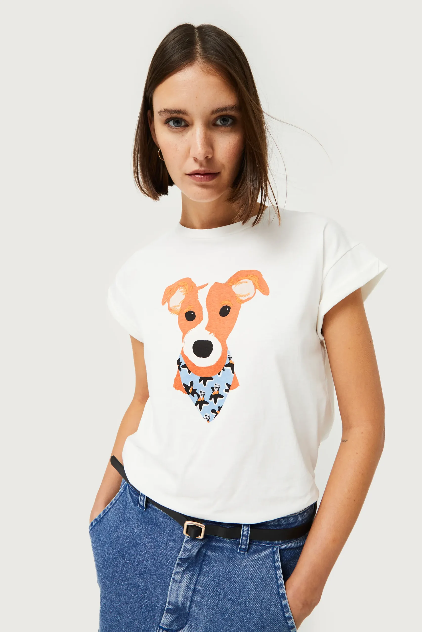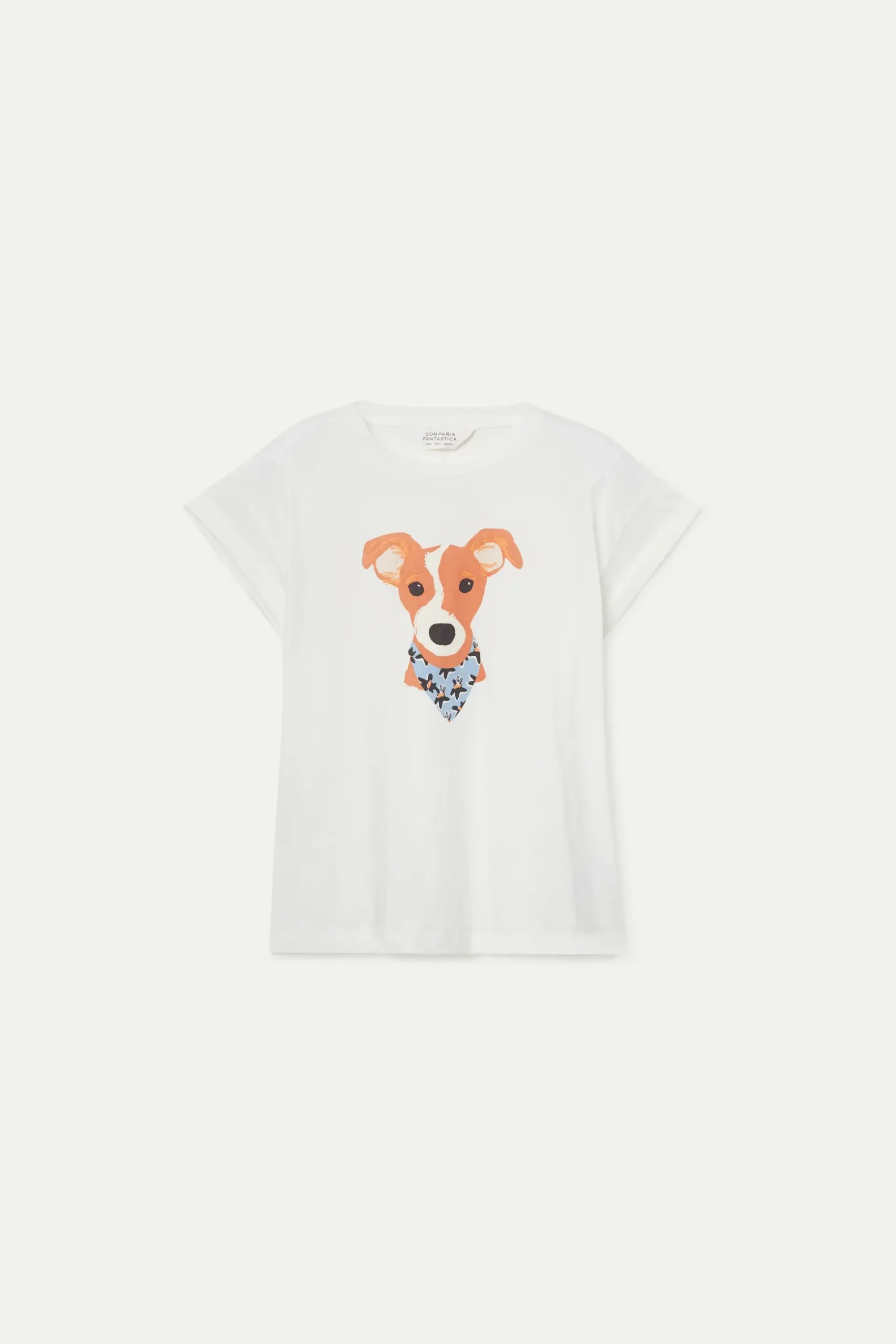 Camiseta de color blanco con estampado gráfico de perro con pañuelo con estampado de flores azules, negras y amarillas. Con cuello redondo y manga corta. La modelo mide 176 cm y lleva la talla S.