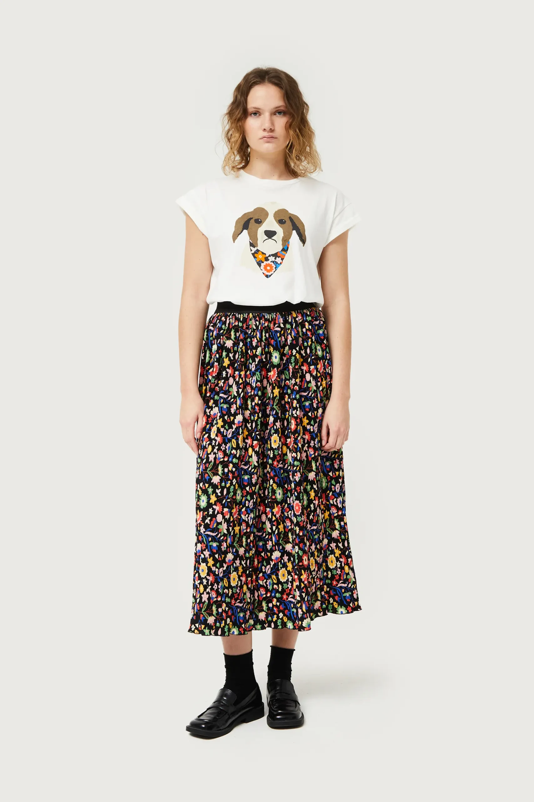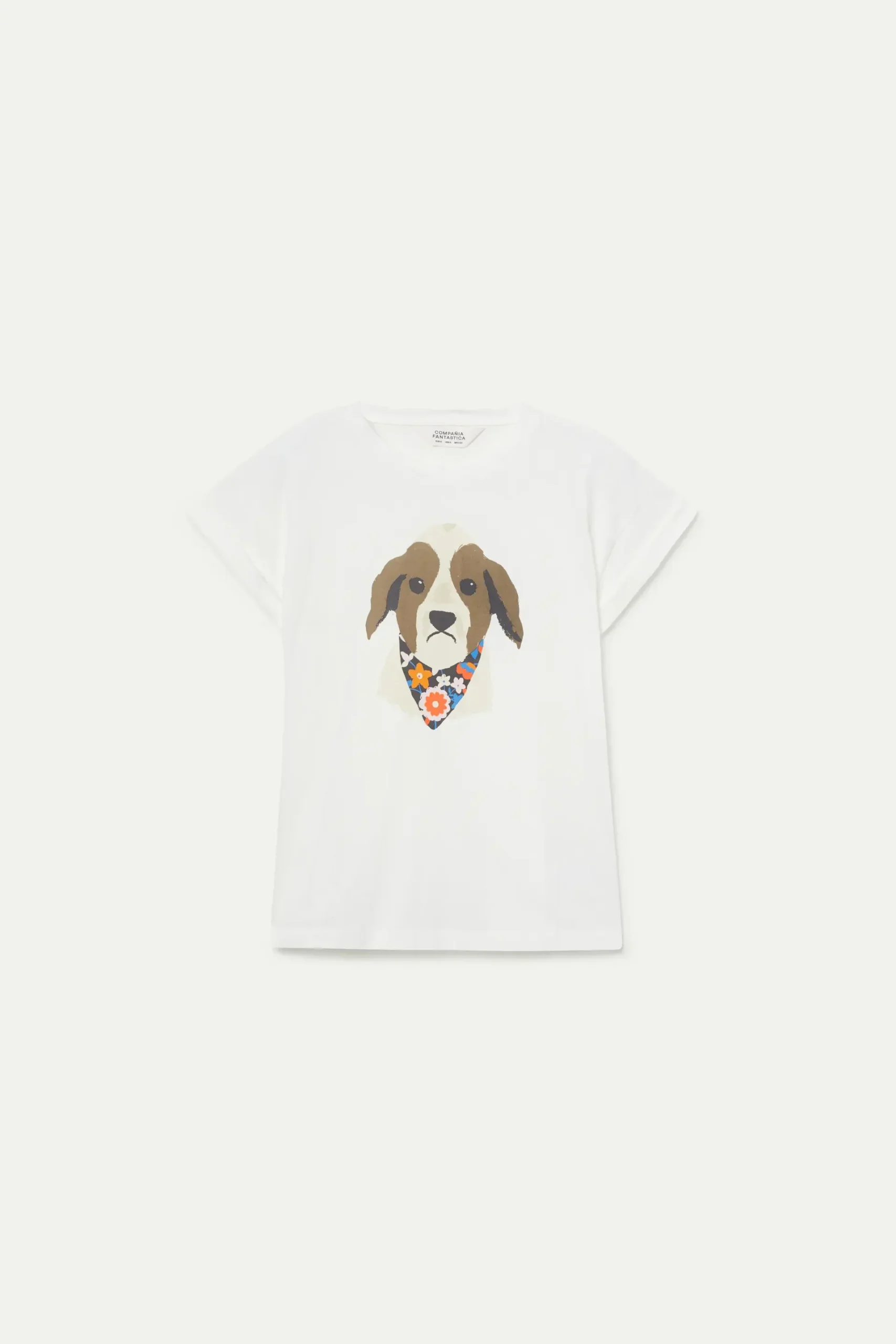 Camiseta de color blanco con estampado gráfico de perro con pañuelo con estampado floral. Con cuello redondo y manga corta. La modelo mide 175 cm y lleva la talla S.