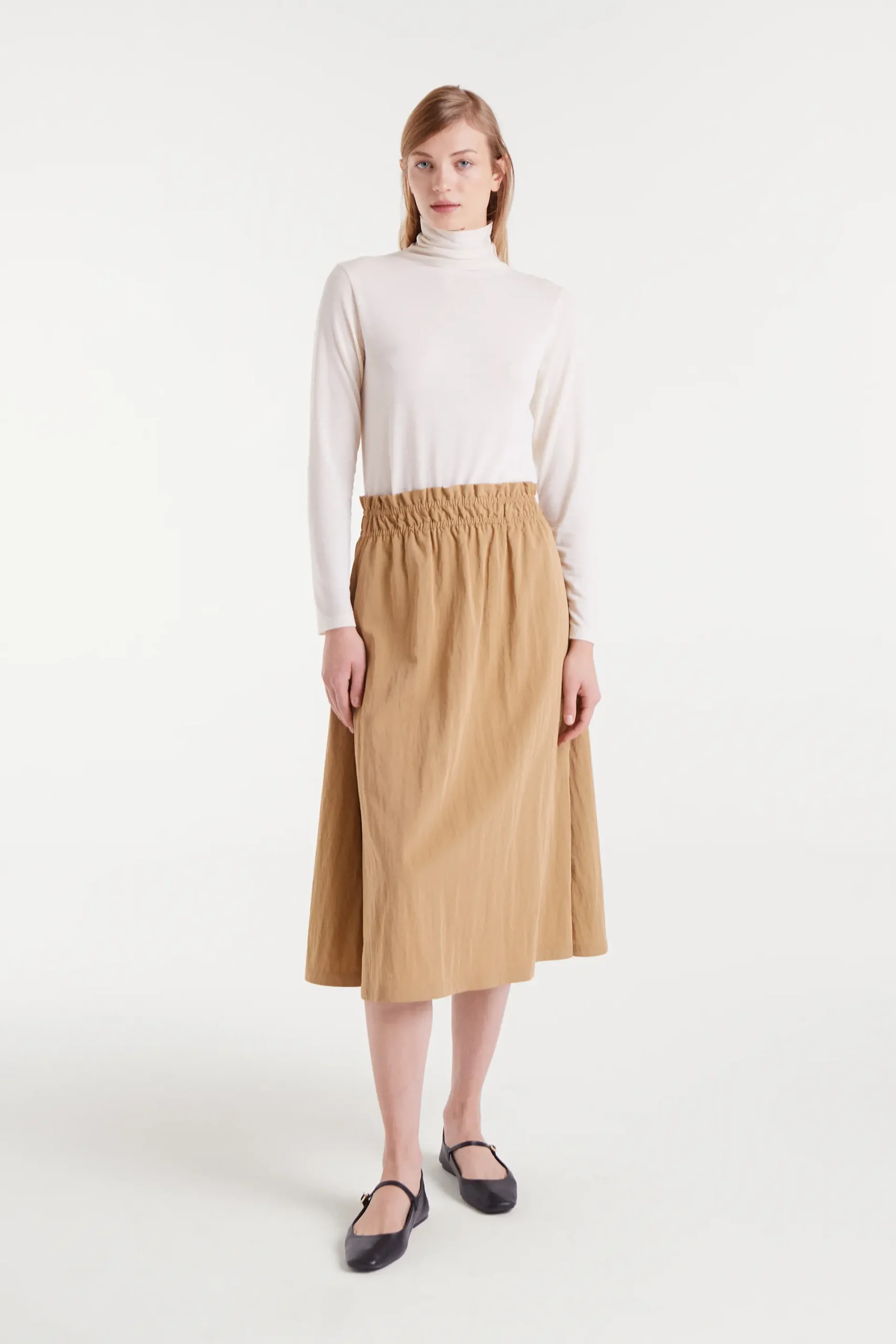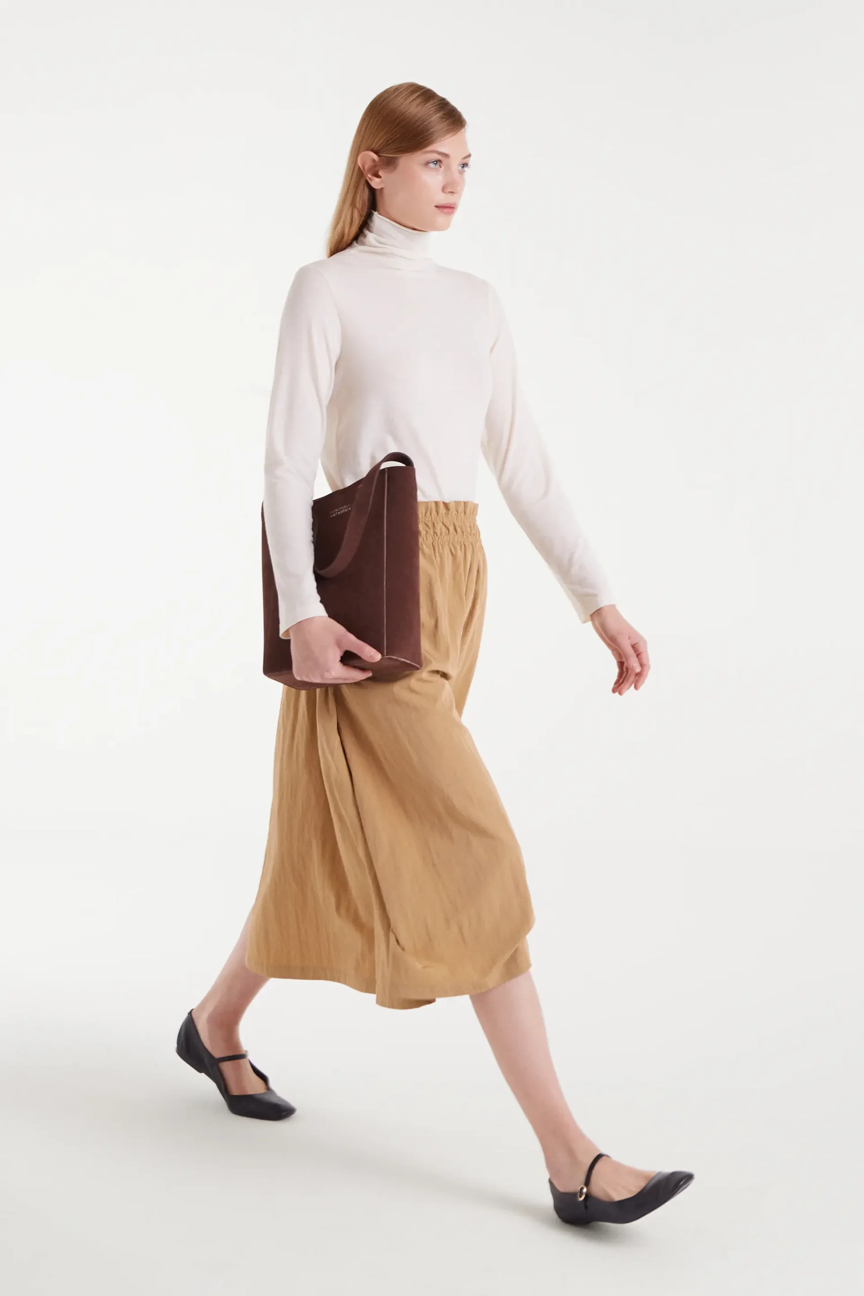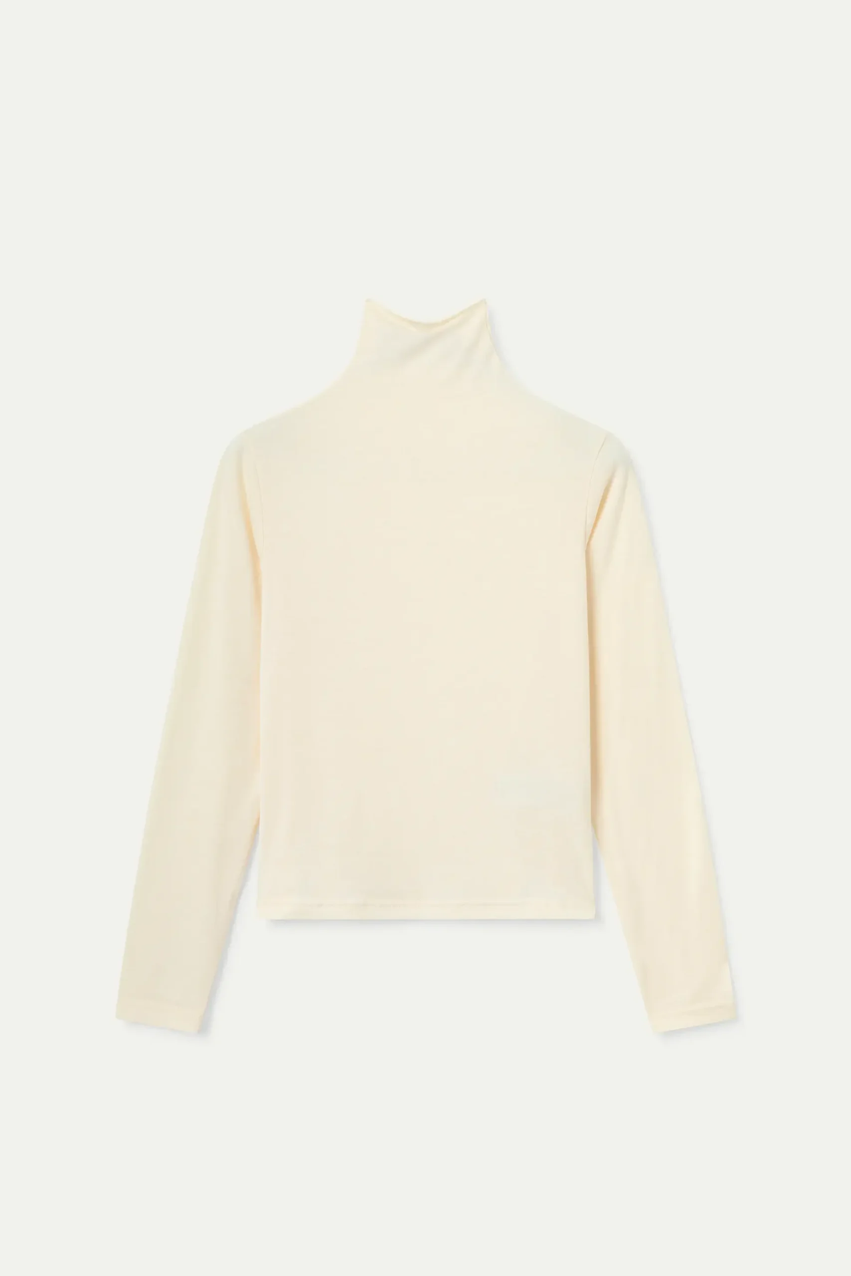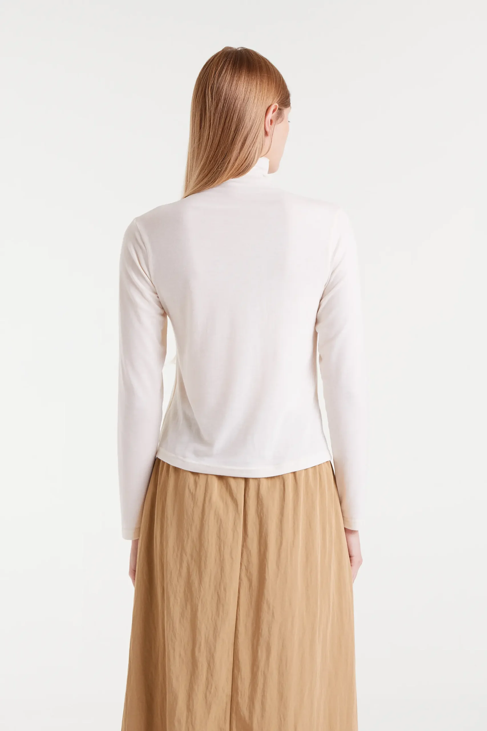 Camiseta de color blanco. Con cuello alto y manga larga. La modelo mide 179 cm y lleva la talla S.