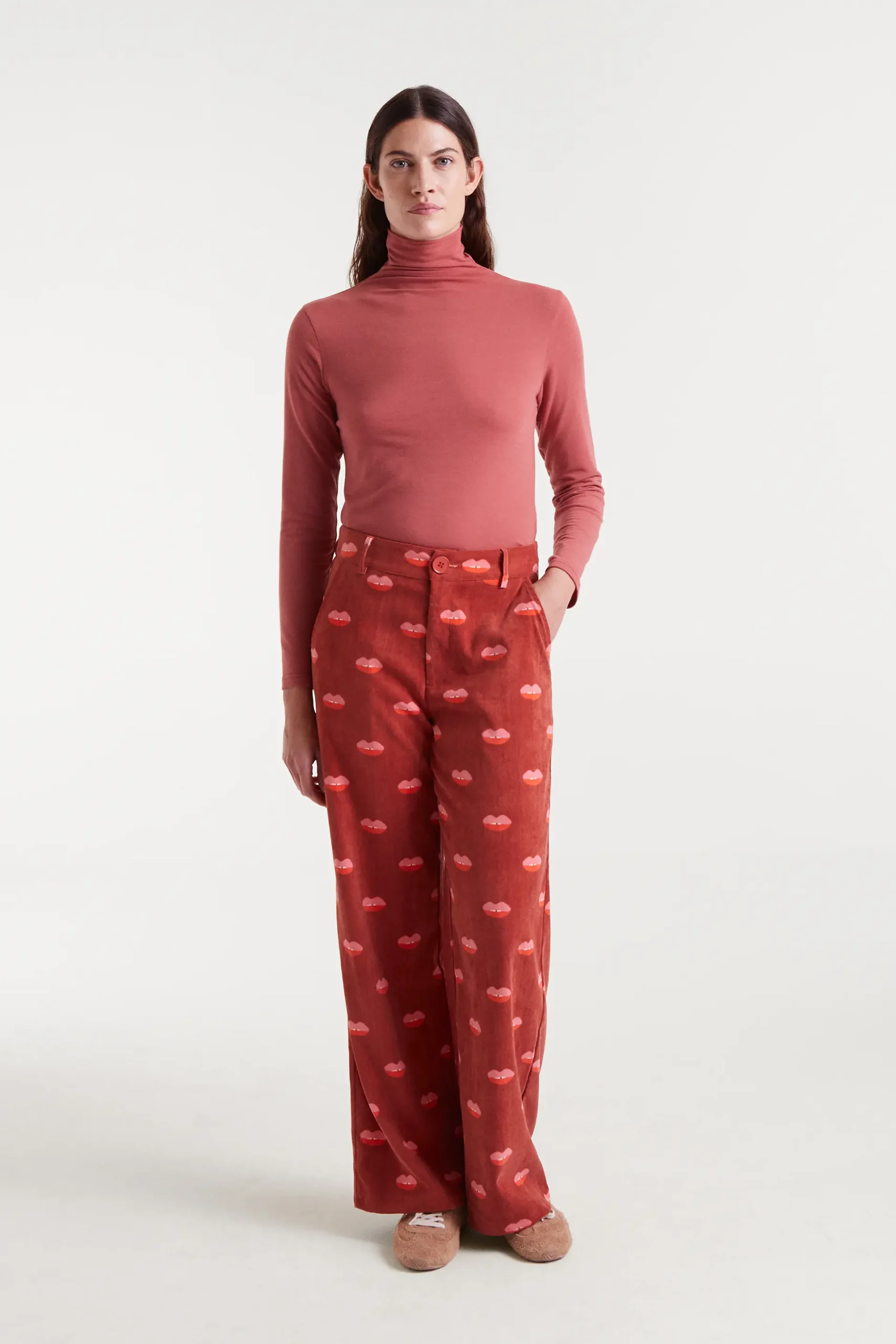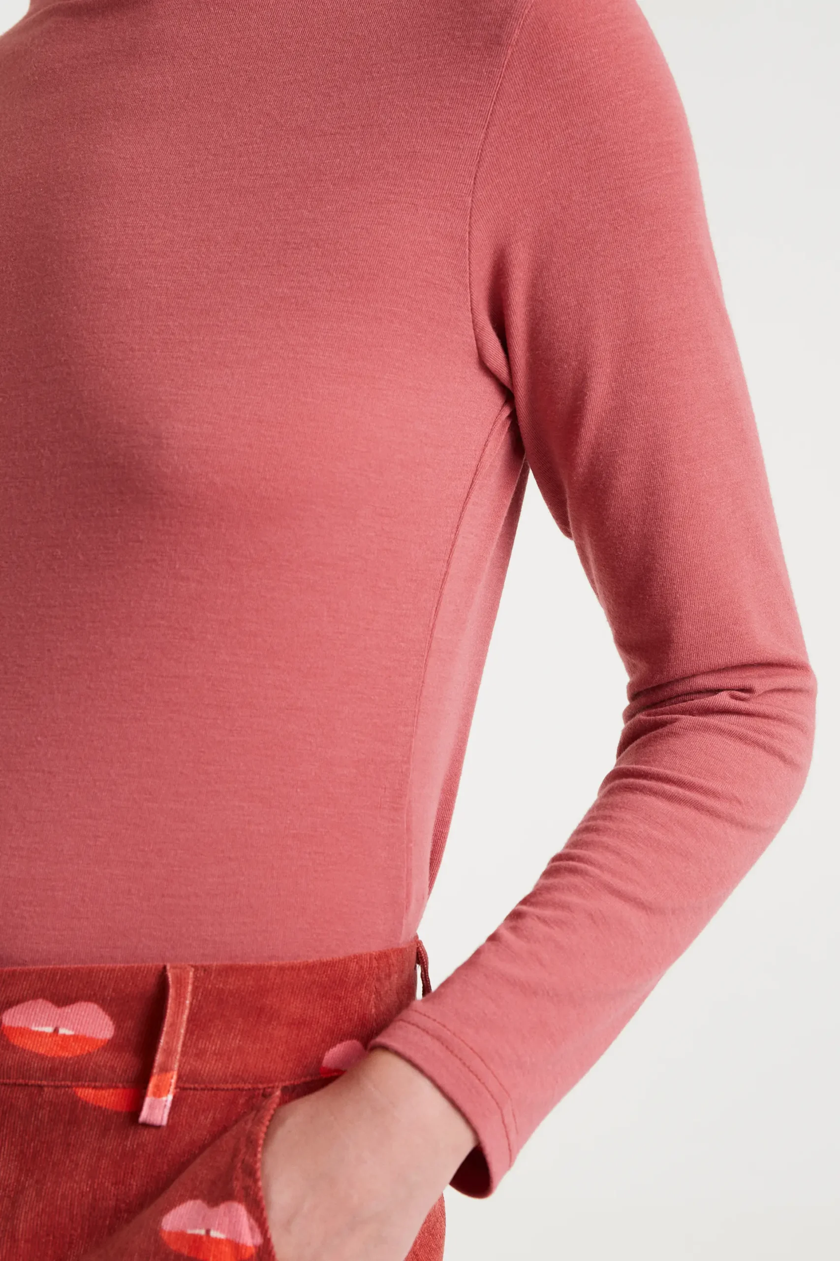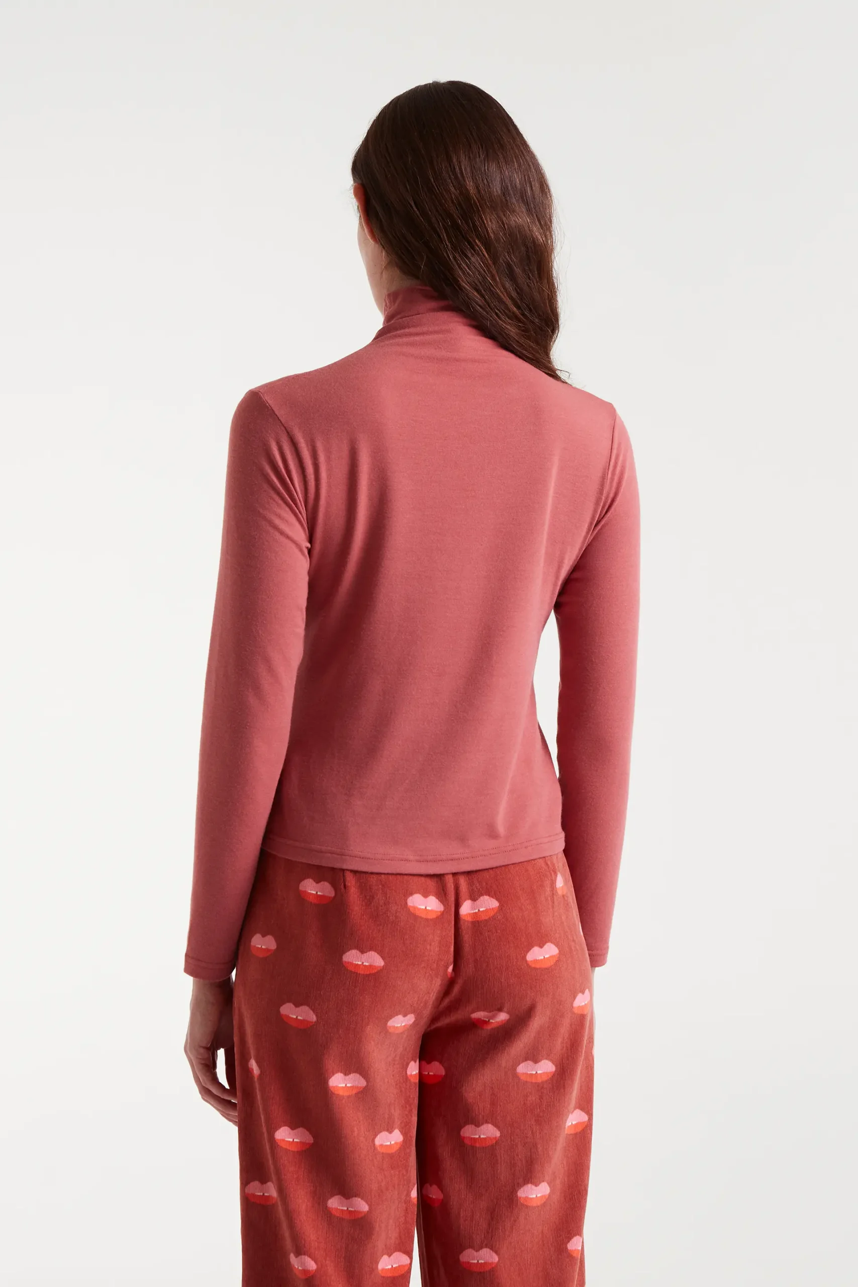 Camiseta de color terracota. Con cuello alto y manga larga. La modelo mide 177 cm y lleva la talla S.
