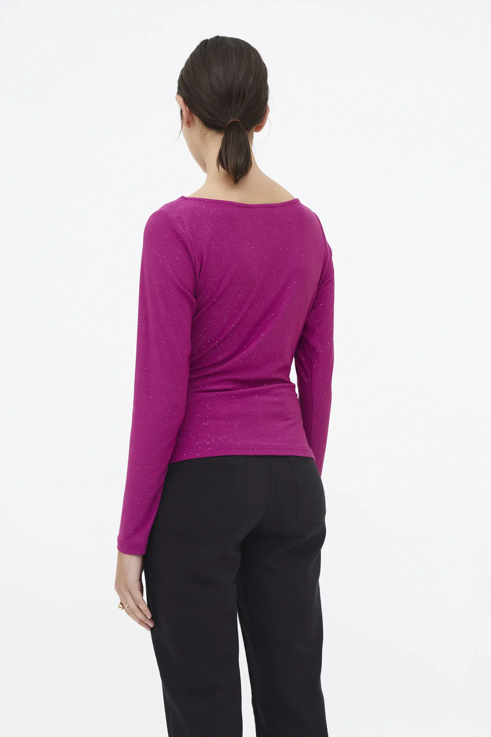 Camiseta de tejido crepé con lurex de color magenta. Cuello barco y manga larga. Diseño con ligeros pliegues. La modelo mide 177 cm y lleva la talla S.