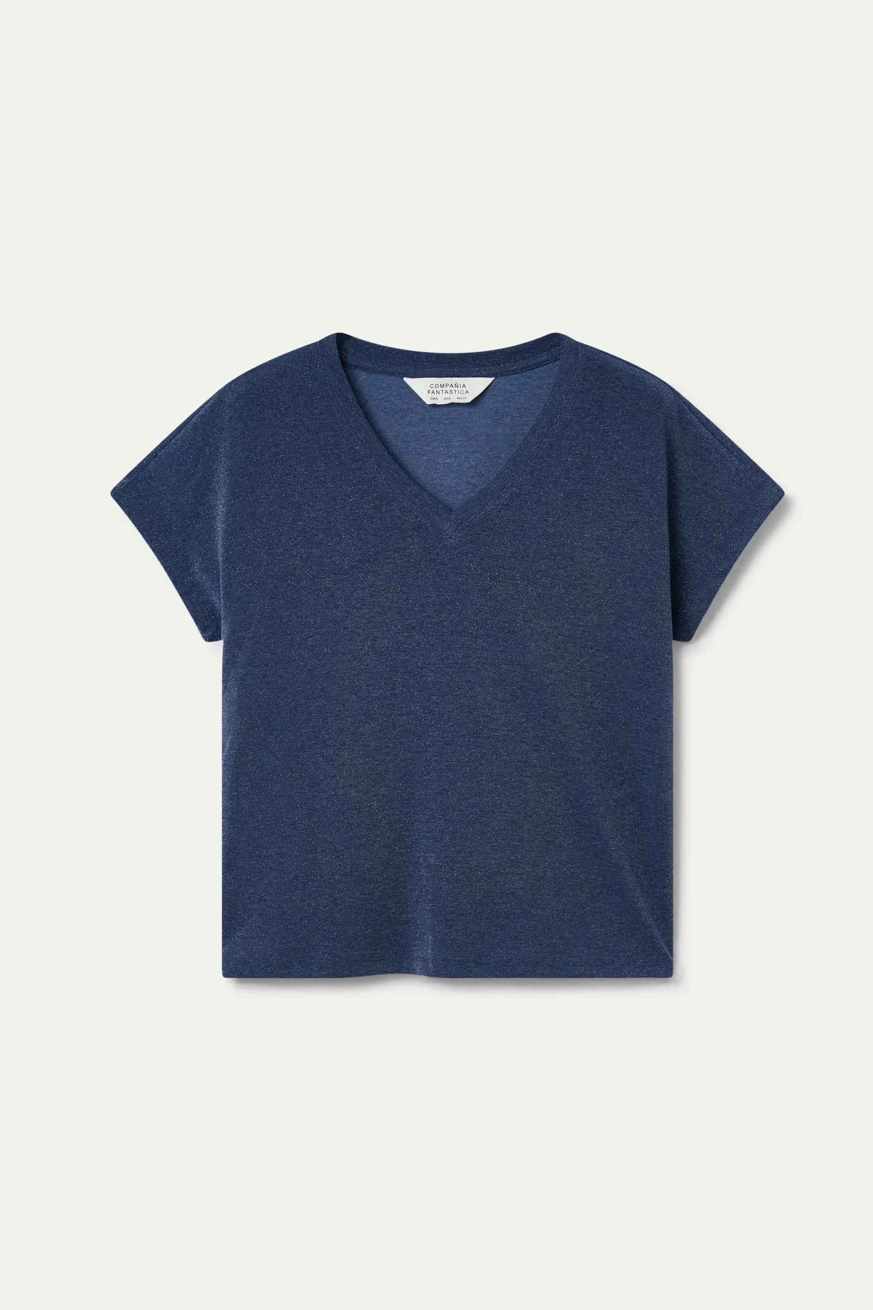 Camiseta de tejido jersey con lurex de color navy blue. Con cuello pico y manga corta. La modelo mide 177 cm y lleva la talla S.