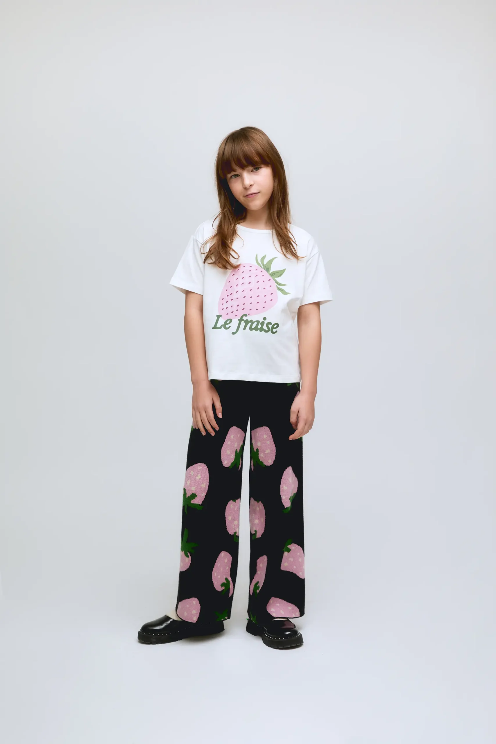 Camiseta de manga corta blanca de niña con estampado de fresa.