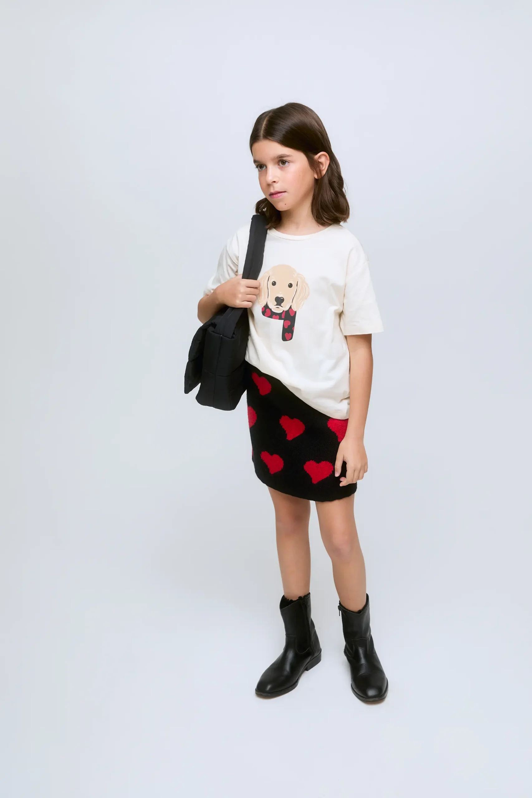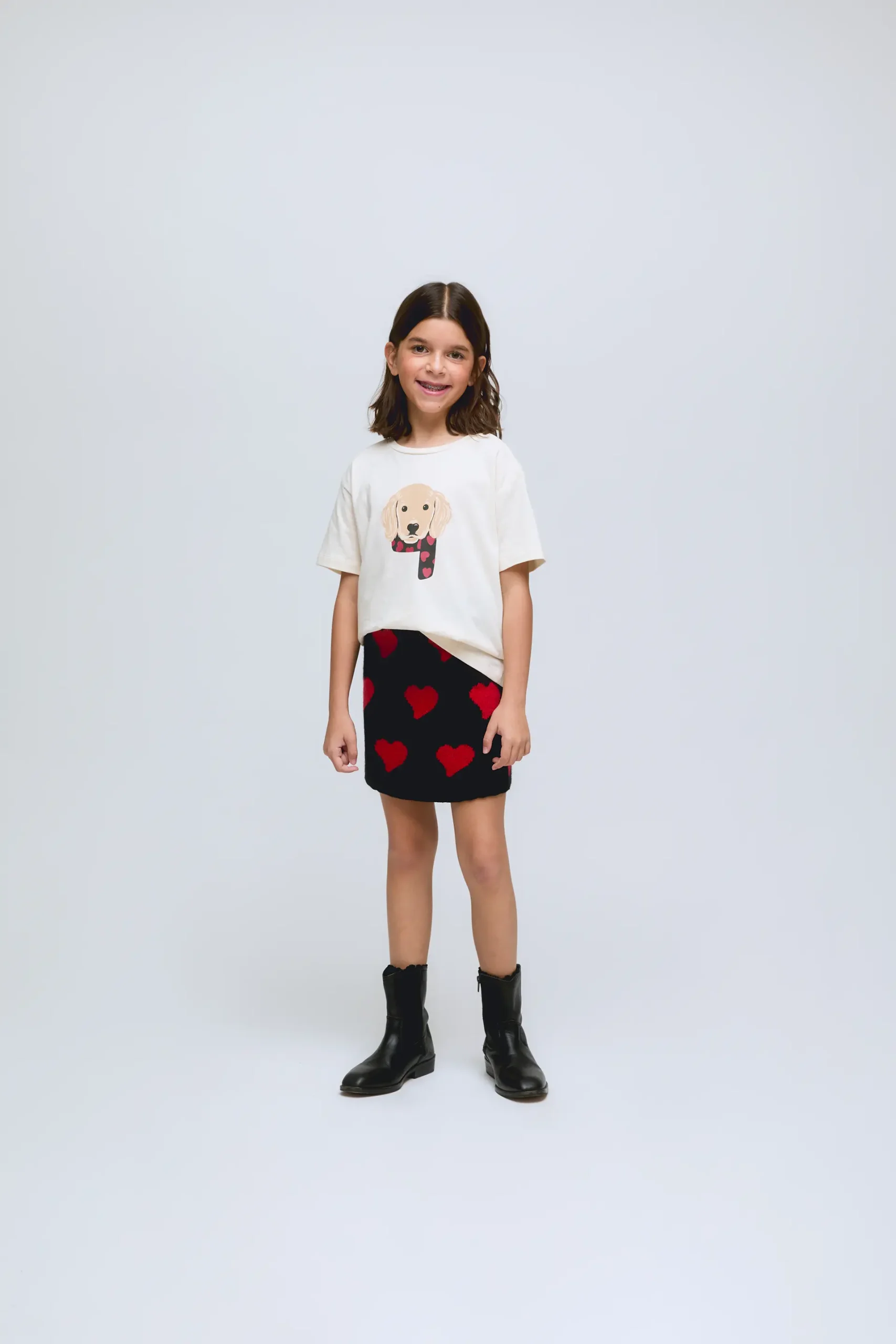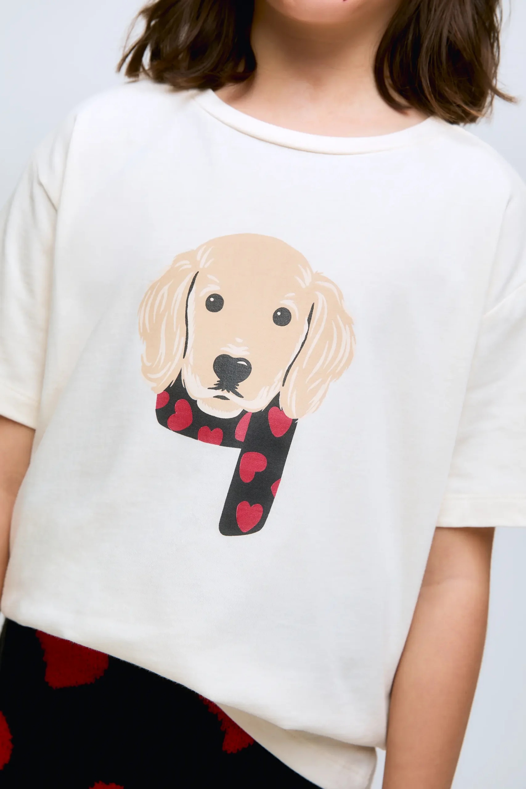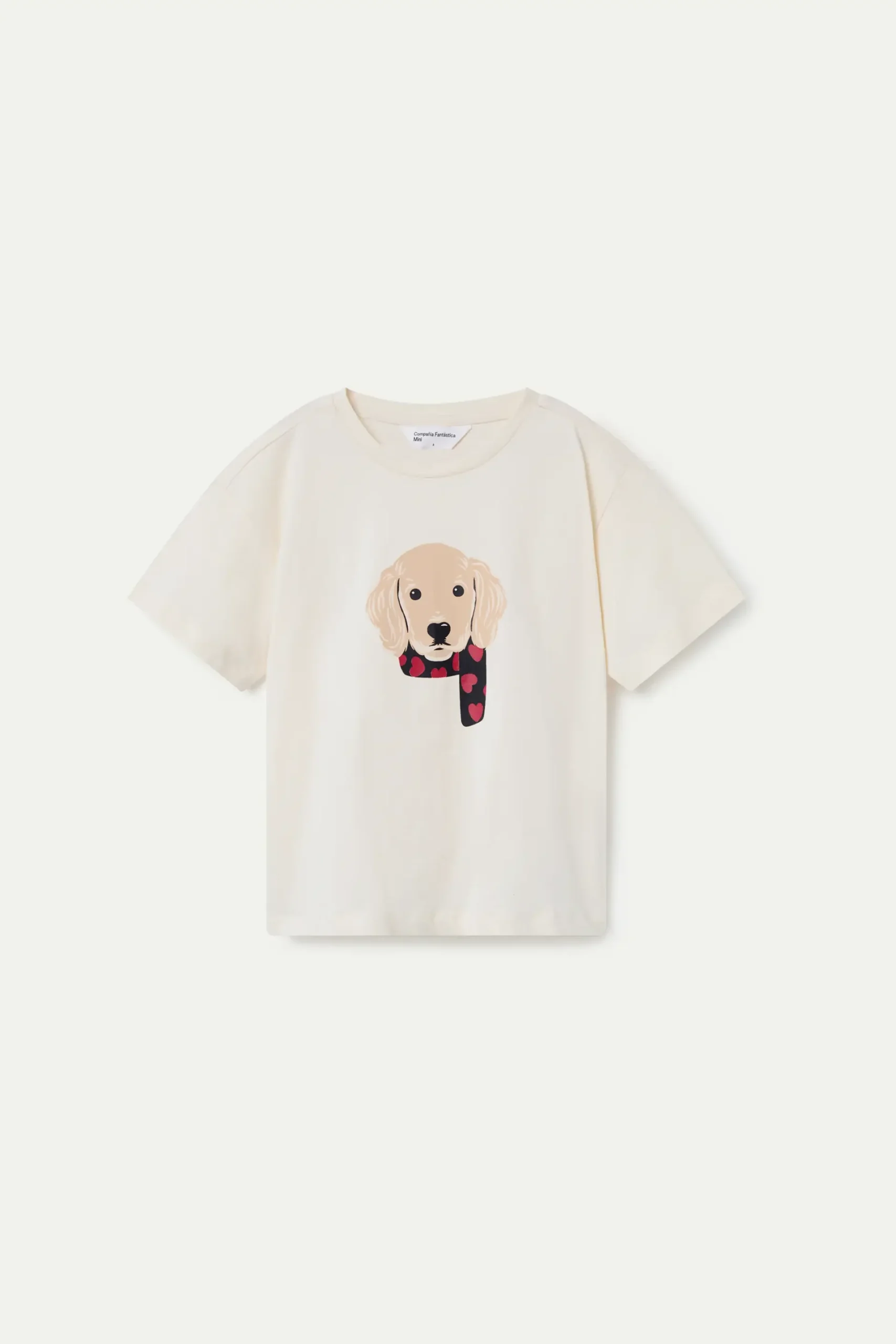 Camiseta de niña manga corta de algodón 100%. De corte recto y cuello redondo, con divertido estampado frontal de un perrito con bufanda.