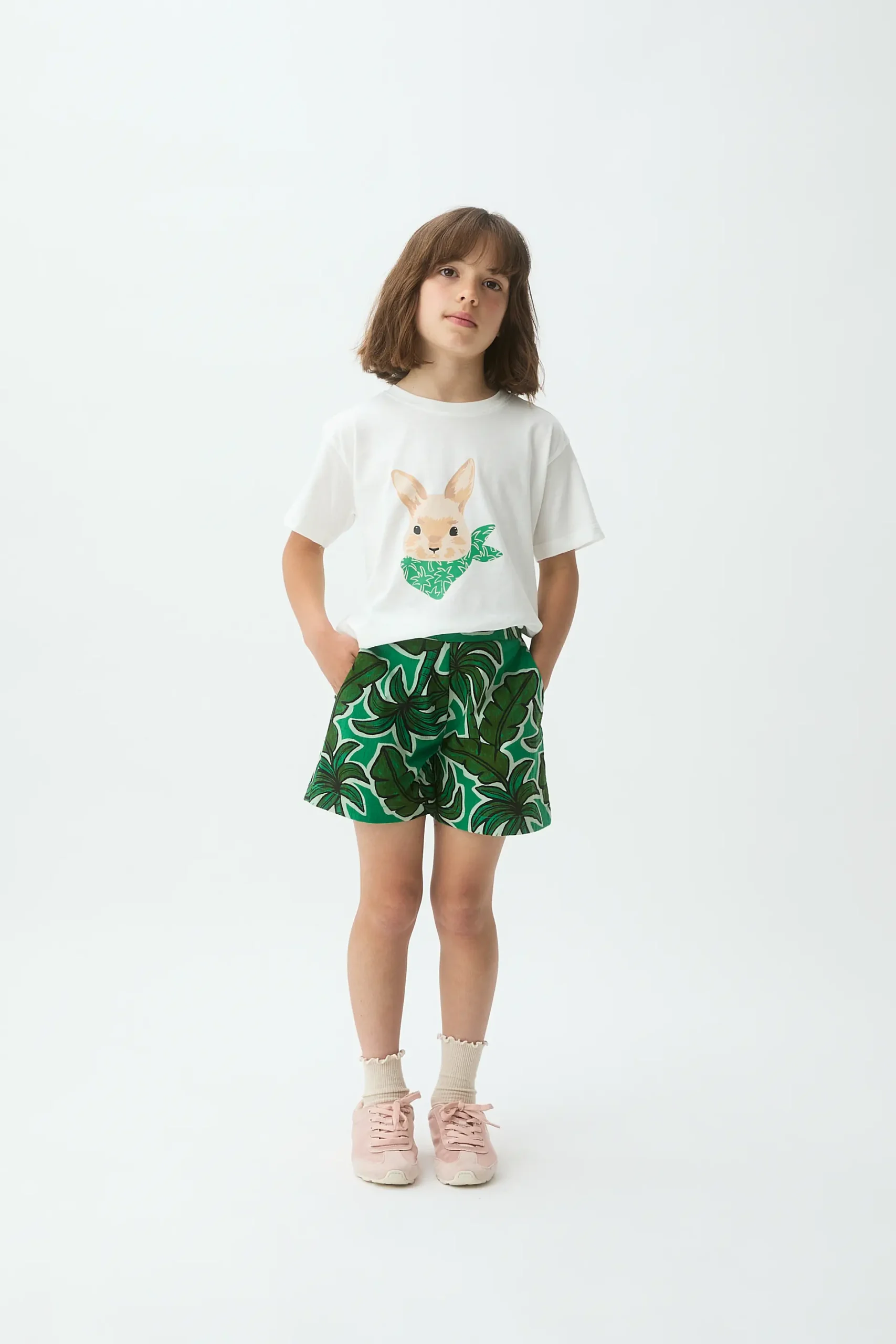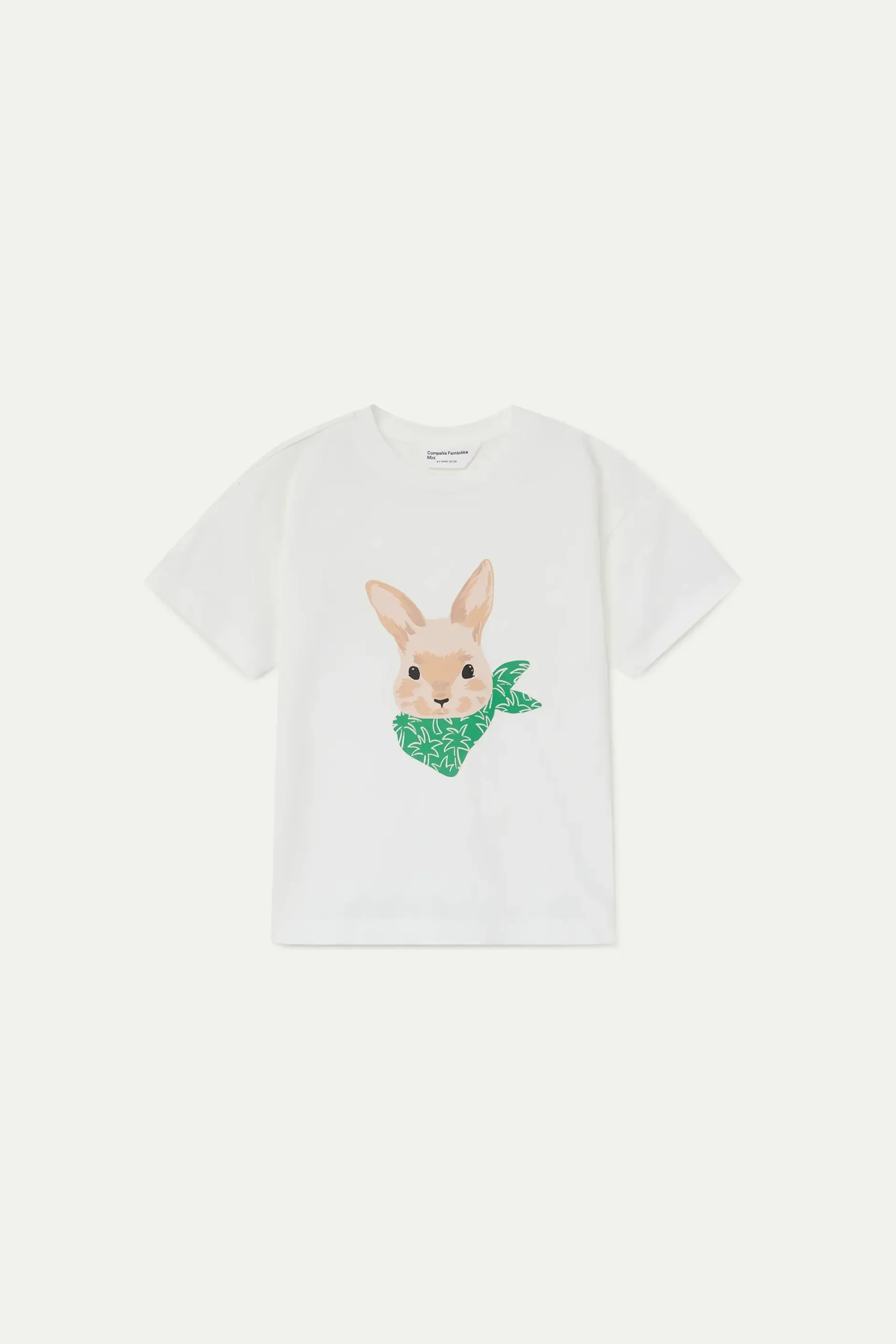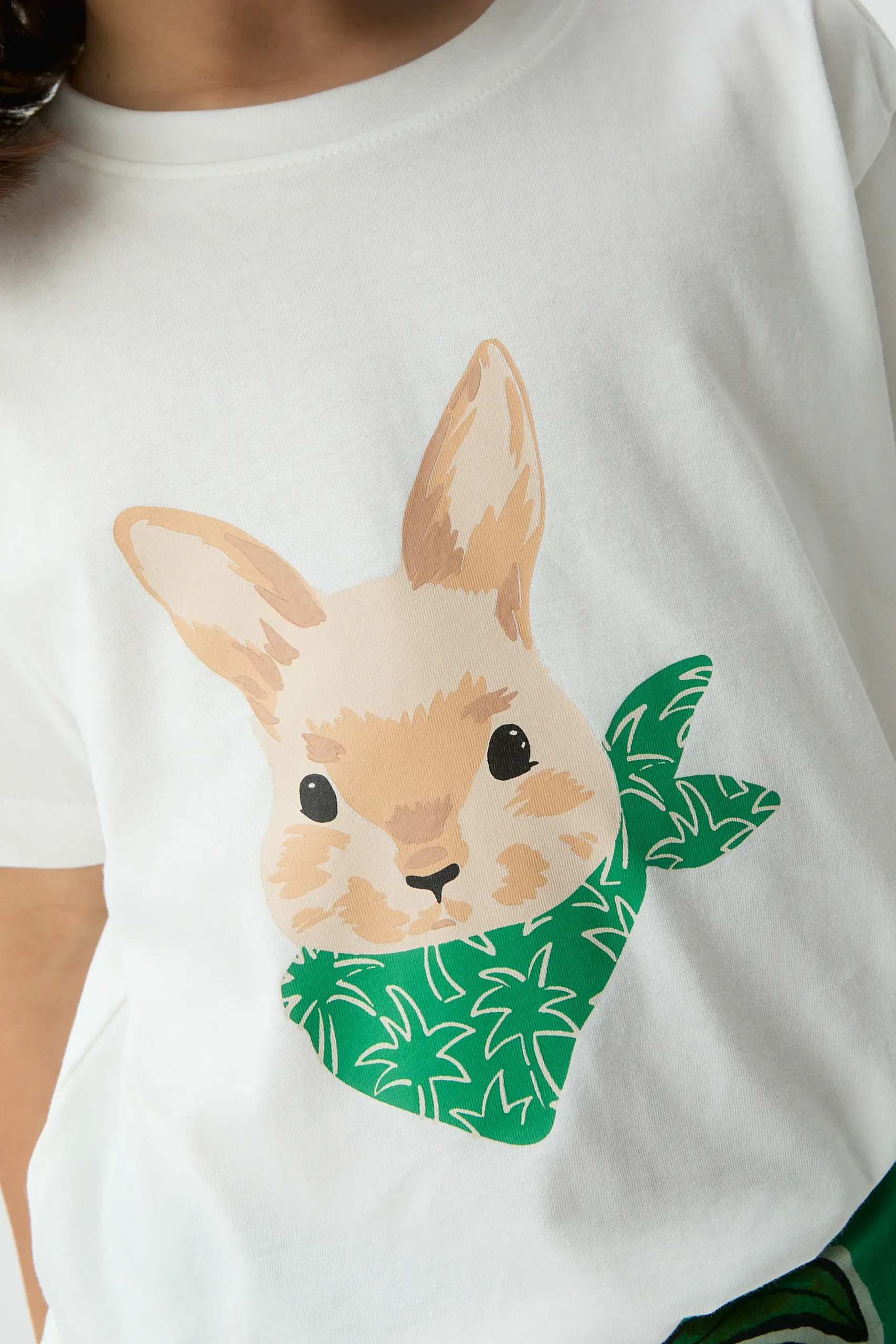 Camiseta de niña de tejido 100% algodón con estampado de conejito. Cuello redondo y manga corta. La modelo mide 127 cm y lleva la talla 8-9 años.