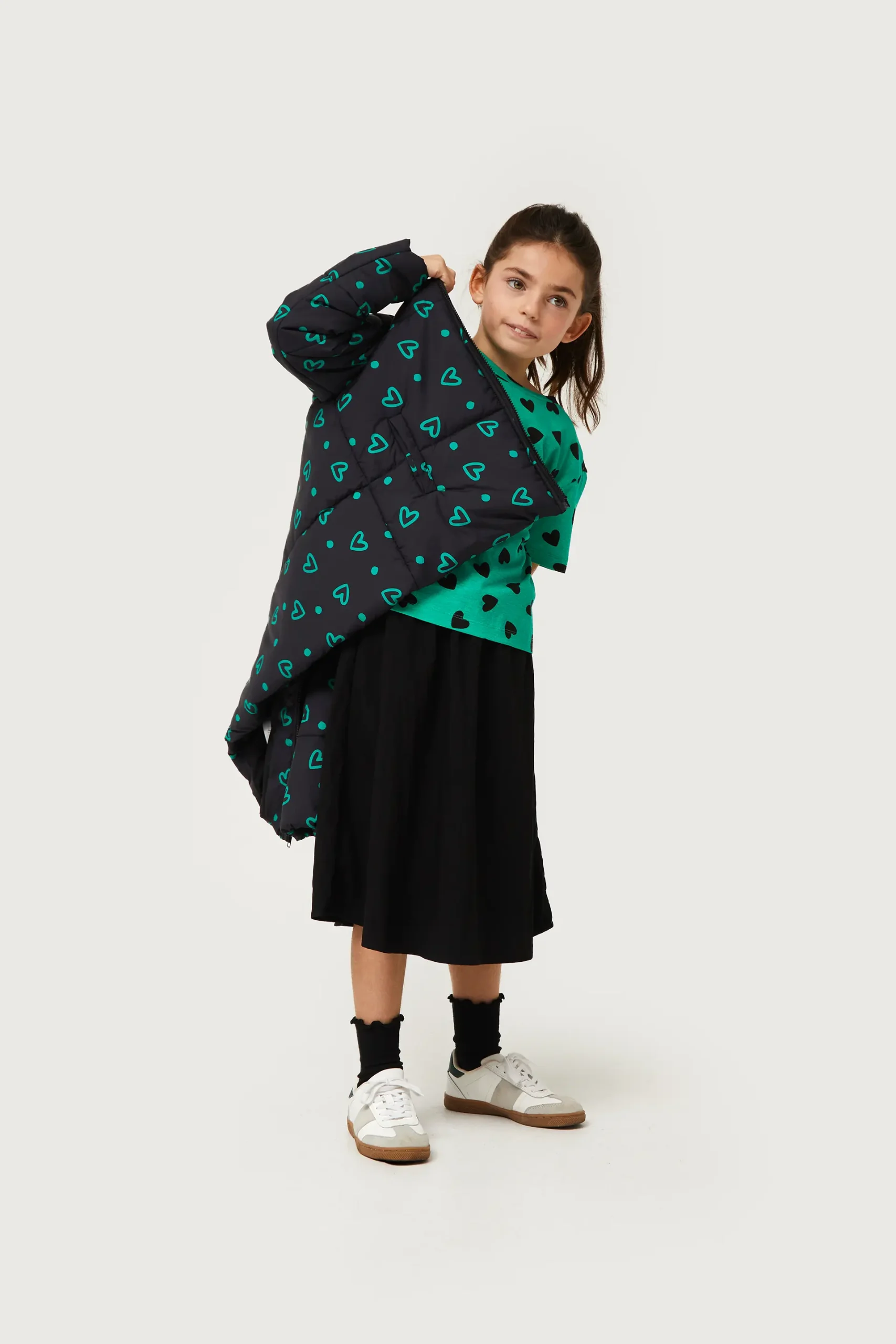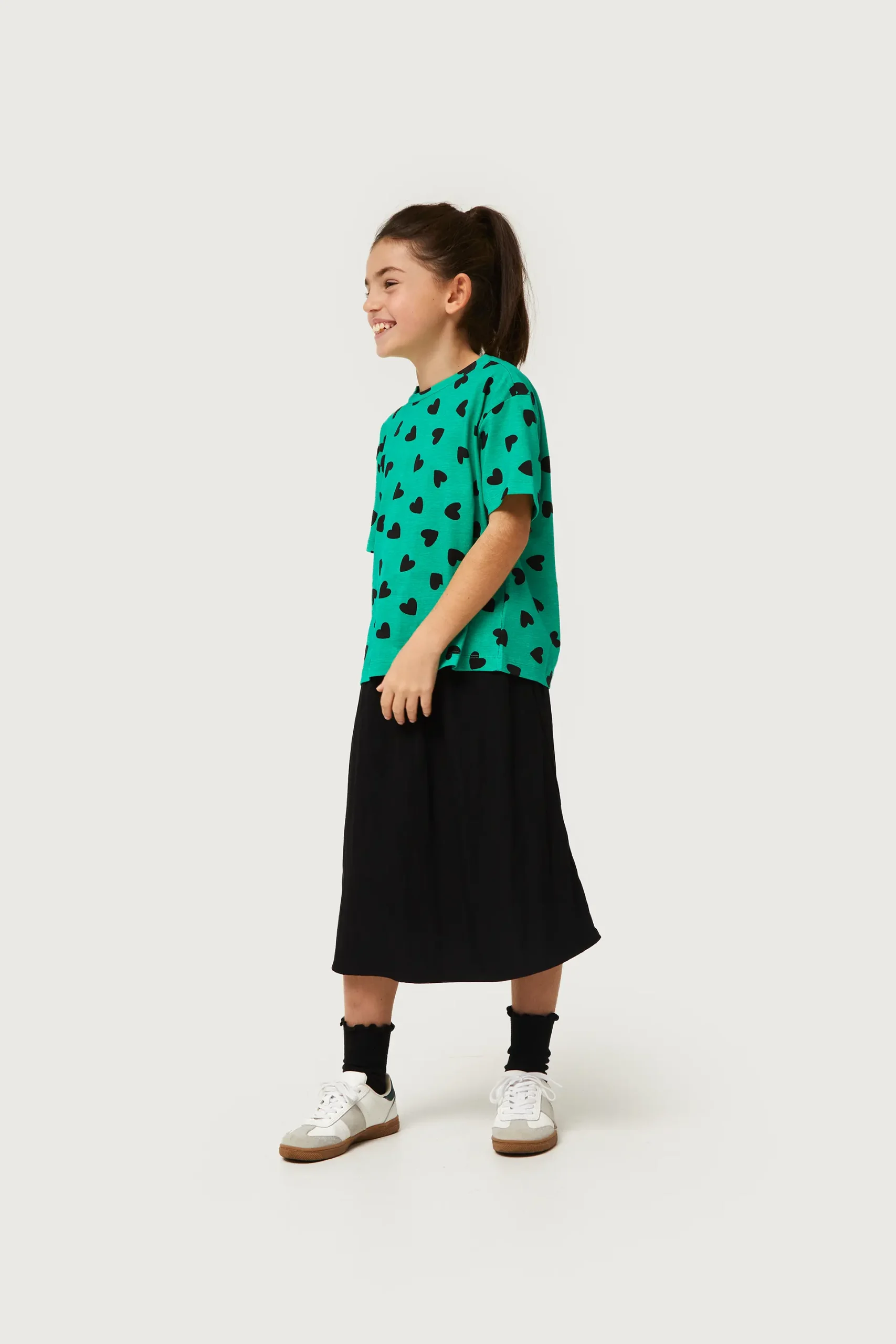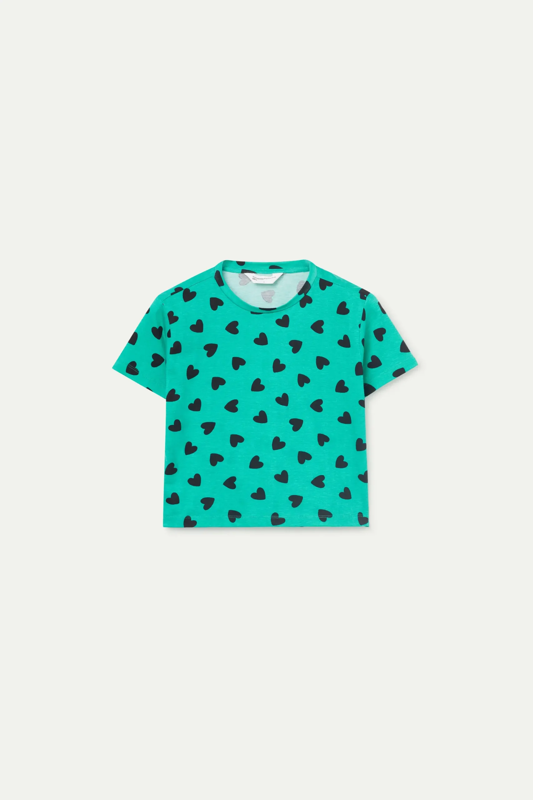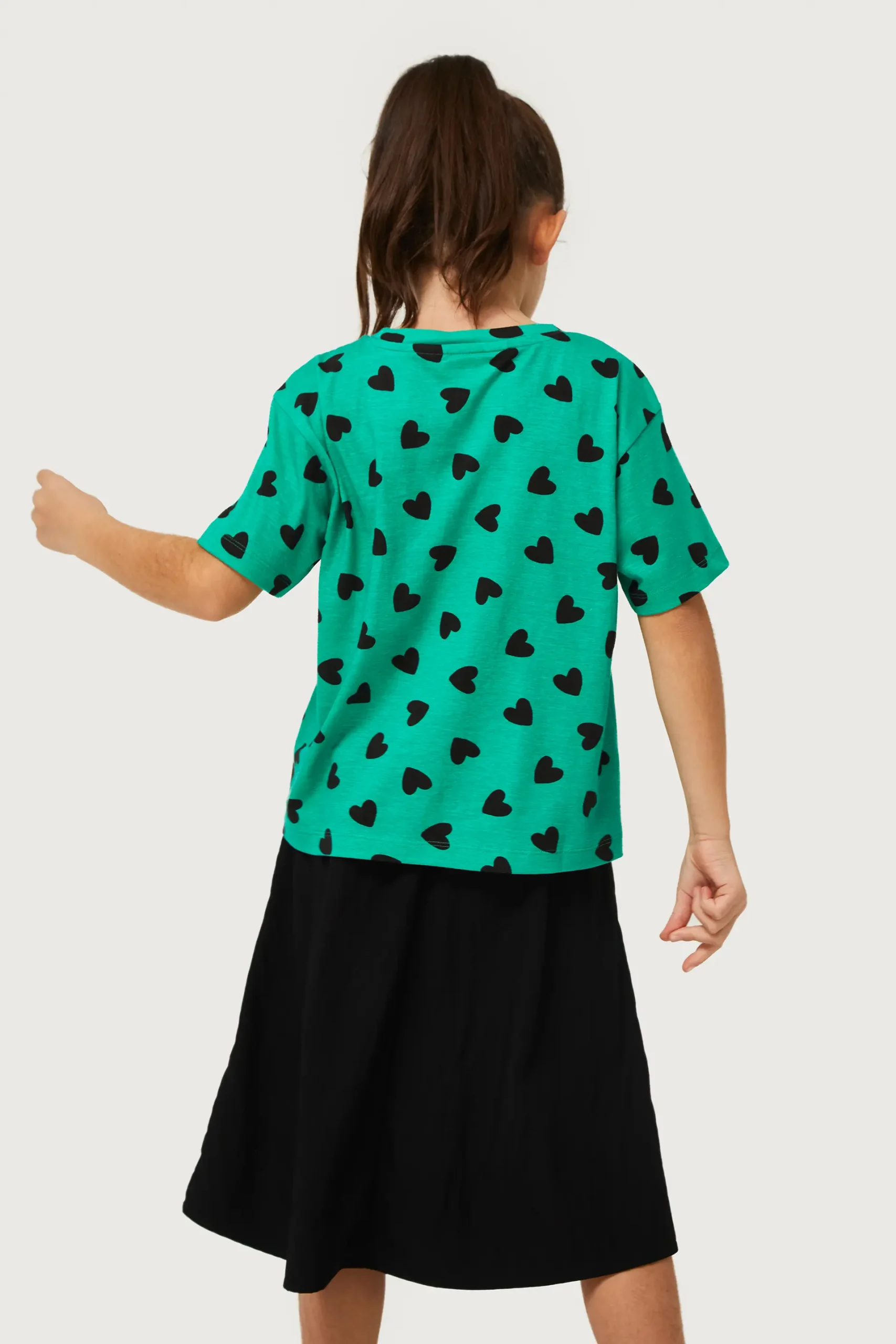 Camiseta de niña de color verde con estampado de corazones negros. Con cuello redondo y manga corta. La modelo mide 134 cm y lleva la talla 8.