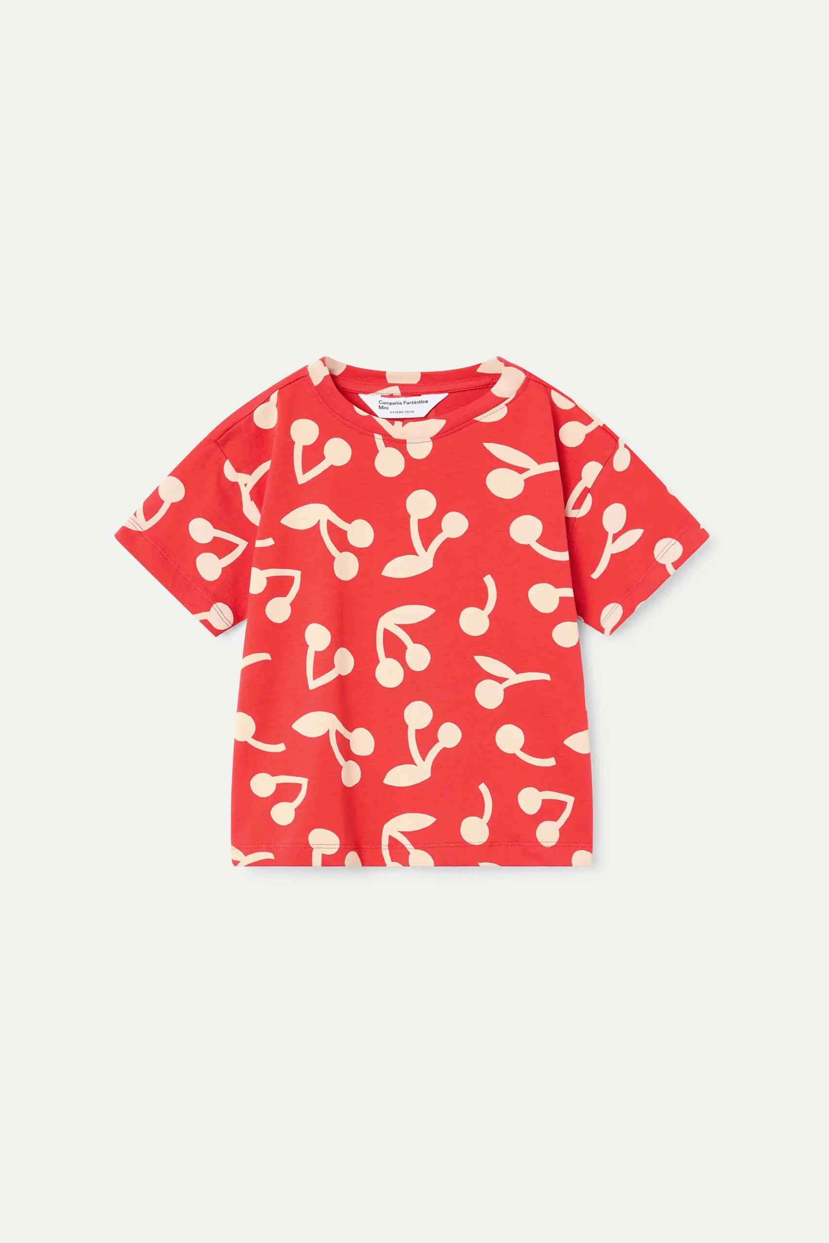 Camiseta de niña de tejido 100% algodón de color rojo con estampado de guinda. Cuello redondo y manga corta. La modelo mide 135 cm y lleva la talla 8-9 años.
