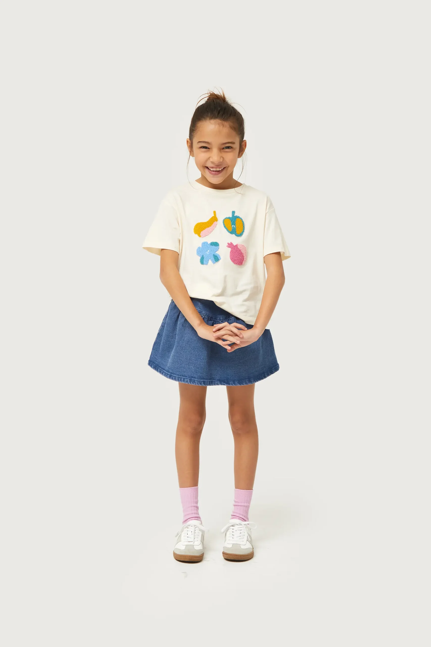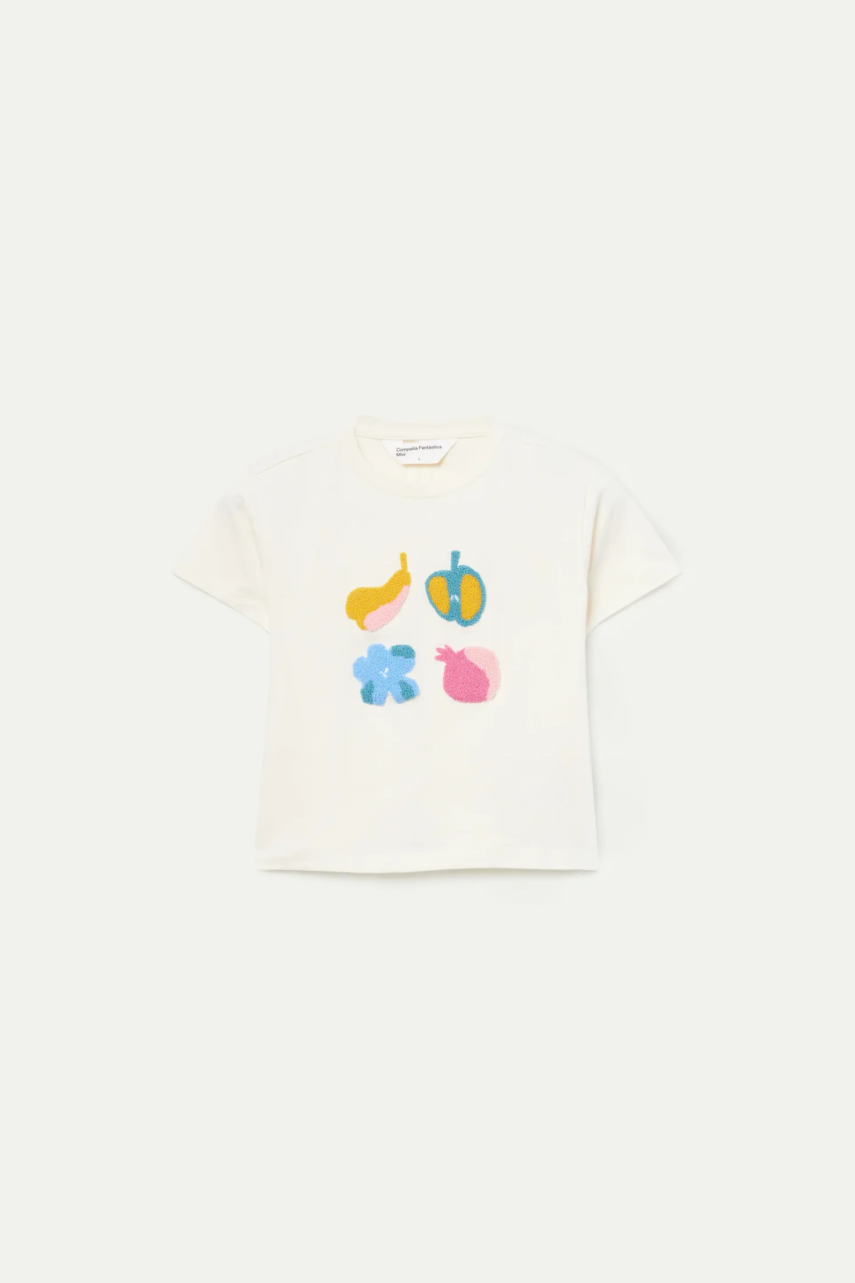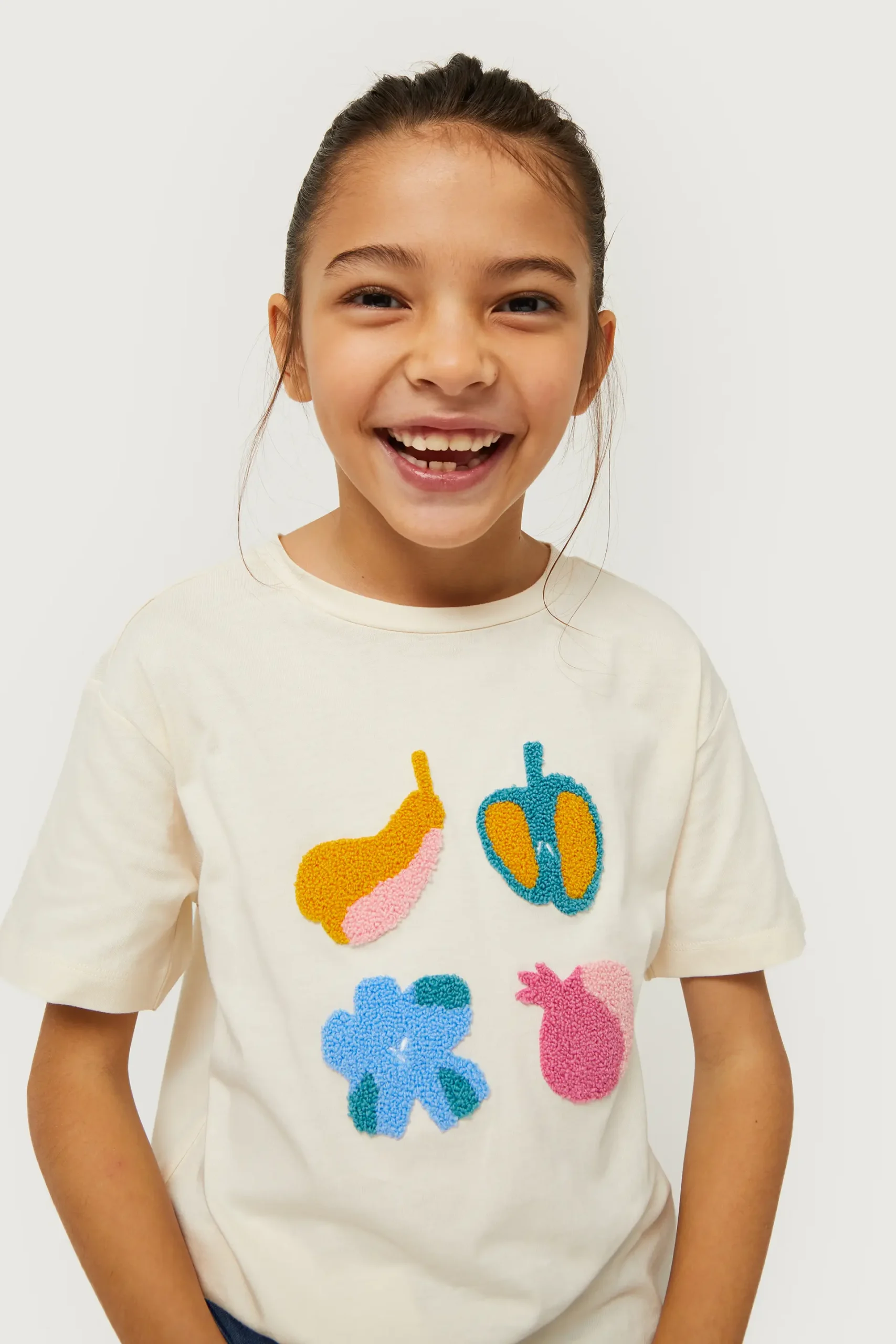 Camiseta de niña de color blanco roto con estampado gráfico de frutas con textura. Con cuello redondo y manga corta. La modelo mide 130 cm y lleva la talla 8.
