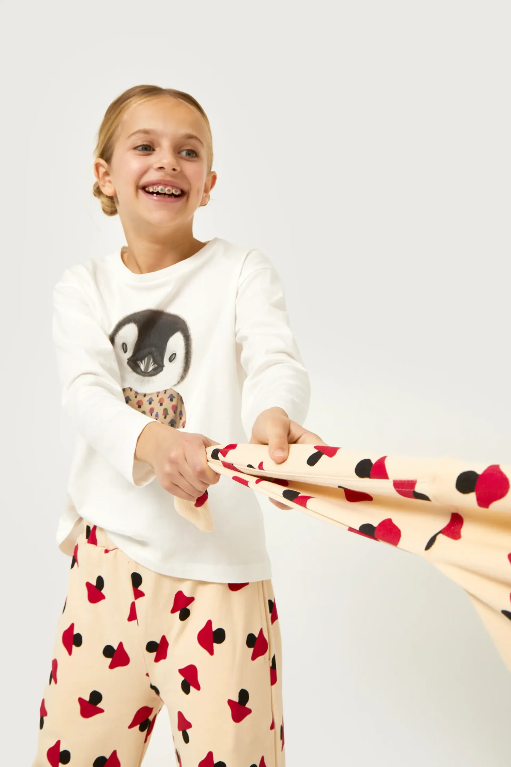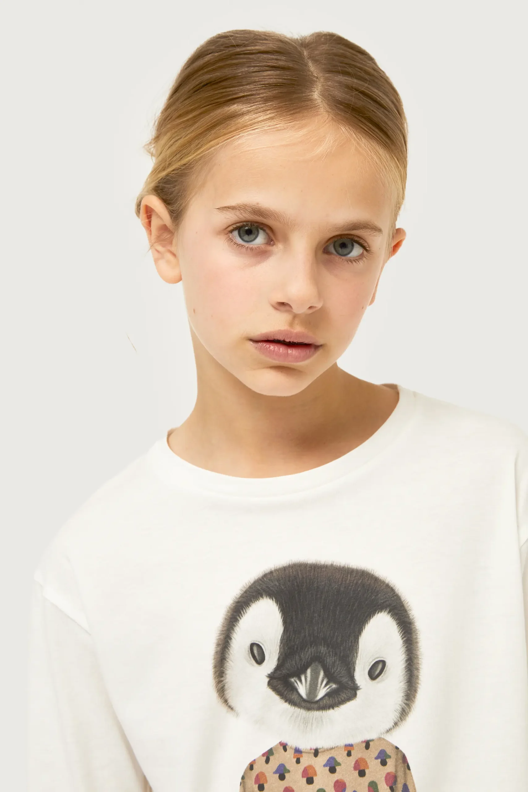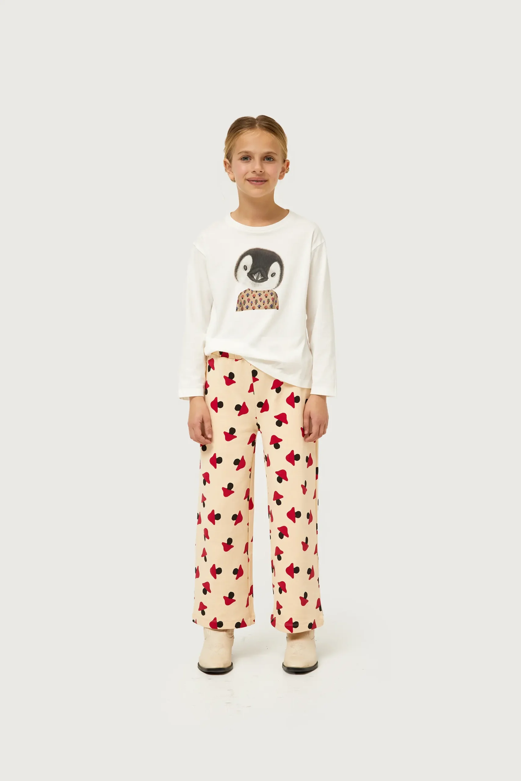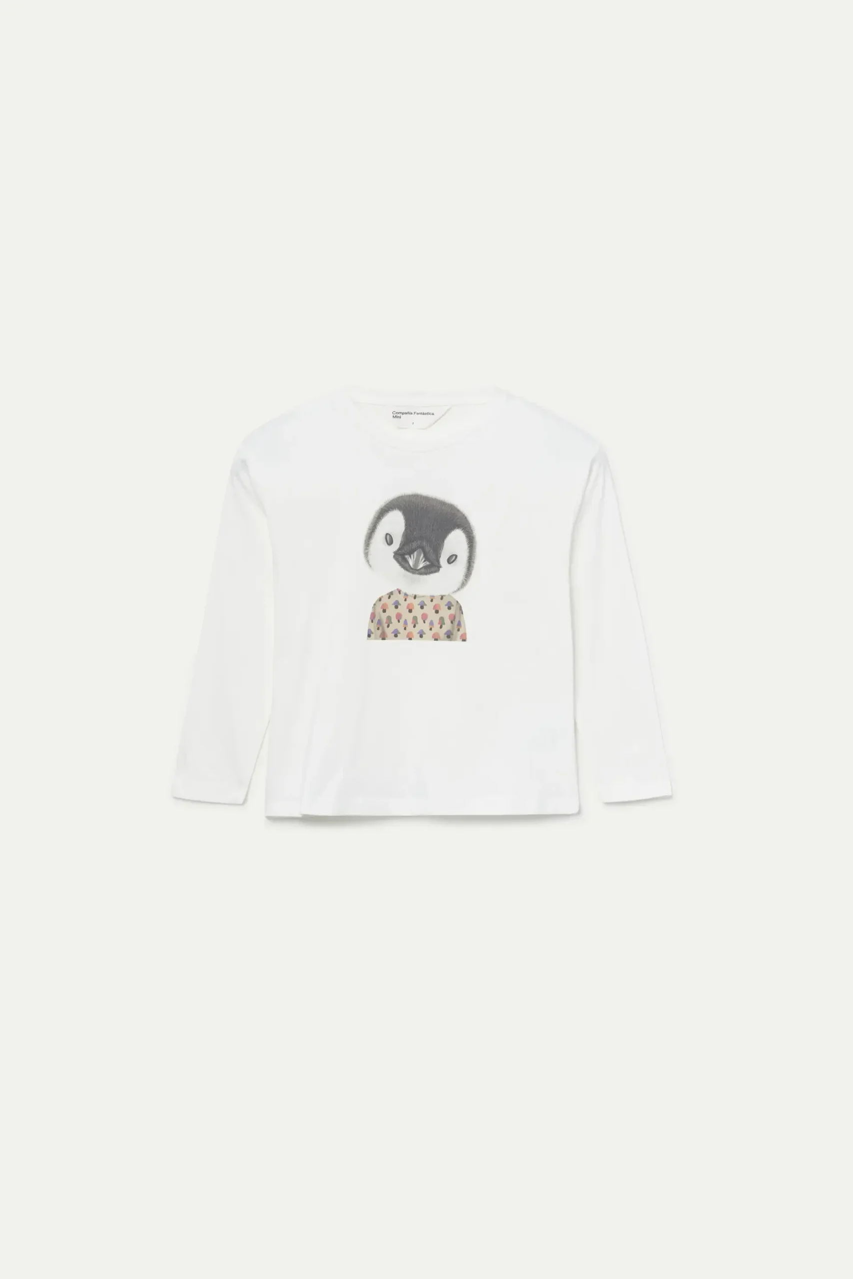 Camiseta de niña de color blanco con estampado gráfico de pingüino y estampado de setas multicolor. Con cuello redondo y manga larga. La modelo mide 137 cm y lleva la talla 8.